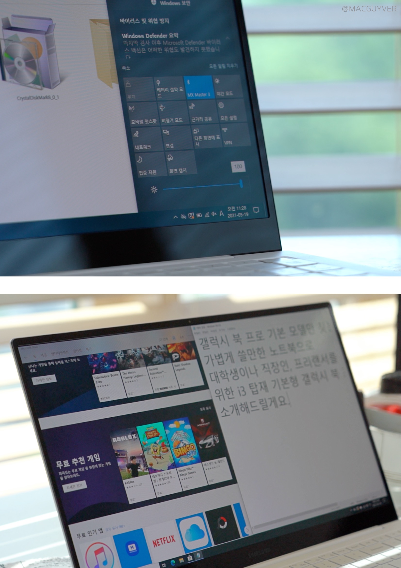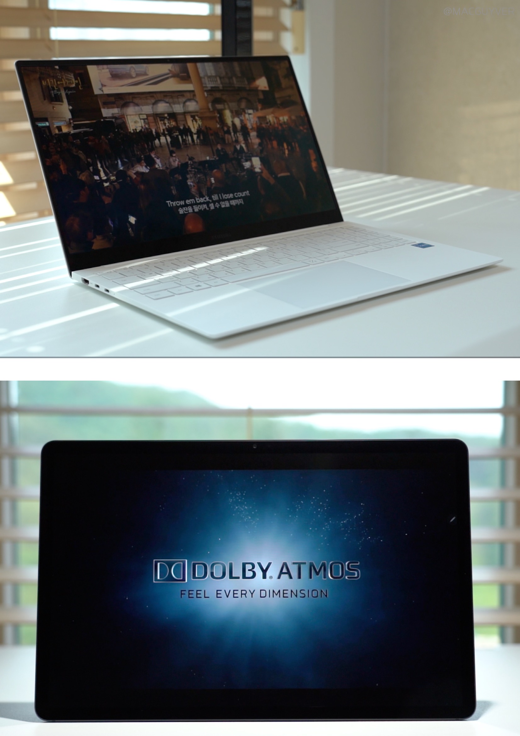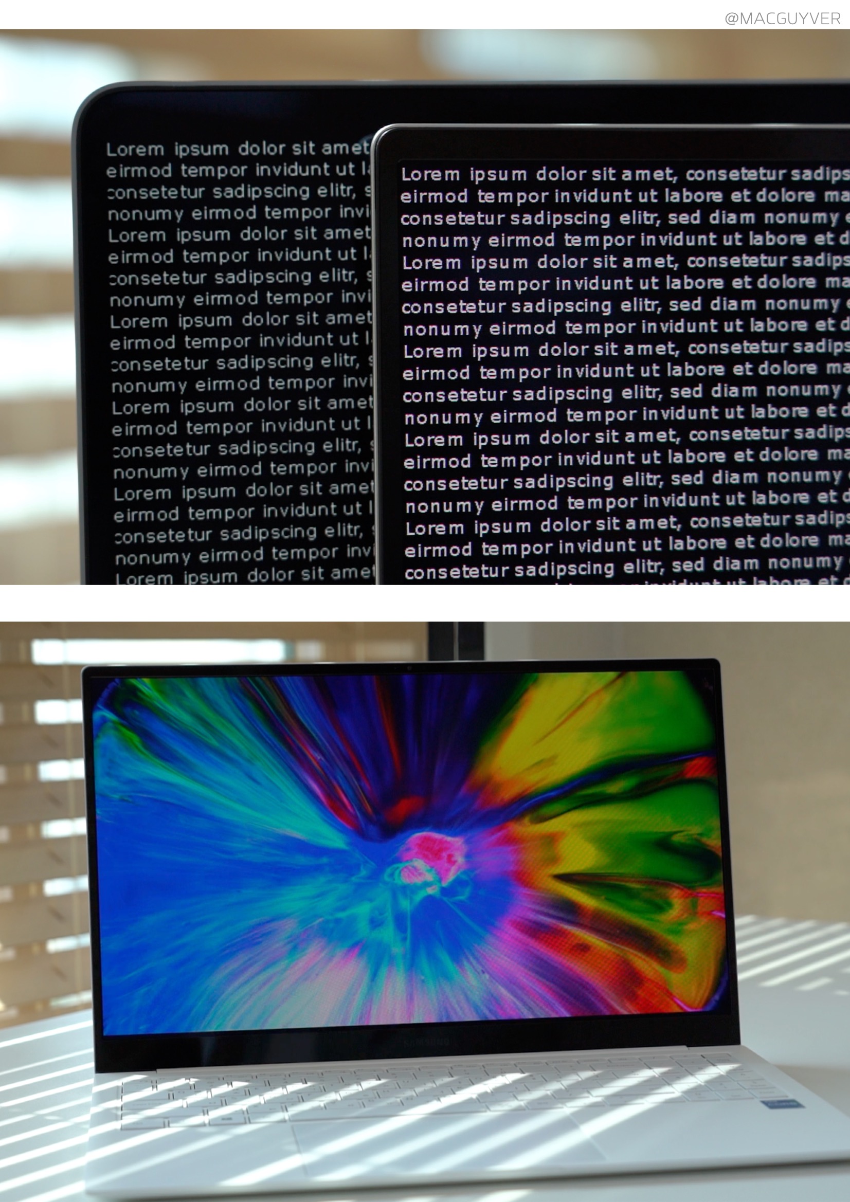 #.대학생노트북 Display 이번 갤북 프로의 특징 중 하나는 AMOLED를 탑재한 화면이죠. 기본 밝기는 괜찮은 편이고, 빛 반사나 반응 속도, 색상 표현력도 무난합니다. 사무용노트북 디스플레이 테스트를 해보니까 그라데이션도 부드럽게 표현하고, 기본 폰트도 의외로 잘 보이는데요. 번인을 예방하려는 특이한 픽셀 배열 때문인지, 아니면 FHD로 해상도가 낮아서인지 윈도우 폰트 처리는 아쉽기도 합니다. 맥북 프로 16형의 픽셀 밀도가 226ppi인데, 갤럭시북 프로는 141ppi니까 차이가 제법 나는 거죠. 대신 AMOLED 탑재로 오는 얇은 두께나, 전력 소모 개선, 블루라이트 저감 Eye-care까지 다른 부분에서는 장점이 느껴지기도 했어요. 16:9라서 16:10 비율과 비교해서 멀티태스킹이나 문서 작업은 아쉽지만 영상을 볼 때만큼은 만족스럽더라고요. 특히 어두운 곳에서 강의용노트북을 볼 때 몰입도가 상당했는데요. 개인적으로는 정말 유용했던 600nits 아웃도어 모드가 사라진 게 아쉽기도 합니다. 또 삼성이 웹캠 기능으로 보정을 강조하기는 했지만, 역광을 보정해 주고 무난하다는 점을 제외하자면 다소 거칠게 보이는 아쉬움이 있었어요.