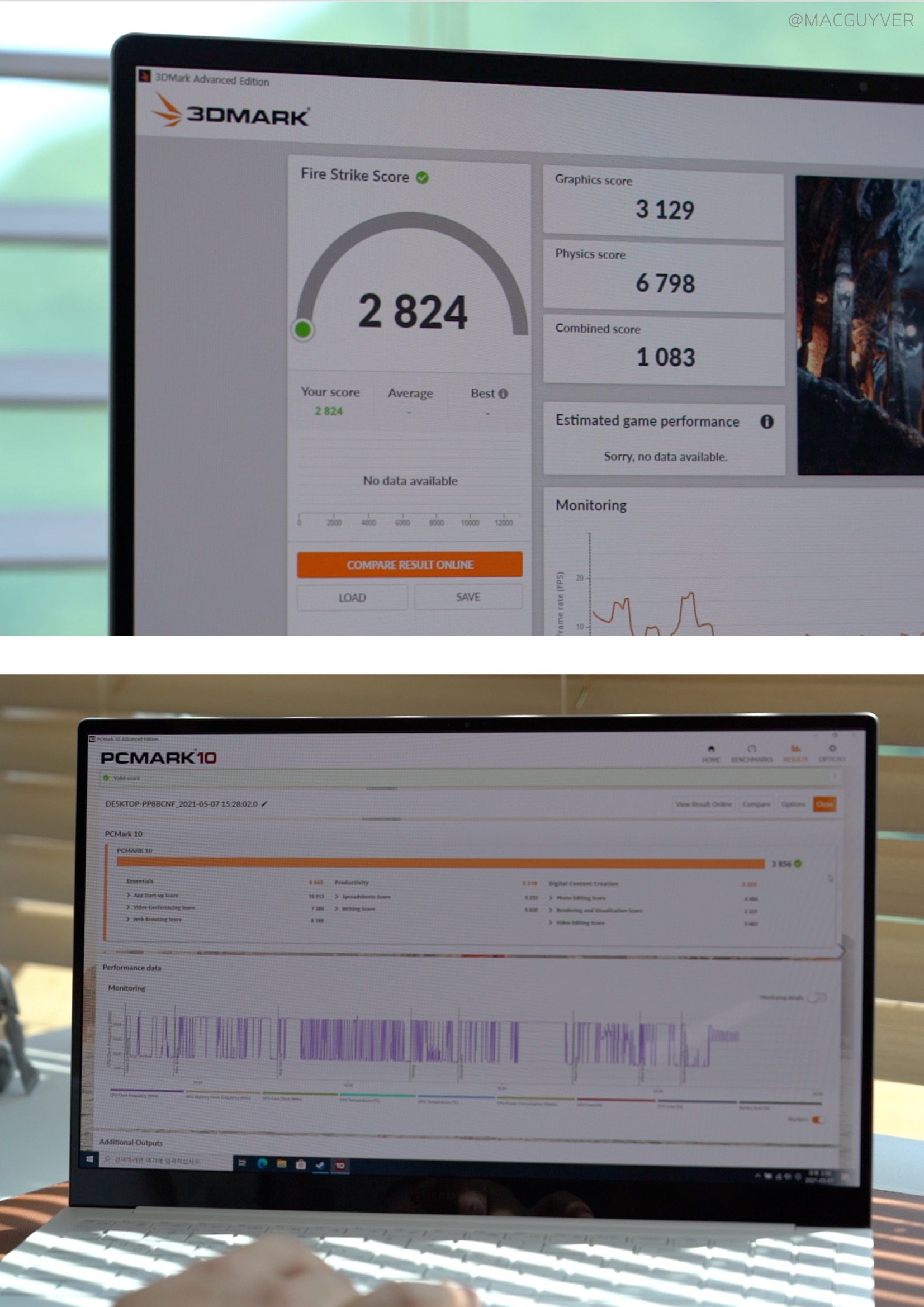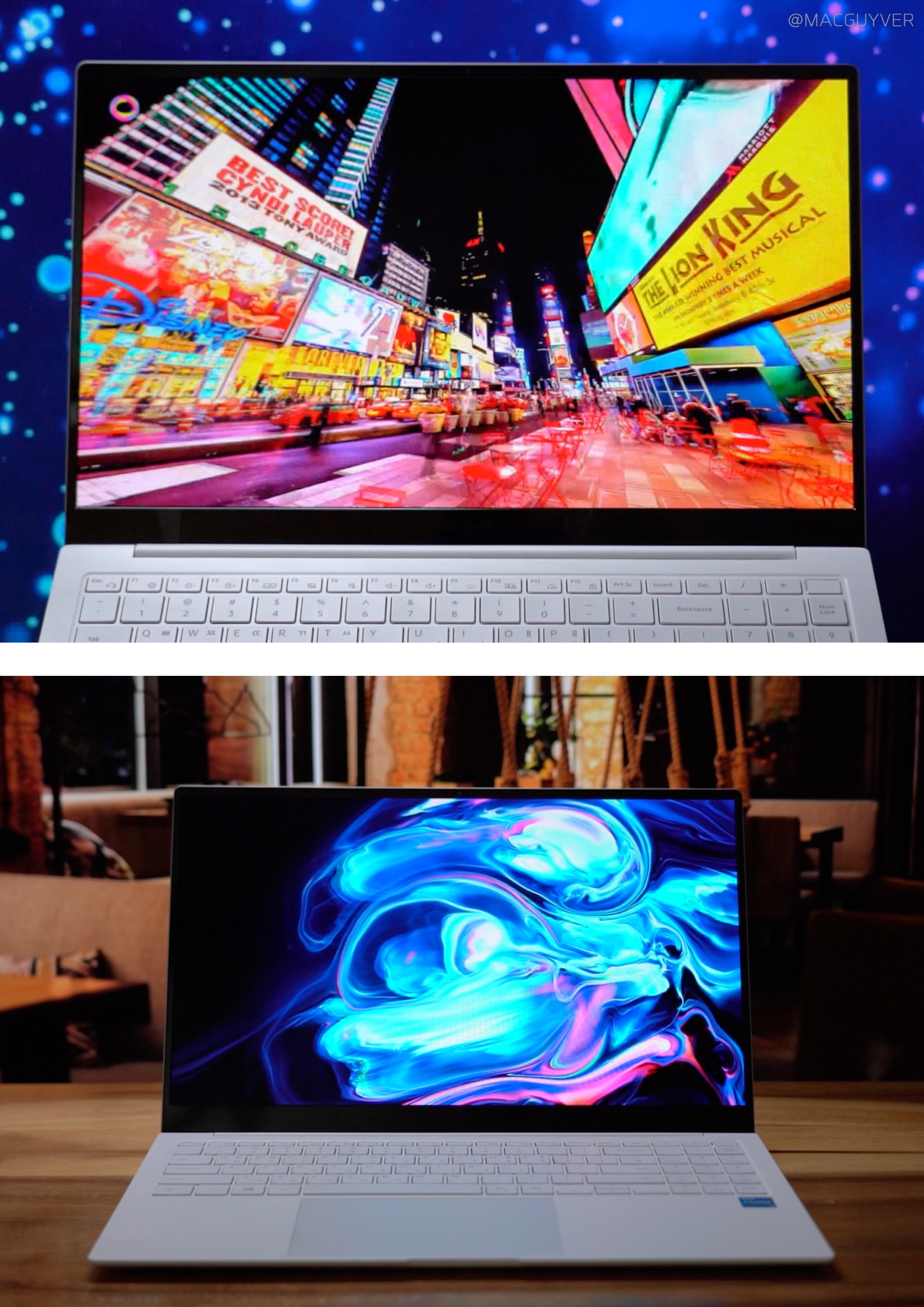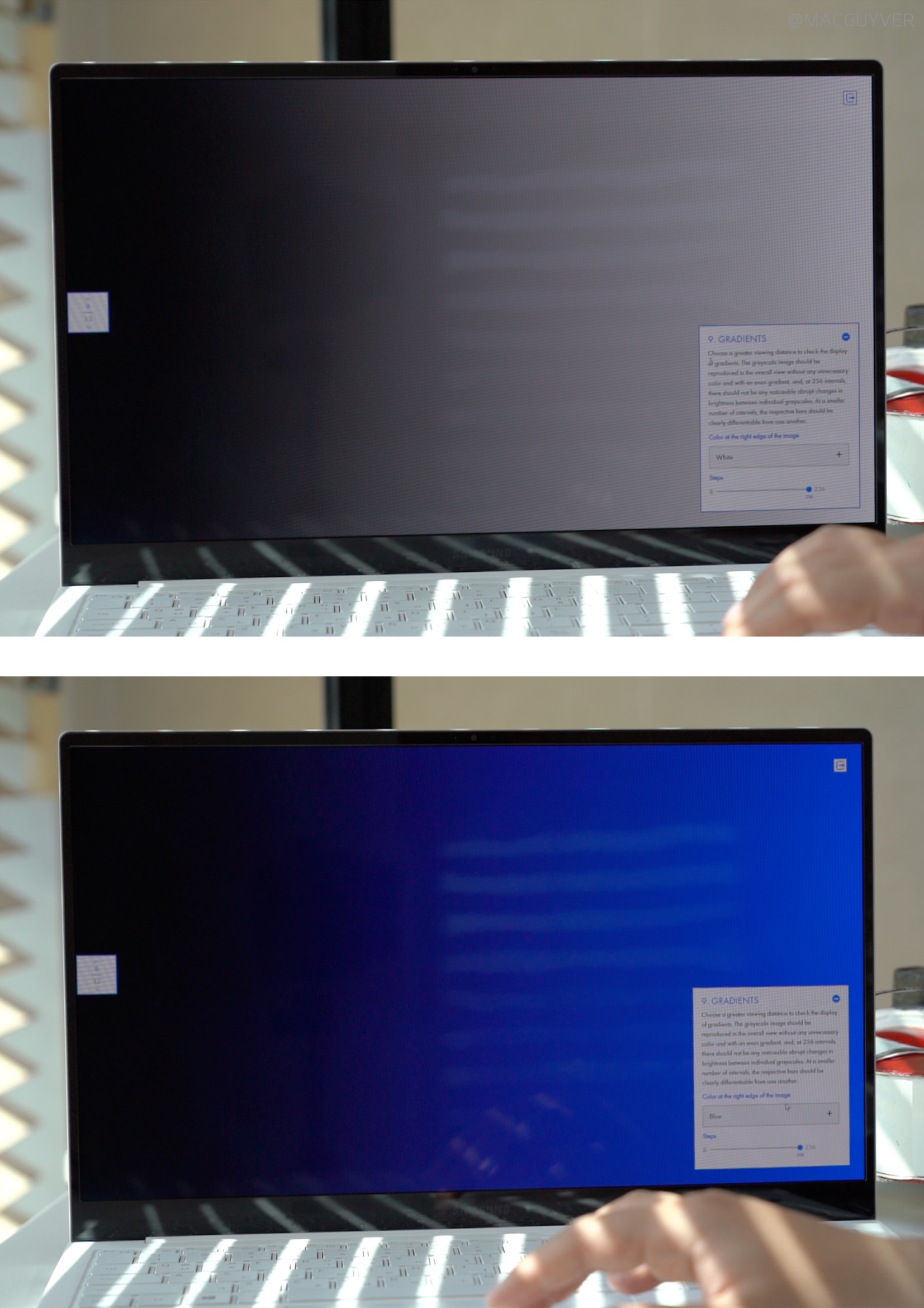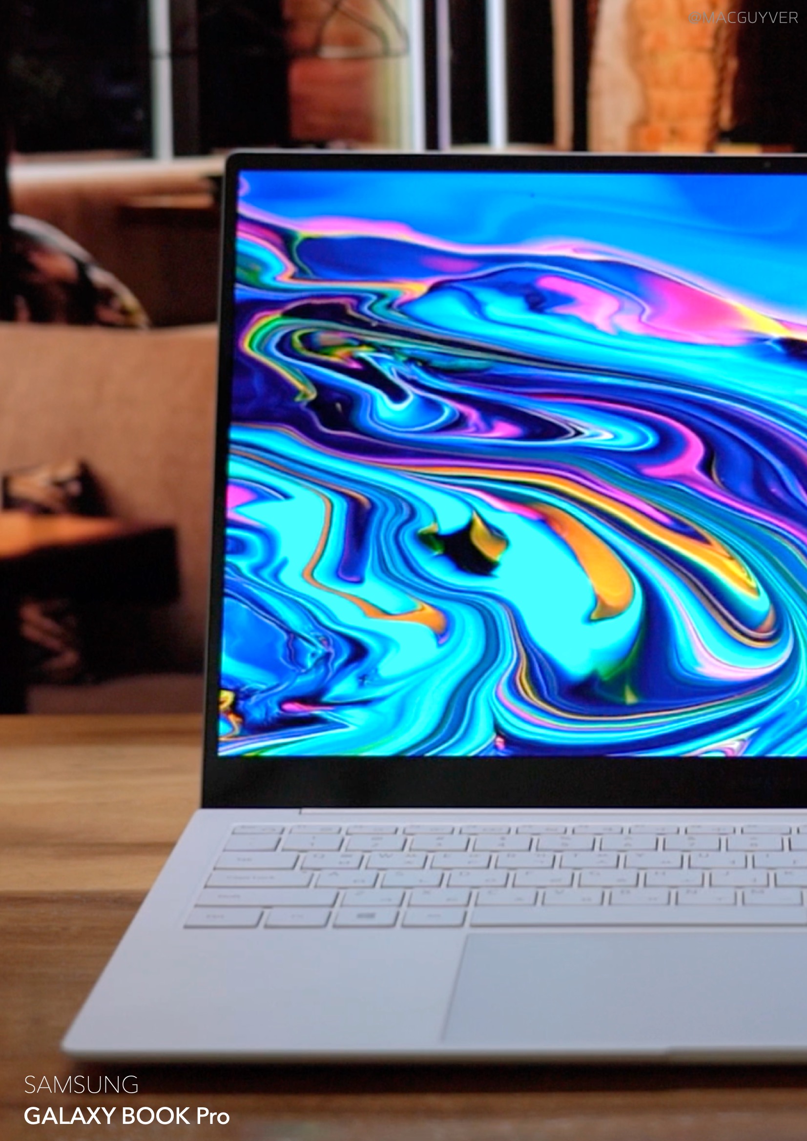 #.대학생노트북 Display 이번 갤북 프로의 특징 중 하나는 AMOLED를 탑재한 화면이죠. 기본 밝기는 괜찮은 편이고, 빛 반사나 반응 속도, 색상 표현력도 무난합니다. 사무용노트북 디스플레이 테스트를 해보니까 그라데이션도 부드럽게 표현하고, 기본 폰트도 의외로 잘 보이는데요. 번인을 예방하려는 특이한 픽셀 배열 때문인지, 아니면 FHD로 해상도가 낮아서인지 윈도우 폰트 처리는 아쉽기도 합니다. 맥북 프로 16형의 픽셀 밀도가 226ppi인데, 갤럭시북 프로는 141ppi니까 차이가 제법 나는 거죠. 대신 AMOLED 탑재로 오는 얇은 두께나, 전력 소모 개선, 블루라이트 저감 Eye-care까지 다른 부분에서는 장점이 느껴지기도 했어요. 16:9라서 16:10 비율과 비교해서 멀티태스킹이나 문서 작업은 아쉽지만 영상을 볼 때만큼은 만족스럽더라고요. 특히 어두운 곳에서 강의용노트북을 볼 때 몰입도가 상당했는데요. 개인적으로는 정말 유용했던 600nits 아웃도어 모드가 사라진 게 아쉽기도 합니다. 또 삼성이 웹캠 기능으로 보정을 강조하기는 했지만, 역광을 보정해 주고 무난하다는 점을 제외하자면 다소 거칠게 보이는 아쉬움이 있었어요.