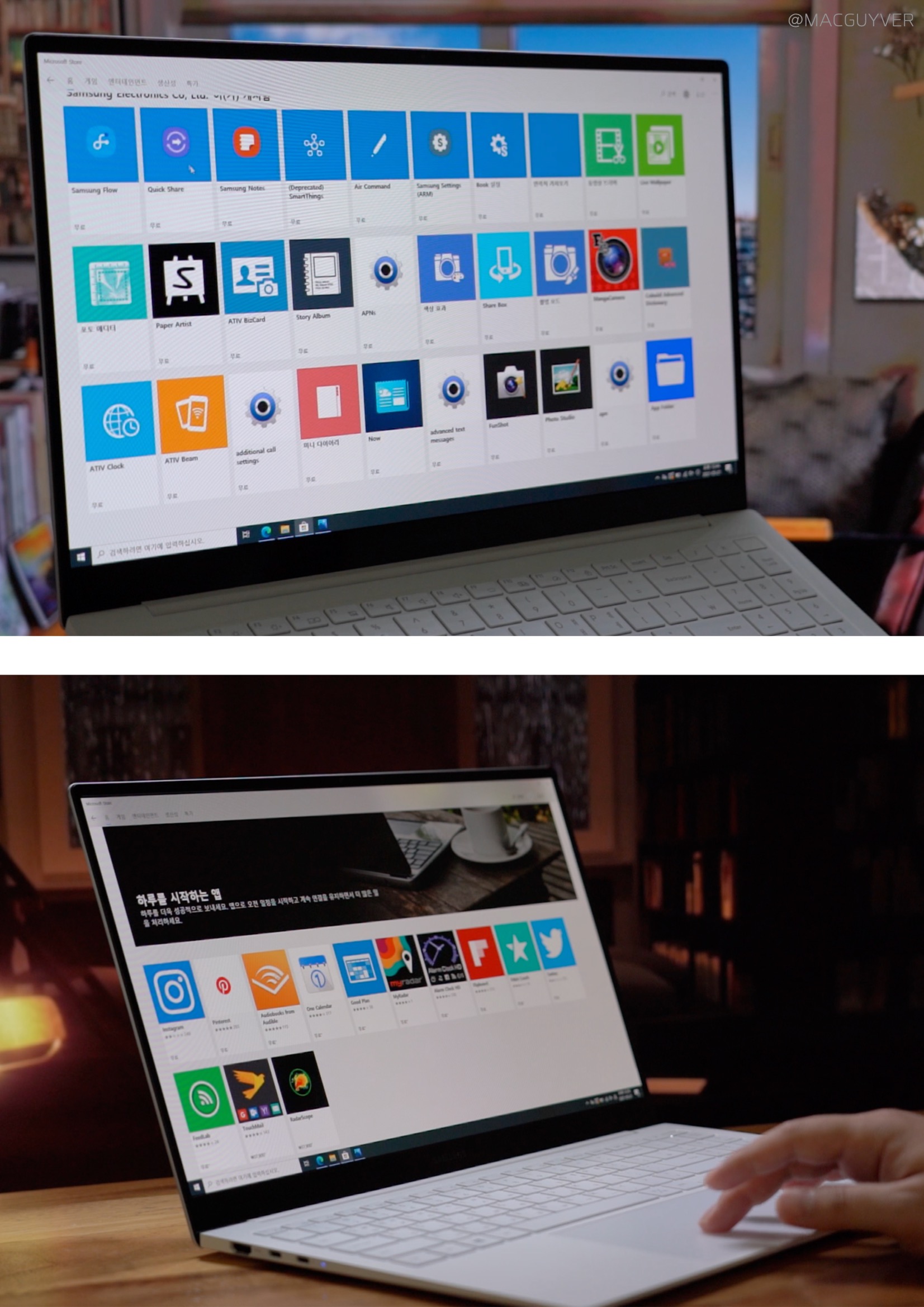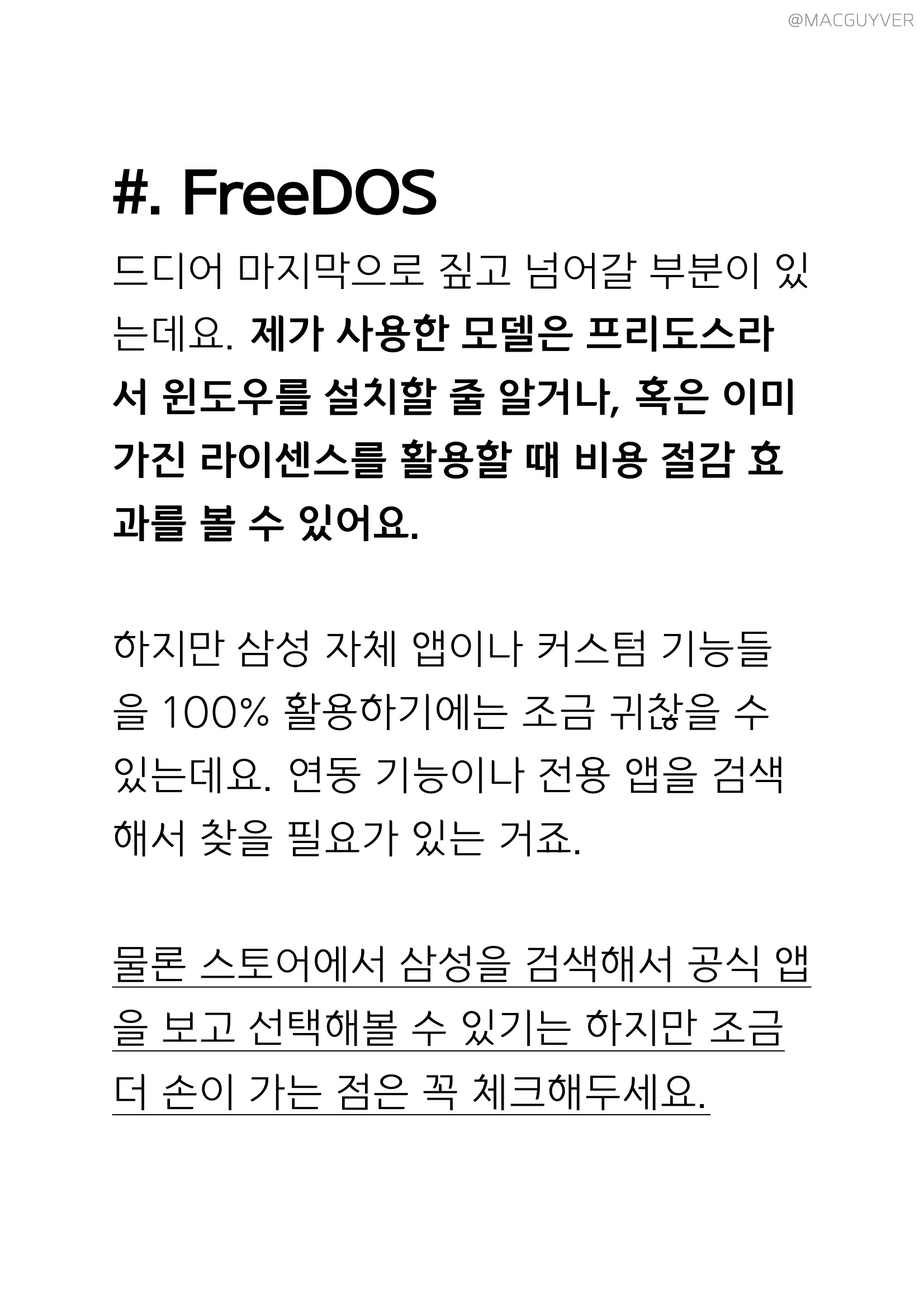 #. 사무용노트북 FreeDOS 드디어 마지막으로 짚고 넘어갈 부분이 있는데요. 제가 사용한 갤럭시북프로 모델은 프리도스라서 윈도우를 설치할 줄 알거나, 혹은 이미 가진 라이센스를 활용할 때 비용 절감 효과를 볼 수 있어요. 하지만 삼성 자체 앱이나 커스텀 기능들을 100% 활용하기에는 조금 귀찮을 수 있는데요. 연동 기능이나 전용앱을 검색해서 찾을 필요가 있는 거죠. 물론 스토어에서 삼성을 검색해서 공식 앱을 보고 선택해볼 수 있기는 하지만 조금 더 손이 가는 점은 꼭 체크해두세요.