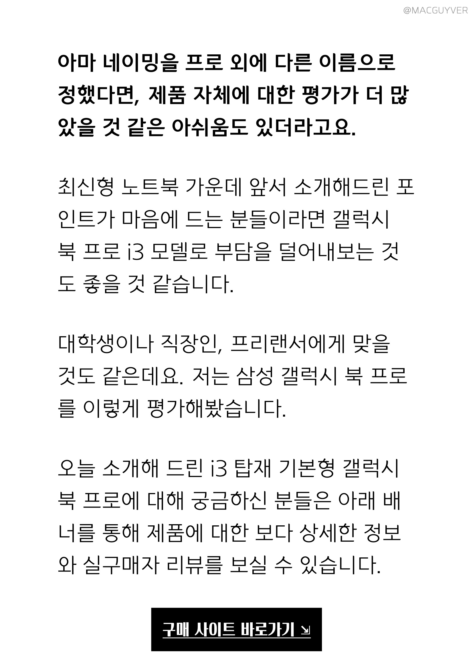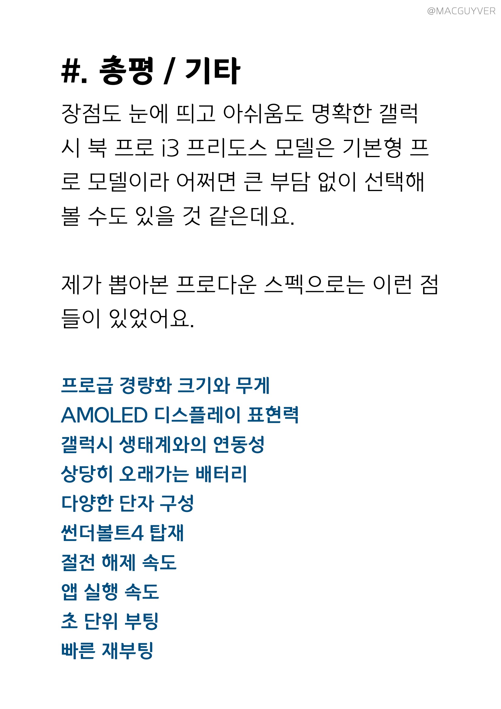 #. 갤럭시북프로 총평 / 기타 장점도 눈에 띄고 아쉬움도 명확한 갤럭시 북 프로 i3 프리도스 모델은 기본형 프로 모델이라 어쩌면 큰 부담 없이 선택해볼 수도 있을 것 같은데요. 제가 뽑아본 프로다운 스펙으로는 이런 점들이 있었어요. 노트북추천 프로급 경량화 크기와 무게 AMOLED 디스플레이 표현력 갤럭시 생태계와의 연동성 상당히 오래가는 배터리 다양한 단자 구성 썬더볼트4 탑재 절전 해제 속도 앱 실행 속도 초 단위 부팅 빠른 재부팅 아마 네이밍을 프로 외에 다른 이름으로 정했다면, 제품 자체에 대한 평가가 더 많았을 것 같은 아쉬움도 있더라고요. 최신형 노트북 가운데 앞서 소개해드린 포인트가 마음에 드는 분들이라면 갤럭시 북 프로 i3 모델로 부담을 덜어내보는 것도 좋을 것 같습니다. 대학생이나 직장인, 프리랜서에게 대학생노트북, 직장인노트북, 사무용노트북, 강의용노트북, 비즈니스노트북으로 맞을 것도 같은데요. 저는 삼성 갤럭시 북 프로를 이렇게 평가해봤습니다. 오늘 소개해 드린 i3 탑재 기본형 갤럭시 북 프로에 대해 궁금하신 분들은 아래 배너를 통해 제품에 대한 보다 상세한 정보와 실구매자 리뷰를 보실 수 있습니다.