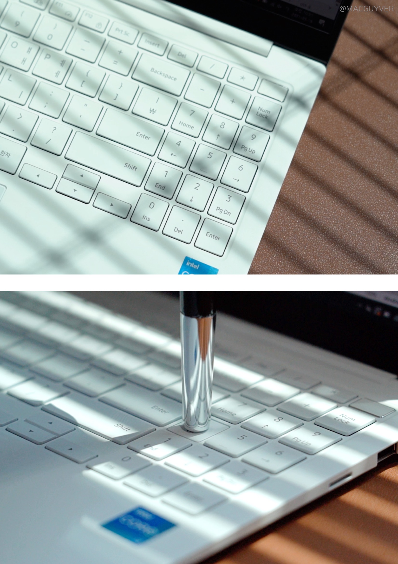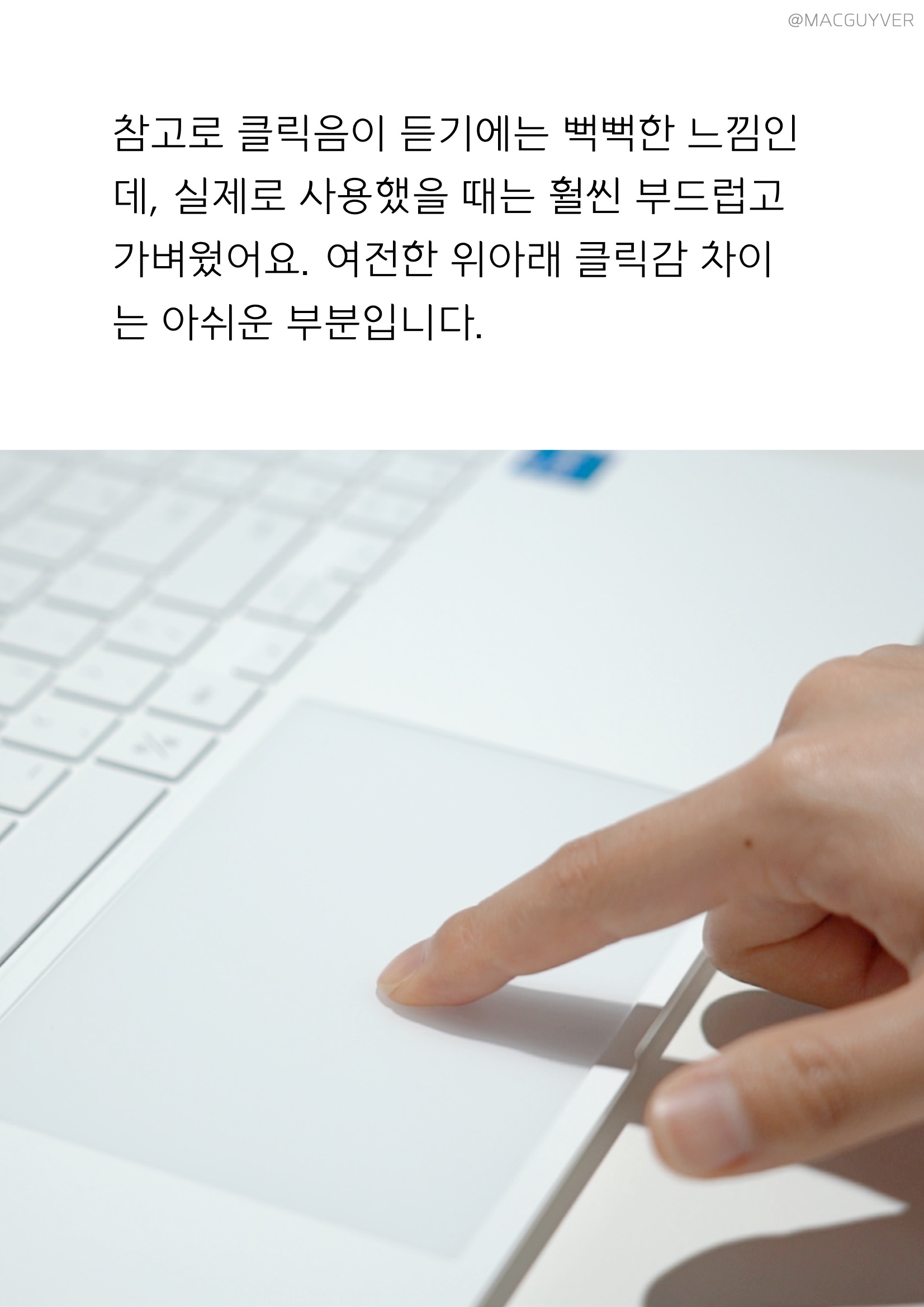 #. 대학생노트북 Key + Pad 호불호가 명확한 키보드는 가벼운 플라스틱 느낌의 키 소음이 아쉽고, 키스트로크는 얕은 느낌인데 이온2보다는 나아졌다는 평가도 많더라고요. 키 간격이 적당한 데다 큼지막해서 오타율이 낮고, 오른쪽 시프트키가 원래의 모습을 되찾아서 사용이 편리하기도 합니다. 물론 장시간 타이핑을 하다 보면 손가락에 부담이 가기도 하고, 다른 키보드보다는 얕은 느낌이라 처음에는 적응이 필요한 키보드가 아닐까 싶은데요. 훨씬 커진 터치패드는 부들부들하고 널찍한 것도 좋고, 디자인이나 컬러 일체감도 깔끔해서 좋았어요. 참고로 비즈니스노트북 클릭음이 듣기에는 뻑뻑한 느낌이 드는데, 실제로 사용했을 때는 훨씬 부드럽고 가벼웠는데요. 여전한 위아래 클릭감 차이는 아쉬운 부분입니다.