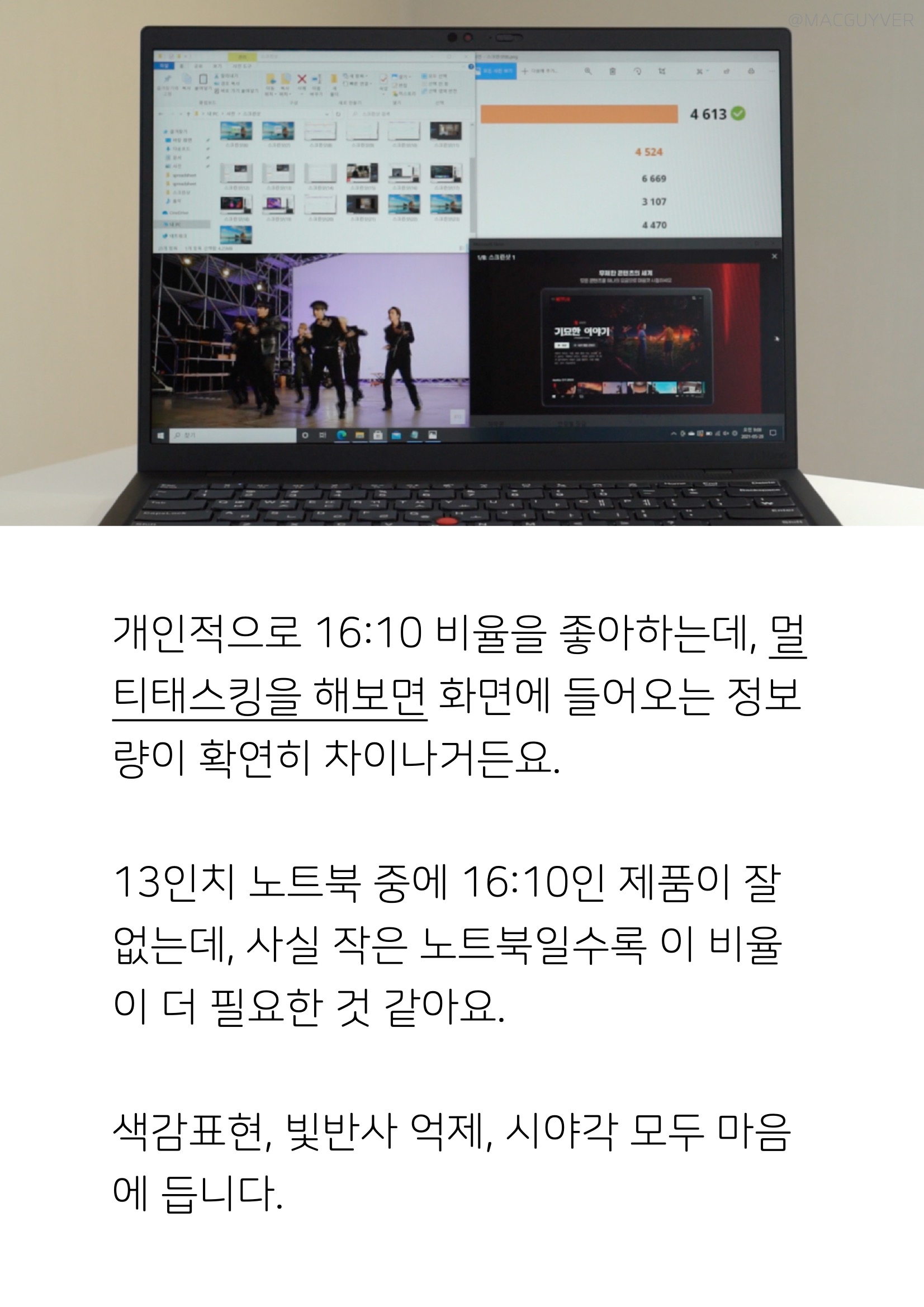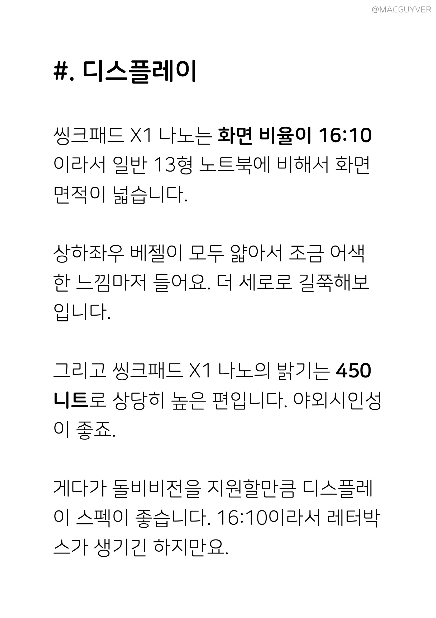 #. 디스플레이 씽크패드 X1 나노는 화면 비율이 16:10이라서 일반 13형 노트북에 비해서 화면 면적이 넓습니다. 상하좌우 베젤이 모두 얇아서 조금 어색한 느낌마저 들어요. 더 세로로 길쭉해보입니다. 그리고 씽크패드 X1 나노의 밝기는 450니트로 상당히 높은 편입니다. 야외시인성이 좋죠. 게다가 돌비비전을 지원할만큼 디스플레이 스펙이 좋습니다. 16:10이라서 레터박스가 생기긴 하지만요. 개인적으로 16:10 비율을 좋아하는데, 멀티태스킹을 해보면 화면에 들어오는 정보량이 확연히 차이나거든요. 13인치 노트북 중에 16:10인 제품이 잘 없는데, 사실 작은 노트북일수록 이 비율이 더 필요한 것 같아요. 색감표현, 빛반사 억제, 시야각 모두 마음에 듭니다.