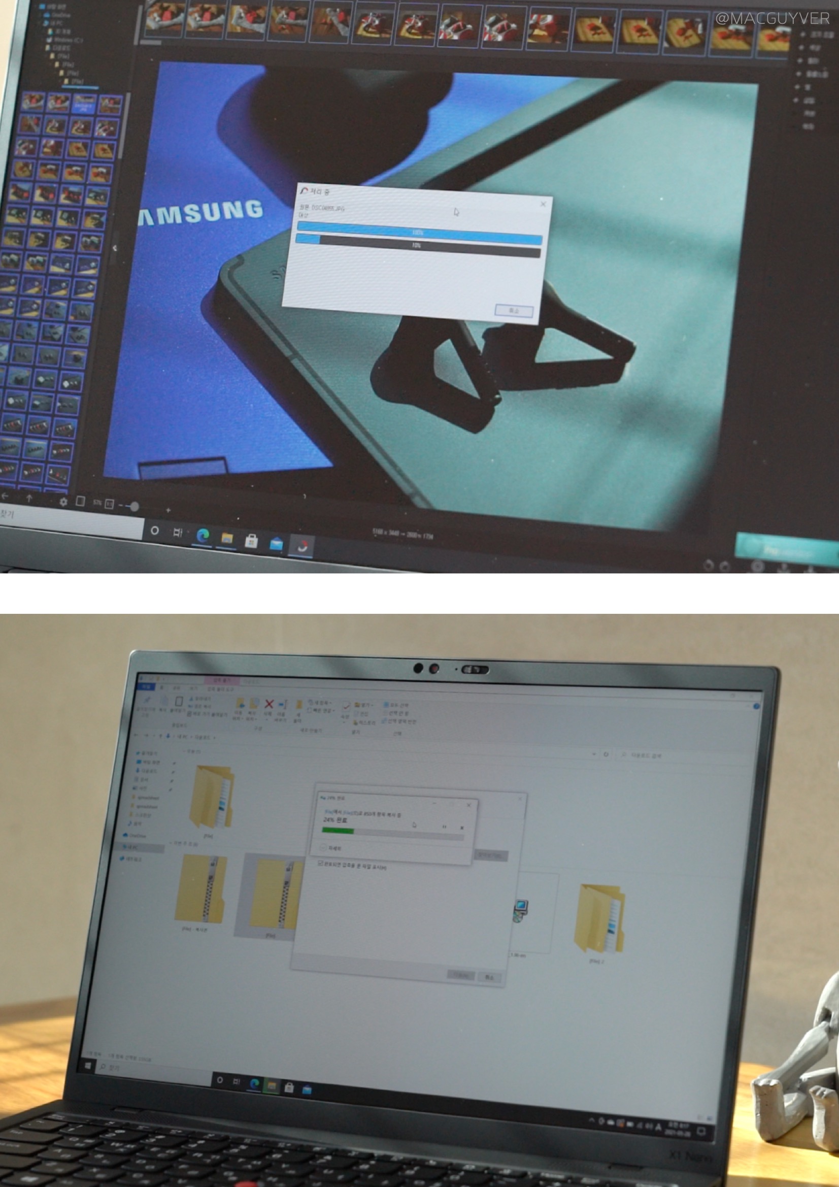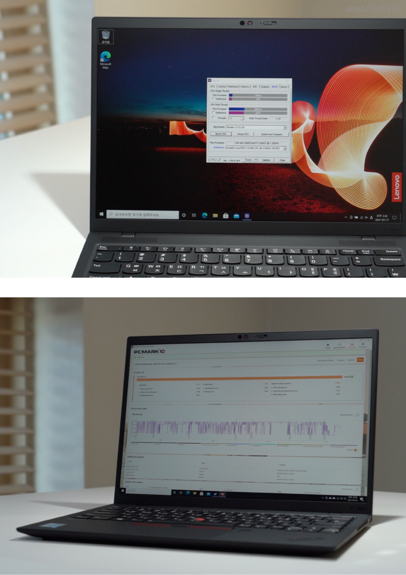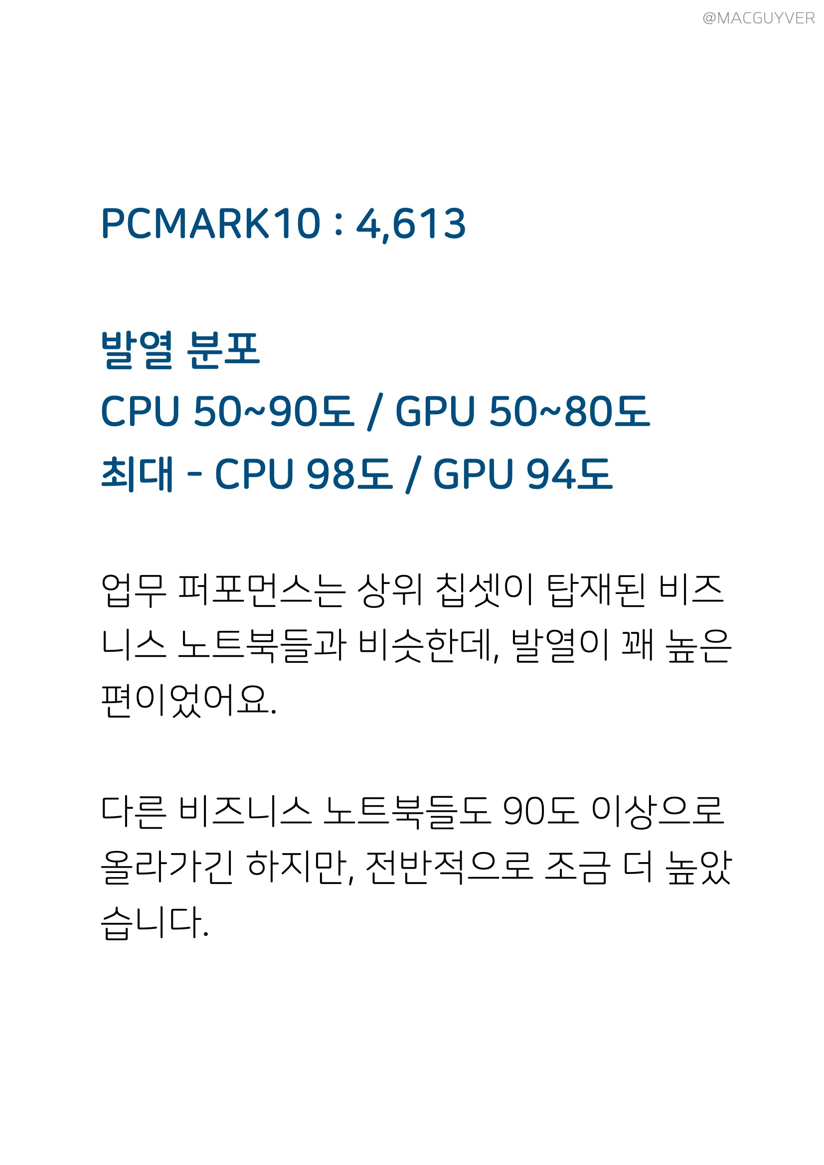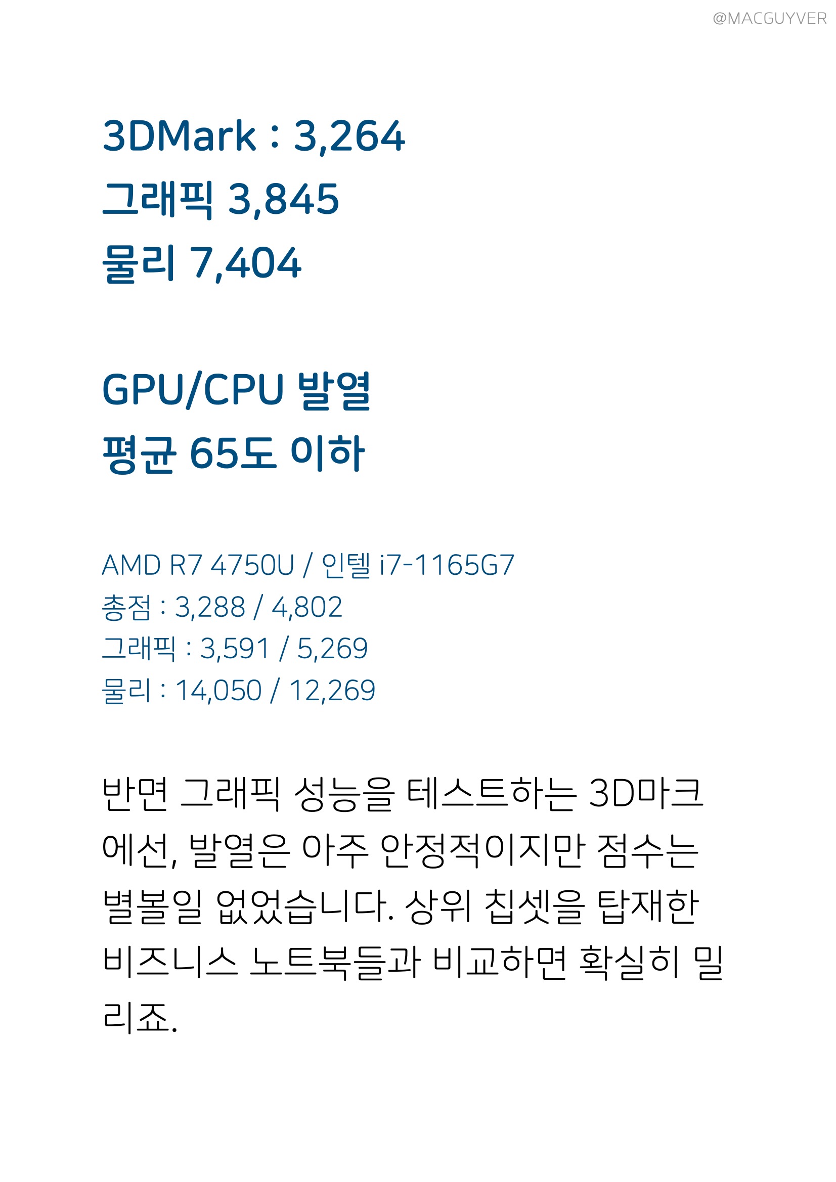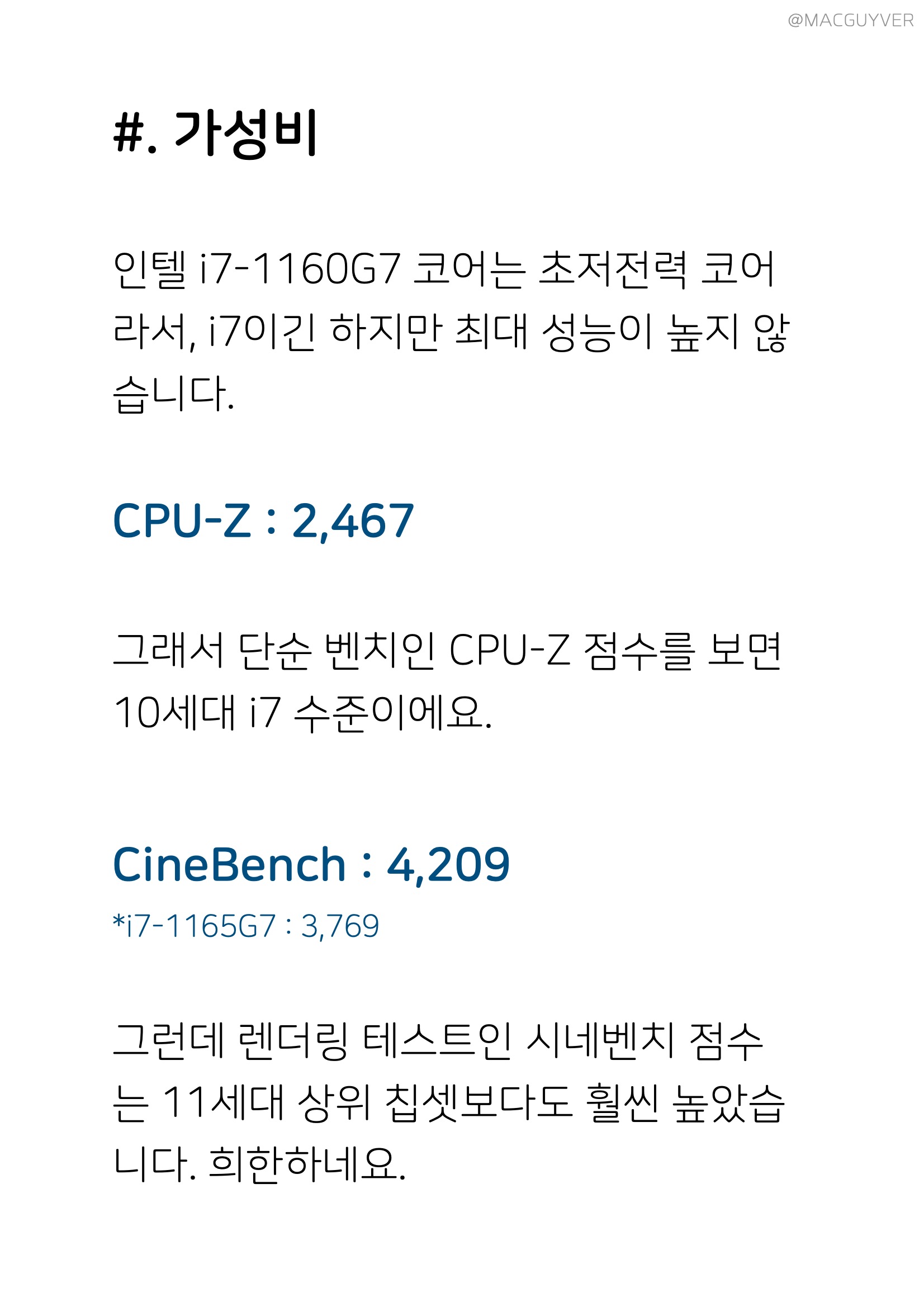 #. 가성비 인텔 i7-1160G7 코어는 초저전력 코어라서, i7이긴 하지만 최대 성능이 높지 않습니다. CPU-Z 2,467 그래서 단순 벤치인 CPU-Z 점수를 보면 10세대 i7 수준이에요. CineBench 4,209 i7-1165G7 : 3,769 그런데 렌더링 테스트인 시네벤치 점수는 11세대 상위 칩셋보다도 훨씬 높았습니다. 희한하네요. PCMARK10 4,613 발열 최대 - CPU 98도 / GPU 94도 평균 - CPU 50~90도 / GPU - 50~80도 업무 퍼포먼스는 상위 칩셋이 탑재된 비즈니스 노트북들과 비슷한데, 발열이 꽤 높은 편이었어요. 다른 비즈니스 노트북들도 90도 이상으로 올라가긴 하지만, 전반적으로 조금 더 높았습니다. 3DMark 총점 3,264 그래픽 3,845 물리 7,404 GPU/CPU 발열 평균 65도 이하 AMD R7 4750U 총점 : 3,288 그래픽 : 3,591 물리 : 14,050 인텔 i7-1165G7 총점 : 4,802 그래픽 : 5,269 물리 : 12,269 반면 그래픽 성능을 테스트하는 3D마크에선, 발열은 아주 안정적이지만 점수는 별볼일 없었습니다. 상위 칩셋을 탑재한 비즈니스 노트북들과 비교하면 확실히 밀리죠. CrystalDiskMark 최대 읽기 2,482MB/s 최대 쓰기 1,808MB/s 일반 SSD보다는 5배정도 빠르지만, 최신 NVMe는 보통 3,000MB/s 이상 올라가는데, 그에 비해 속도가 낮네요. 벤치 점수만 봤을 때, 안정적인 고성능을 기대할 수는 없었고, 다른 씽크패드 X1에 비해서도 가성비가 조금 아쉬웠어요. 대신 실사용 퍼포먼스에선 부족함이 없었습니다. 3.7GB 파일 압축 2분 4초 압축해제 36초 복제 4초 415장 고화질 사진 포토스케이프 편집 4분 20초 소요 파일 압축, 압축해제, 복제 속도는 고사양 게이밍 노트북만큼 빨랐고, 사진 편집은 게이밍 노트북보다 1분 이상 더 걸렸지만, 대신 사진을 불러올 때 다른 노트북들과 달리 딜레이가 전혀 없었어요. PDF 반응속도도 비즈니스 노트북답게 빠릿했습니다.
