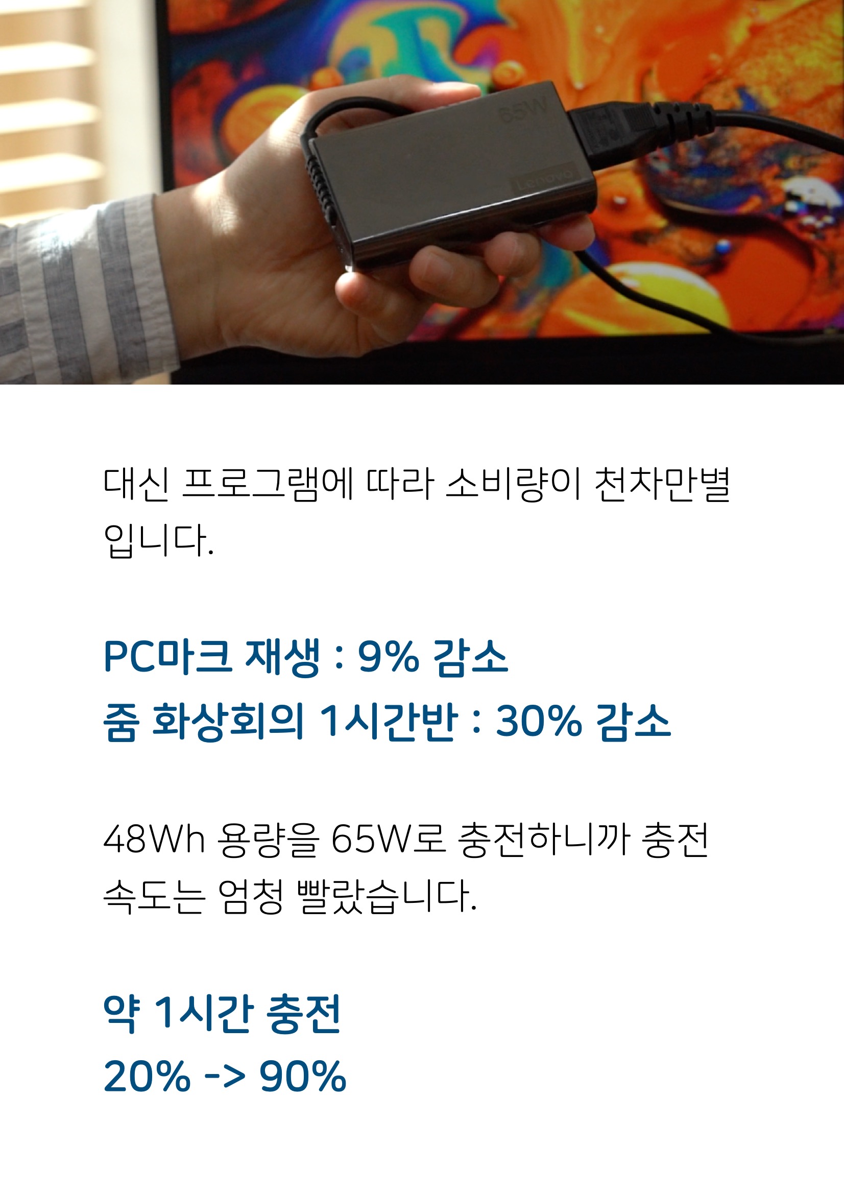 #. 배터리 배터리 용량은 13형 노트북 중에 준수한 수준입니다. 그런데 칩셋 덕분인지 배터리 타임은 수준급이었는데요. 70% 밝기/이어폰볼륨 영상 재생 30분 : 5% 감소 1시간반 : 15% 감소 450니트라서 70% 밝기라도 시인성이 괜찮다는 걸 고려하자면, 결과가 더 만족스럽습니다. 충전기 없이 휴대해볼만 해요. 대신 프로그램에 따라 소비량이 천차만별입니다. PC마크 재생 : 9% 감소 줌 화상회의 1시간반 : 30% 감소 48Wh 용량을 65W로 충전하니까 충전 속도는 엄청 빨랐습니다. 약 1시간 충전 20% -> 90%