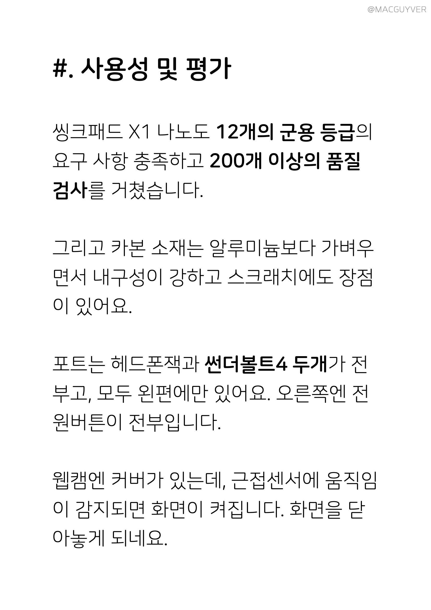 #. 기타 씽크패드 X1 나노도 12개의 군용 등급의 요구 사항 충족하고 200개 이상의 품질검사를 거쳤습니다. 그리고 카본 소재는 알루미늄보다 가벼우면서 내구성이 강하고 스크래치에도 장점이 있어요. 포트는 헤드폰잭과 썬더볼트4 두개가 전부고, 모두 왼편에만 있어요. 오른쪽엔 전원버튼이 전부입니다. 웹캠엔 커버가 있는데, 근접센서에 움직임이 감지되면 화면이 켜집니다. 화면을 닫아놓게 되네요. 힌지는 180도로 펼쳐지고, 저항감도 있고 바디 무게도 가볍지만 한손 열기도 됩니다. 스피커는 돌비 애트모스가 적용되었어요. 그리고 정말, 정말 정말 가볍습니다. 작고 튼튼하면서 가벼우니까 체감 무게는 거의 태블릿급이네요. 가격 대비 칩셋이 조금 아쉽지만, 칩셋 대비 성능은 괜찮았어요. 핵심은 휴대성이었는데, 배터리타임, 야외시인성, 내구성, 무게를 종합적으로 따지면, 제가 리뷰한 노트북들 중 가장 뛰어나요. 관심이 있으신 분들은 맥가이버 15% 할인 코드를 적용해보시기 바랍니다.