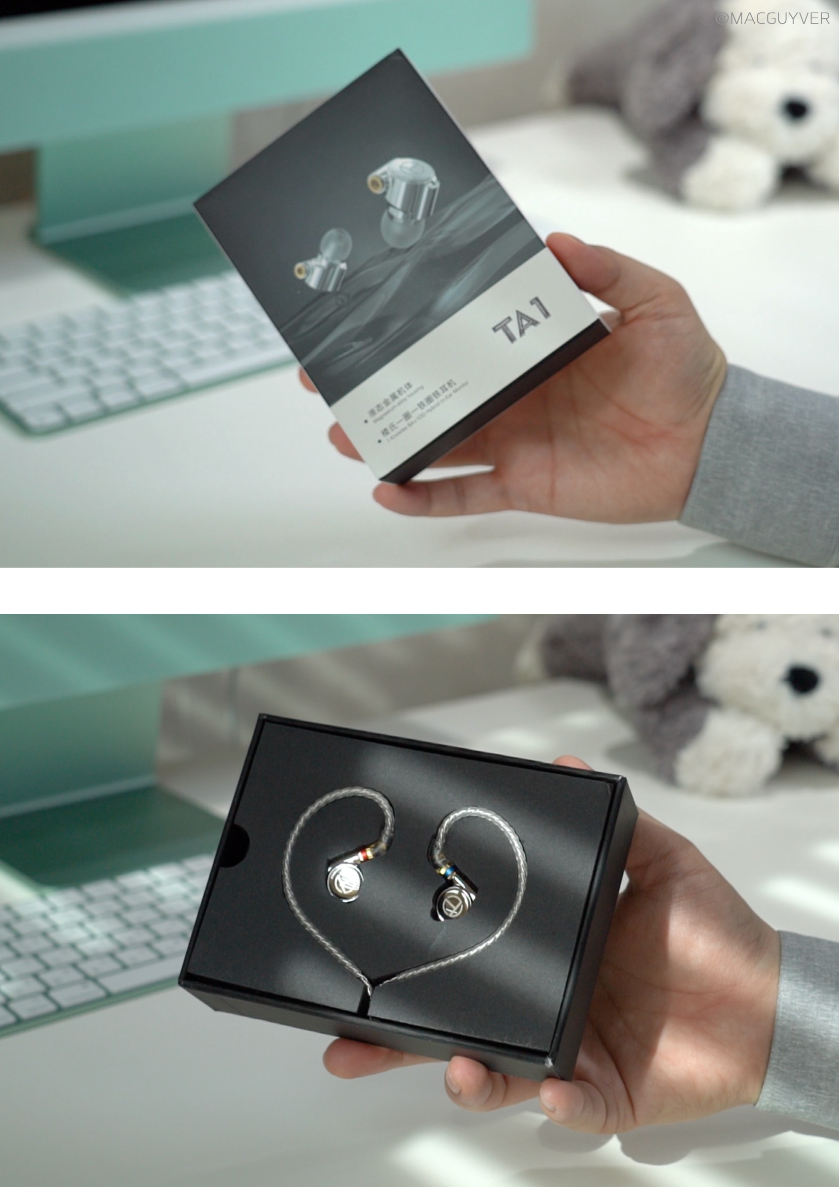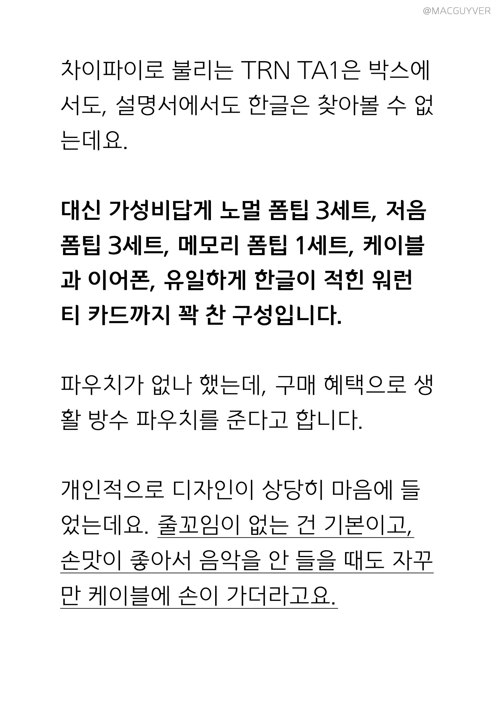 차이파이로 불리는 TRN TA1은 박스에서도, 설명서에서도 한글은 찾아볼 수 없는데요. 대신 가성비 이어폰답게 노멀 폼팁 3세트, 저음 폼팁 3세트, 메모리 폼팁 1세트, 케이블과 이어폰, 유일하게 한글이 적힌 워런티 카드까지 꽉 찬 구성입니다. 파우치가 없나 했는데, 구매 혜택으로 생활 방수 파우치를 준다고 합니다. 개인적으로 디자인이 상당히 마음에 들었는데요. 줄꼬임이 없는 건 기본이고, 손맛이 좋아서 음악을 안 들을 때도 자꾸만 케이블에 손이 가더라고요. ㄱ자 금도금 커넥터라 폰이든, 아이맥이든 꺾이지 않게 연결해볼 수 있었어요. 유선 이어폰 디자인도 상당히 고급스러운데다 반투명에 좌우 컬러 표시도 명확해서 말하지 않으면 수십만원대 이어폰처럼 보이기도 하는데요. 대신 유분이 잘 묻기도 하고, 각진 모양에 작은 듯하면서도 존재감이 있어서 착용감은 호불호가 있으니까 적절한 이어팁 선택이 필요합니다. 고음질 이어폰 기본 이어팁 선택지도 많고, 또 MMCX 타입이라 케이블도 원하는 대로 선택해볼 수 있으니까 커스텀도 장점인 거죠. 확실히 전투용이라 부를 정도로 편하게 쓰기에 괜찮은 가격과 내구성인 것 같습니다.