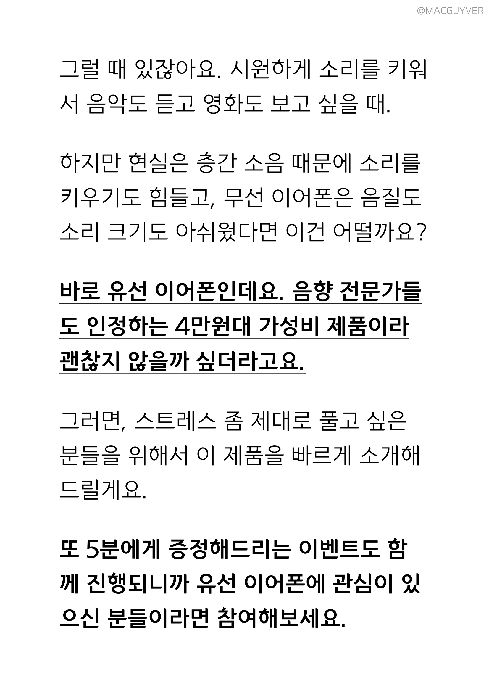 그럴 때 있잖아요. 시원하게 소리를 키워서 음악도 듣고 영화도 보고 싶을 때. 하지만 현실은 층간 소음 때문에 소리를 키우기도 힘들고, 무선 이어폰은 음질도 소리 크기도 아쉬웠다면 이건 어떨까요? 바로 유선 이어폰인데요. 음향 전문가들도 인정하는 4만원대 유선 이어폰 가성비 제품이라 이만하면 괜찮지 않을까 싶더라고요. 그러면, 스트레스 좀 제대로 풀고 싶은 분들을 위해서 이 제품을 빠르게 소개해드릴게요. 또 유선 이어폰을 5분에게 증정해드리는 이벤트도 함께 진행되니까 유선 이어폰에 관심이 있으신 분들이라면 참여해보세요.