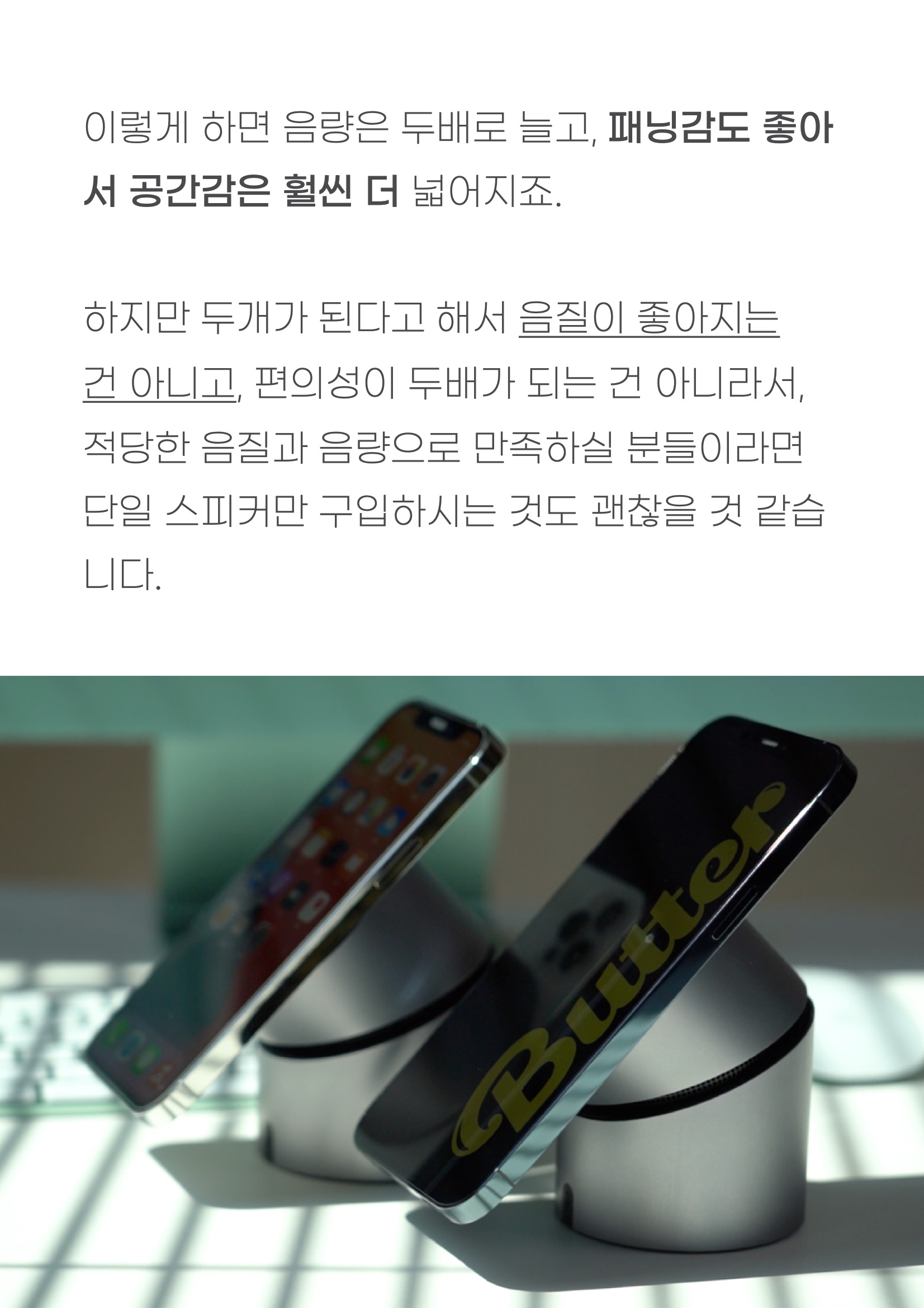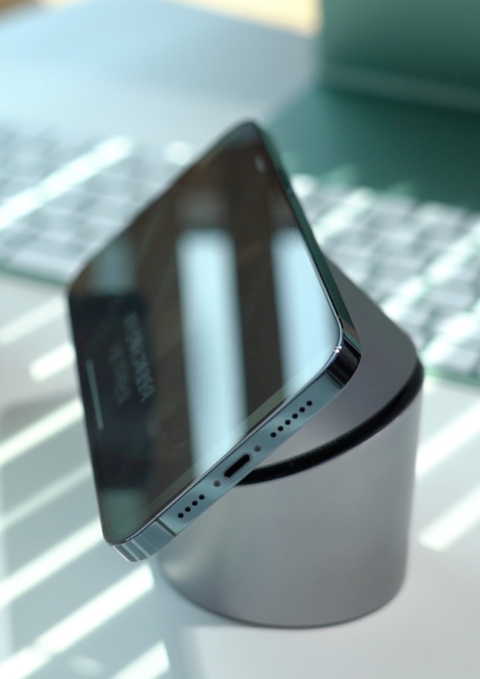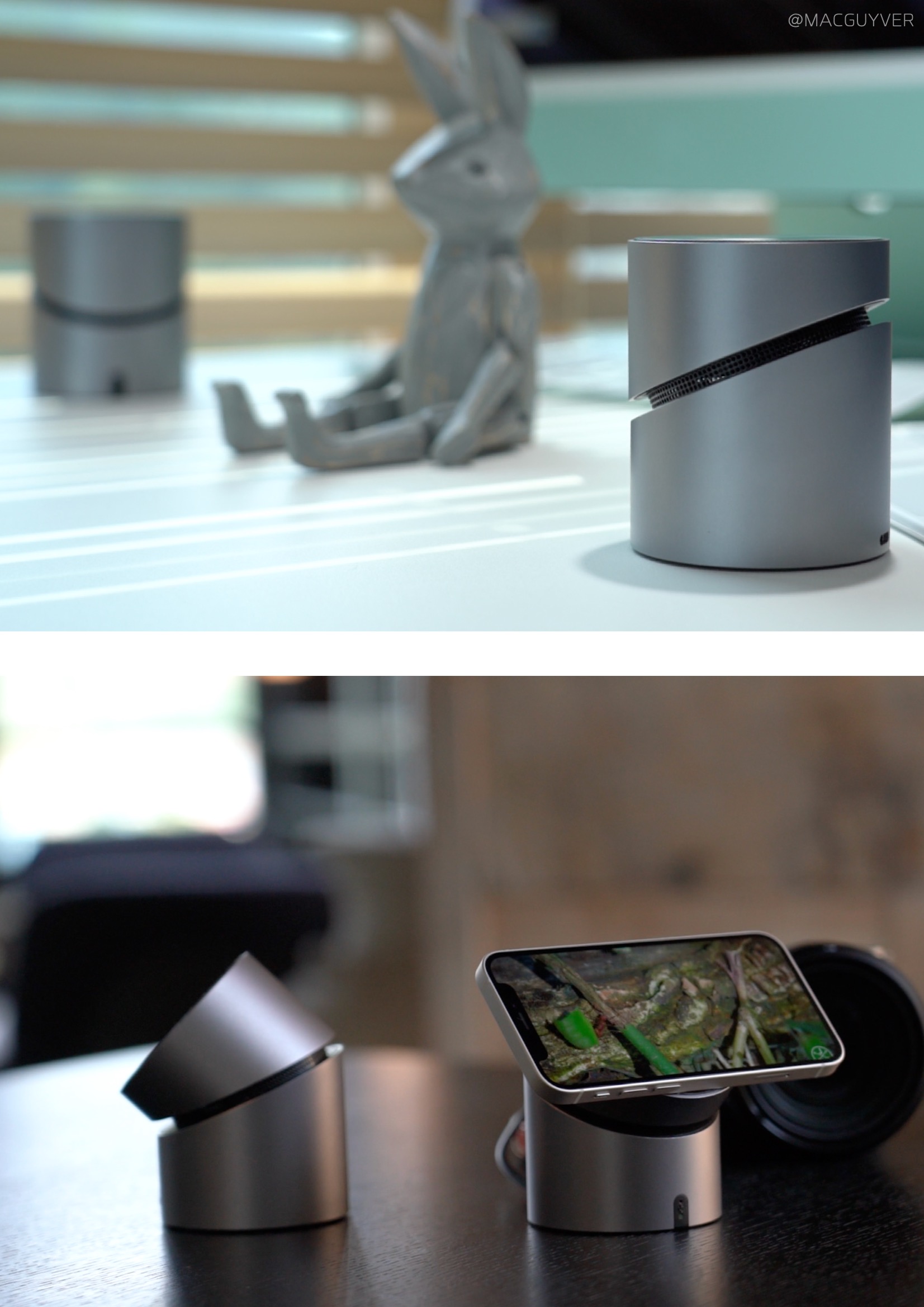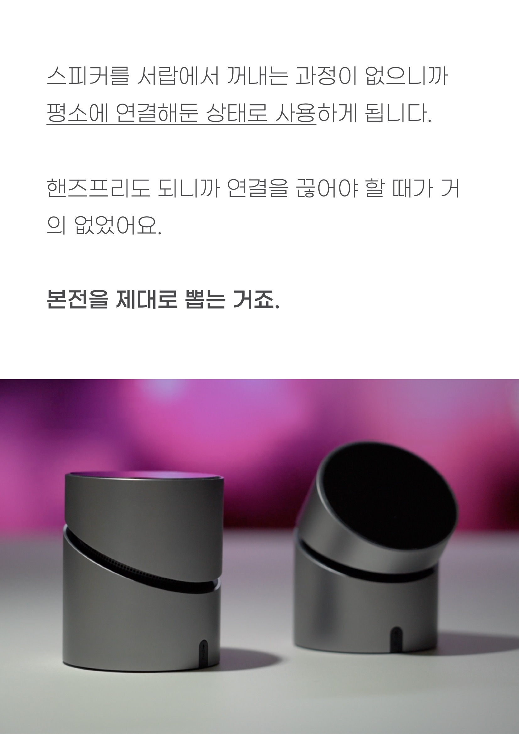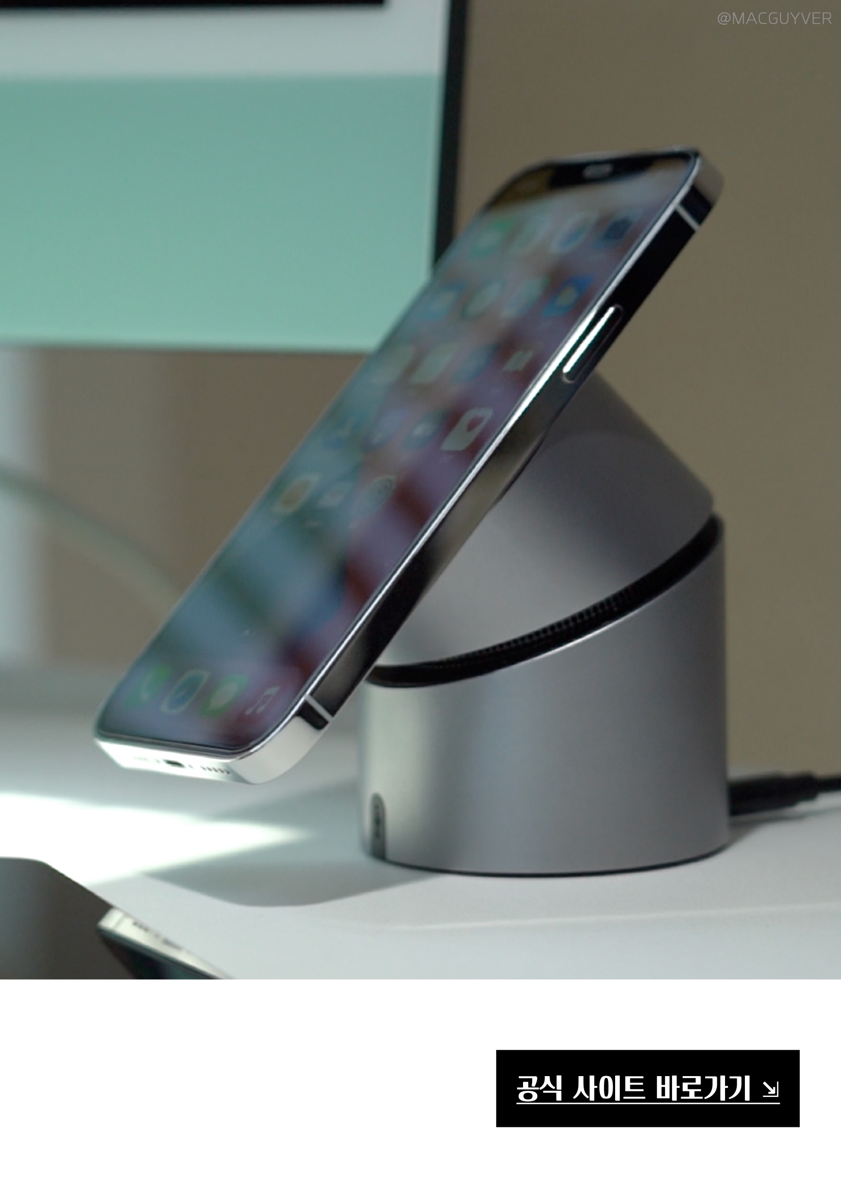 #. 거치대 이 맥세이프 스피커는 3M사의 G990 실리콘을 사용해서 흡착 방식으로 거치하는데, 유리 재질은 안정적이지만 케이스 재질에 따라 미끄러질 수 있습니다. 맥세이프를 지원하는 아이폰은 자력으로도 한번 더 착 달라붙지만, 마찬가지로 일반 케이스를 씌우면 자력도 거의 없어져요. 각도 조절은 편하고, 또 자유로운데, 45도 이상 세워지진 않아요. 흡착 패드는 먼지가 아주 잘 묻지만, 물티슈로 닦으면 쉽게 깨끗해집니다. 방수는 아니니까 주의하셔야 해요. 아이패드도 거치할 수 있었는데요. 살짝 기대듯이 거치만 가능할 줄 알았는데, 하단이 아닌 중앙 쪽에서 지지해주니까, 아주 안정적이진 않아도 거치가 가능하긴 했습니다. 알루미늄 마감이라서 책상 위에 올려뒀을 때 깔끔했고, 거치대 형태라 책상에 있을 땐 늘 폰을 무선충전해두게 되죠. 스피커도 충전기를 연결해두니까 가끔 들고 나갈 때 늘 완충되어 있었어요. 폰을 거치해두고 영상볼 때 소리 나는 위치가 같으니까 좋고, 스피커를 서랍에서 꺼내는 과정이 없으니까 늘 연결해둔 상태로 사용하게 됩니다. 본전을 제대로 뽑는 거죠. 핸즈프리도 되니까 연결을 끊어야 할 때가 거의 없었어요. 폰이 닿는 부분이 메탈이라 흠집날까 걱정했는데, 마감이 부드러워서 흠집을 내진 않았습니다.