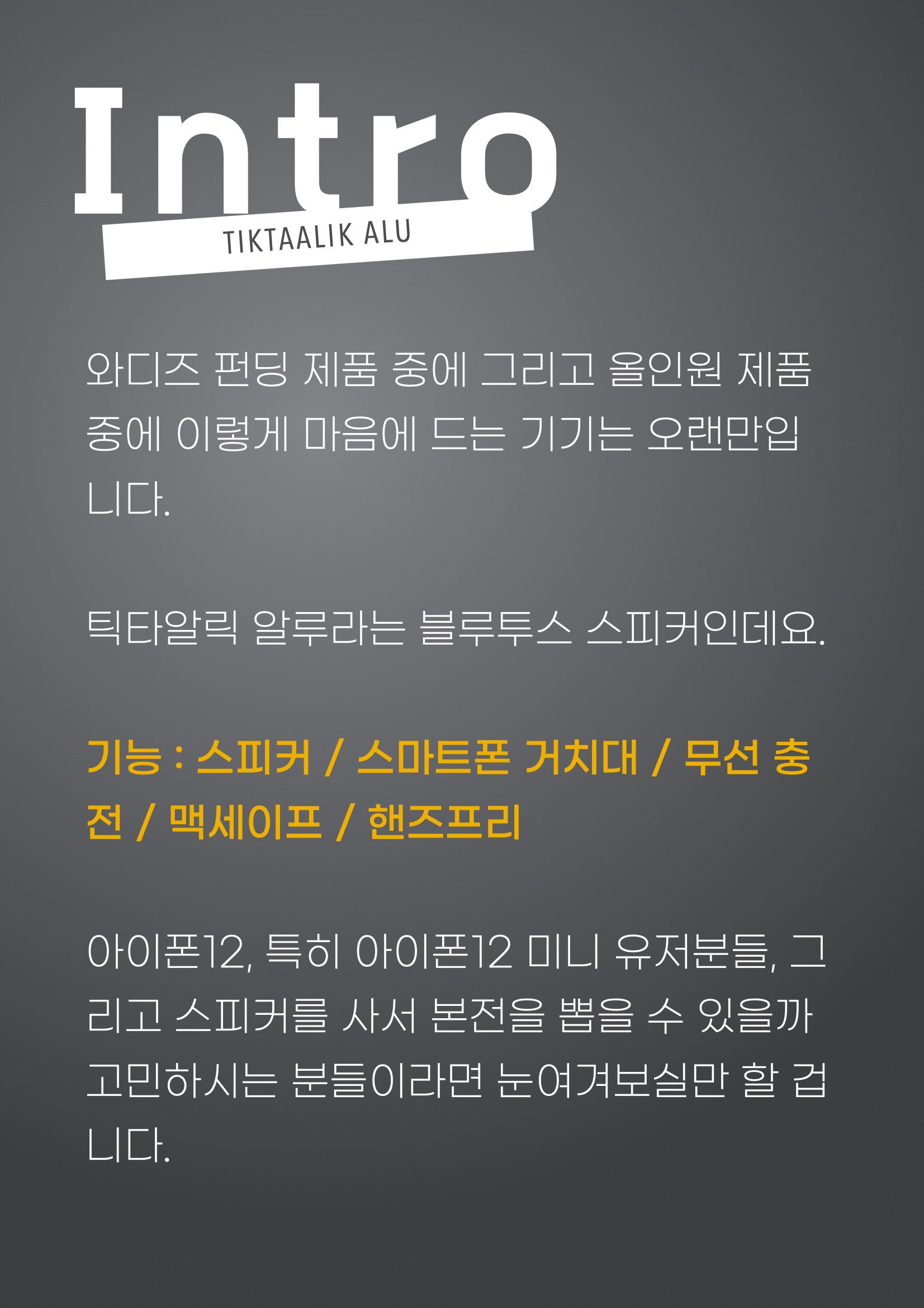 올인원 제품 중에 이렇게 마음에 드는 기기는 오랜만입니다. 틱타알릭 알루라는 가성비 블루투스 스피커인데요. 스피커도 되면서, 스마트폰 거치대, 무선 충전, 심지어 맥세이프를 지원합니다. 핸즈프리 기능도 있어요. 이 가성비 스피커는 아이폰 유저분들에게 추천하고, 특히 저와 같은 아이폰 미니 사용자라면 눈여겨보실만 합니다. 이 가성비 블루투스 스피커의 각각 기능들이 적당히 돈값을 하는 것만 해도 좋은데, 서로 시너지 효과가 커서, 제가 사용해본 스피커 중에 본전 뽑기가 가장 좋았어요. 그럼 각 기능들의 완성도가 어떤지, 어떤 면에서 시너지 효과가 있는지, 또 어떤 단점이 있었는지 자세하게 알려드릴게요.