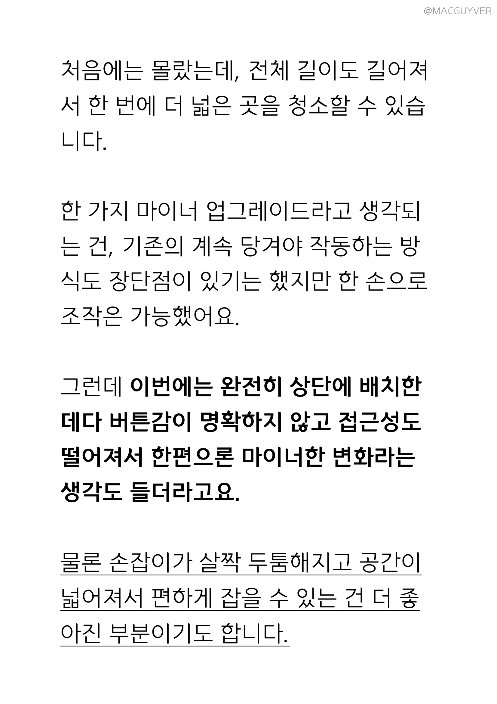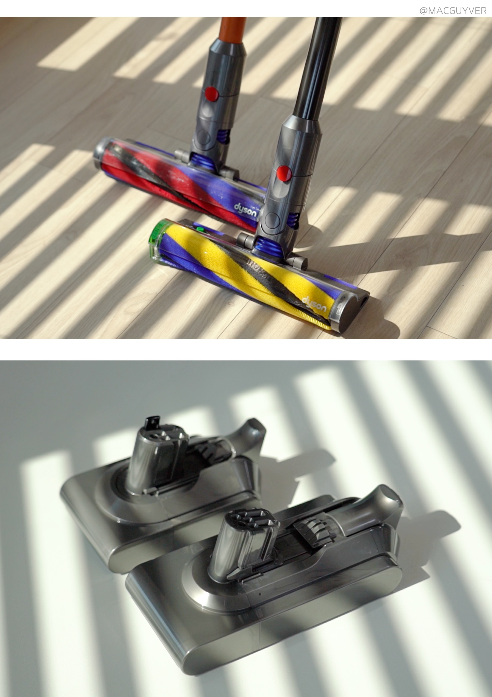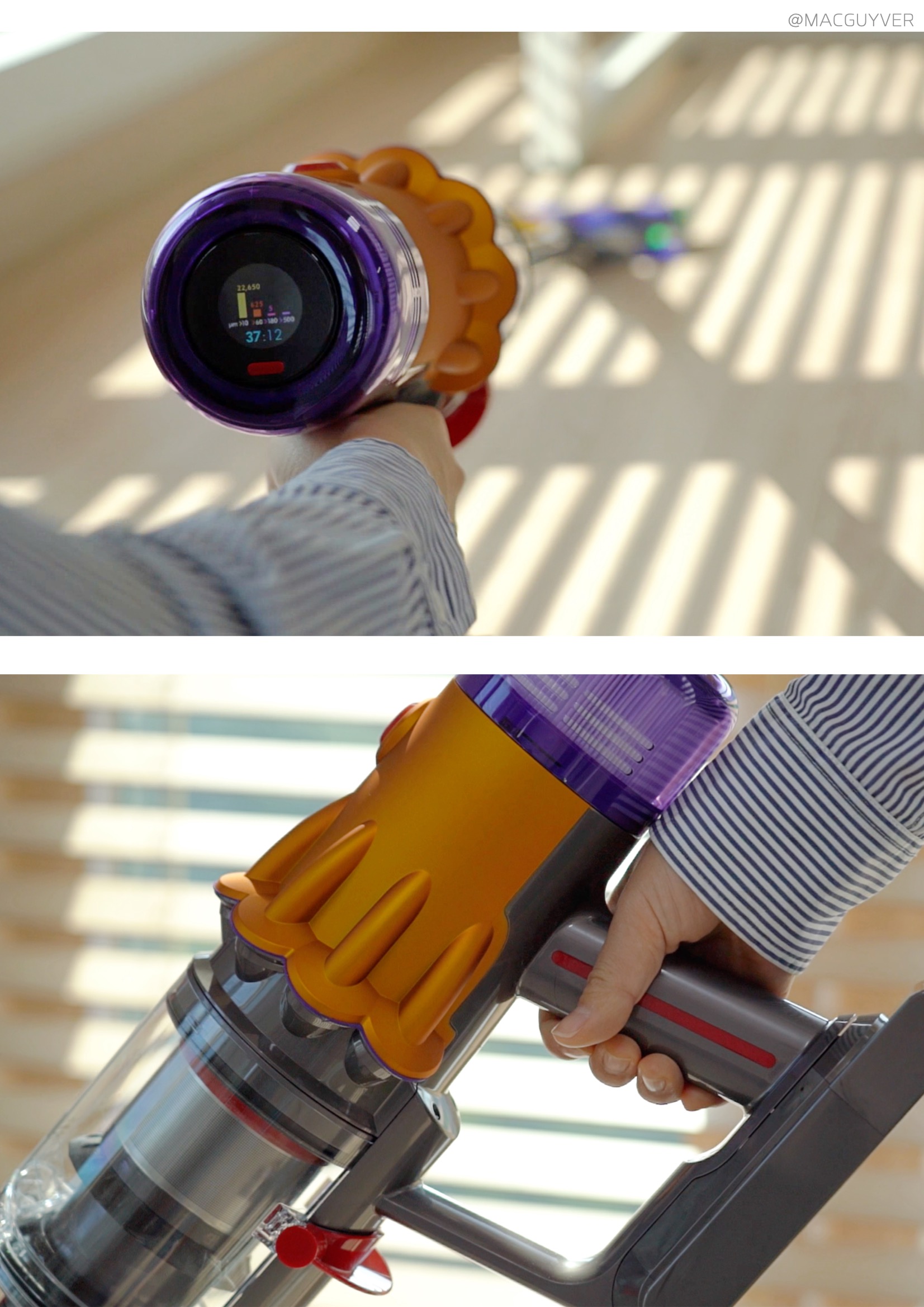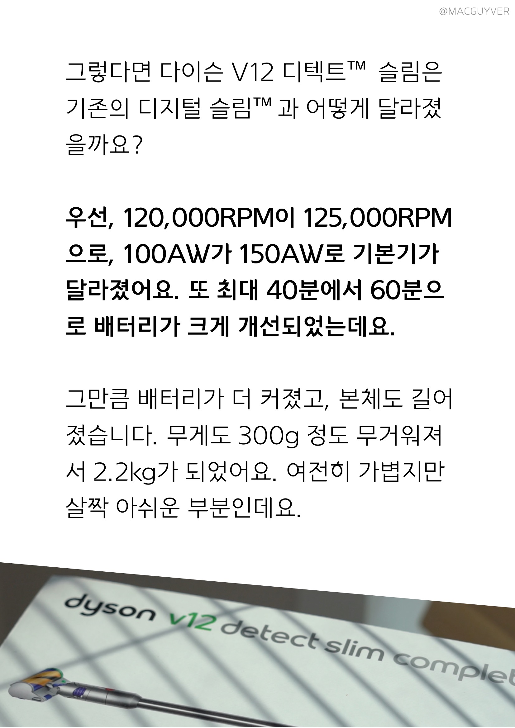 무선청소기추천, 그렇다면 다이슨 V12 디텍트 슬림™은 기존의 디지털 슬림과 어떻게 달라졌을까요? 우선, 120,000RPM이 125,000RPM으로, 100AW가 150AW로 기본기가 달라졌어요. 또 최대 40분에서 60분으로 배터리가 크게 개선되었는데요. 그만큼 배터리가 더 커졌고, 본체도 길어졌습니다. 무게도 300g 정도 무거워져서 2.2kg가 되었어요. 여전히 가볍지만 살짝 아쉬운 부분인데요. 처음에는 몰랐는데, 전체 길이도 길어져서 한 번에 더 넓은 곳을 청소할 수 있습니다. 한 가지 마이너 업그레이드라고 생각되는 건, 기존의 계속 당겨야 작동하는 방식도 장단점이 있기는 했지만 한 손으로 조작은 가능했어요. 그런데 이번에는 완전히 상단에 배치한데다 버튼감이 명확하지 않고 접근성도 떨어져서 한편으론 마이너한 변화라는 생각도 들더라고요. 물론 다이슨청소기 손잡이가 살짝 두툼해지고 공간이 넓어져서 편하게 잡을 수 있는 건 더 좋아진 부분이기도 합니다.