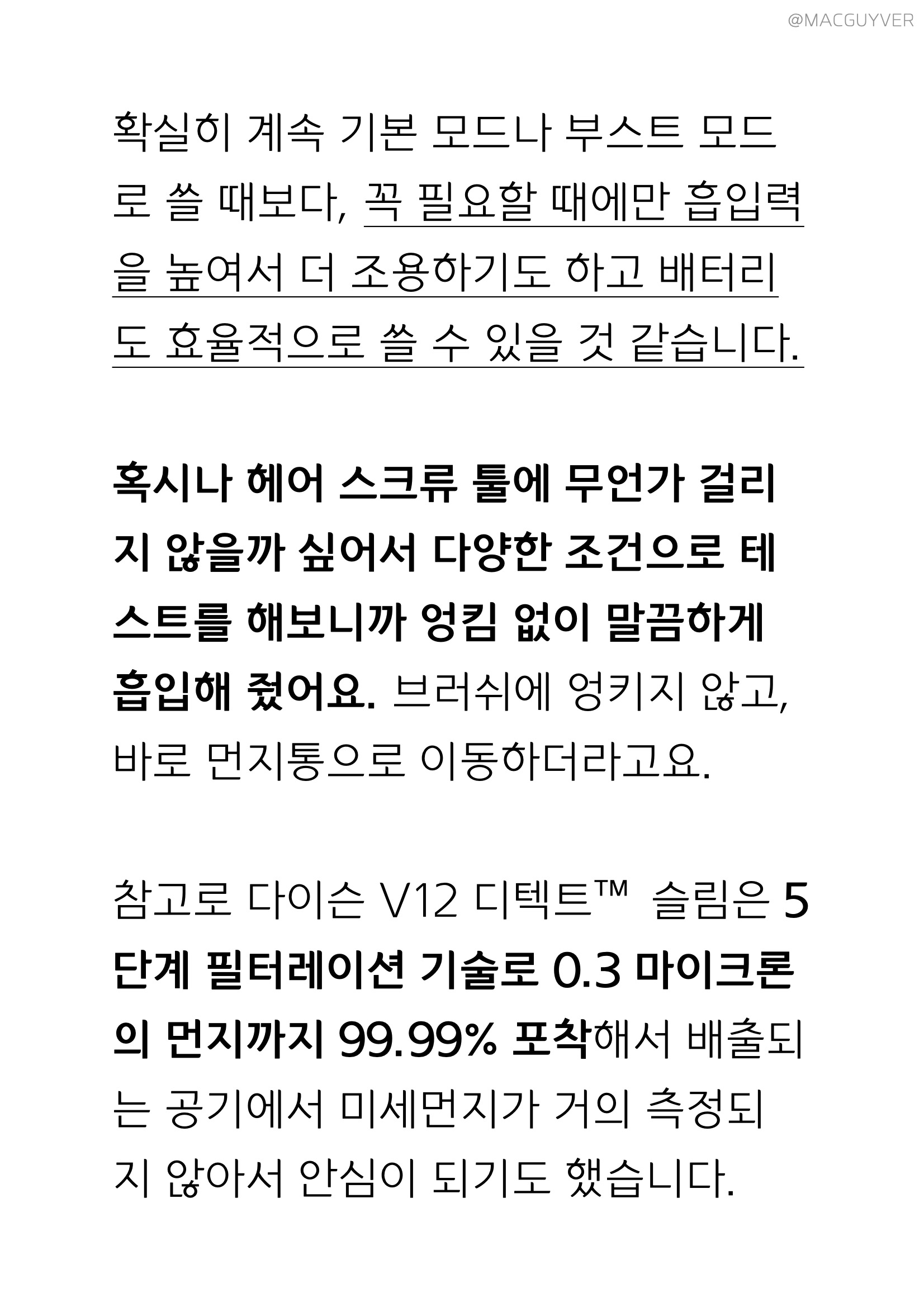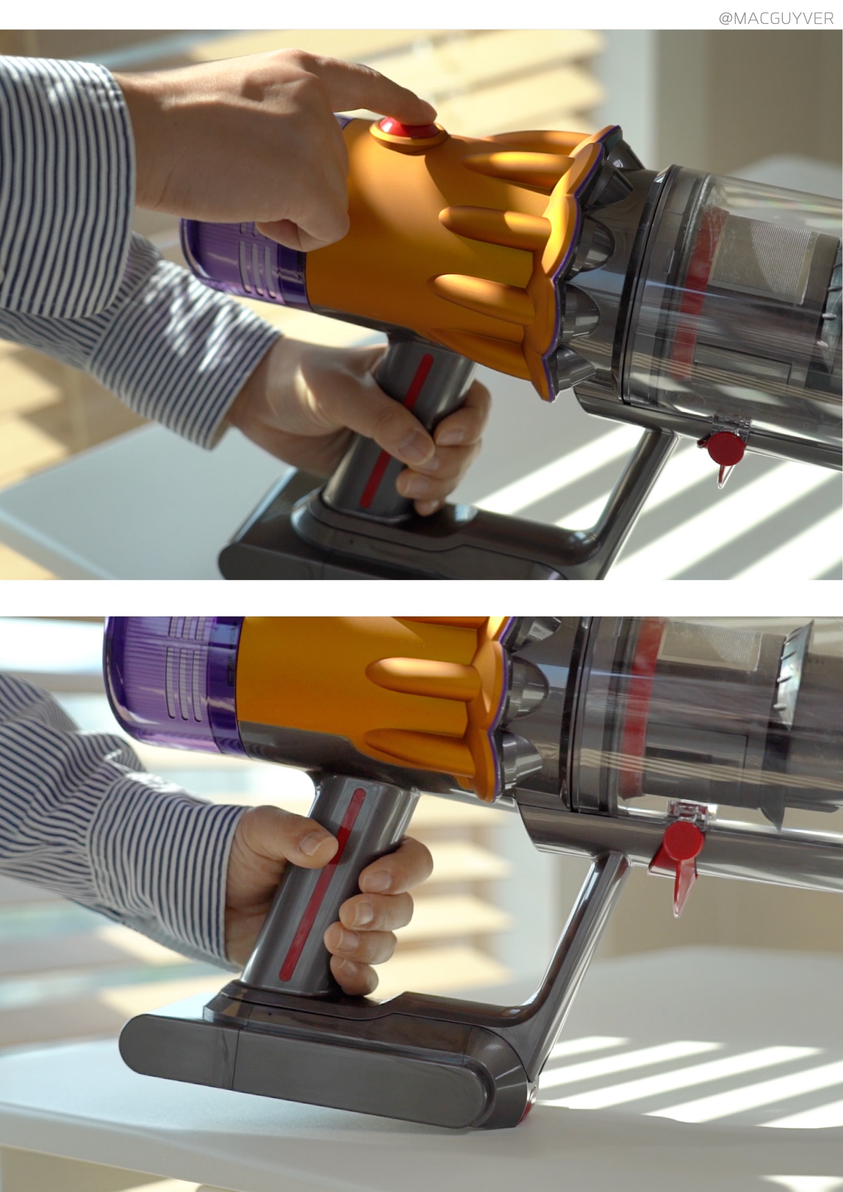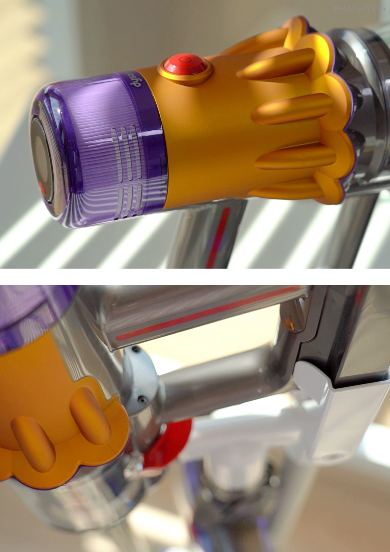 무선청소기추천, 그렇다면 다이슨 V12 디텍트 슬림™은 기존의 디지털 슬림과 어떻게 달라졌을까요? 우선, 120,000RPM이 125,000RPM으로, 100AW가 150AW로 기본기가 달라졌어요. 또 최대 40분에서 60분으로 배터리가 크게 개선되었는데요. 그만큼 배터리가 더 커졌고, 본체도 길어졌습니다. 무게도 300g 정도 무거워져서 2.2kg가 되었어요. 여전히 가볍지만 살짝 아쉬운 부분인데요. 처음에는 몰랐는데, 전체 길이도 길어져서 한 번에 더 넓은 곳을 청소할 수 있습니다. 한 가지 마이너 업그레이드라고 생각되는 건, 기존의 계속 당겨야 작동하는 방식도 장단점이 있기는 했지만 한 손으로 조작은 가능했어요. 그런데 이번에는 완전히 상단에 배치한데다 버튼감이 명확하지 않고 접근성도 떨어져서 한편으론 마이너한 변화라는 생각도 들더라고요. 물론 다이슨청소기 손잡이가 살짝 두툼해지고 공간이 넓어져서 편하게 잡을 수 있는 건 더 좋아진 부분이기도 합니다.