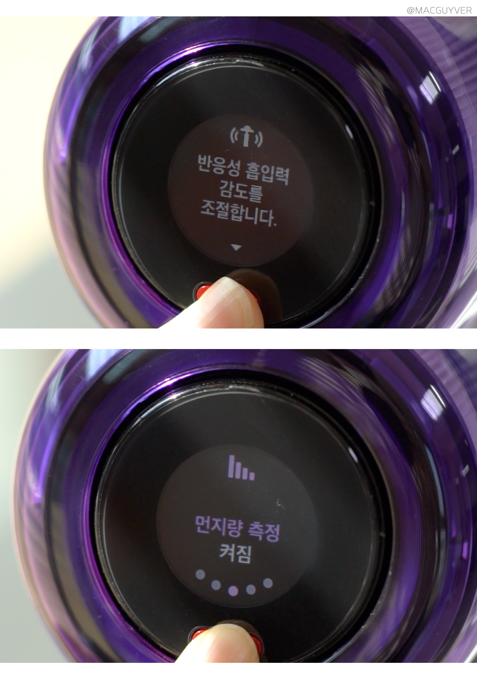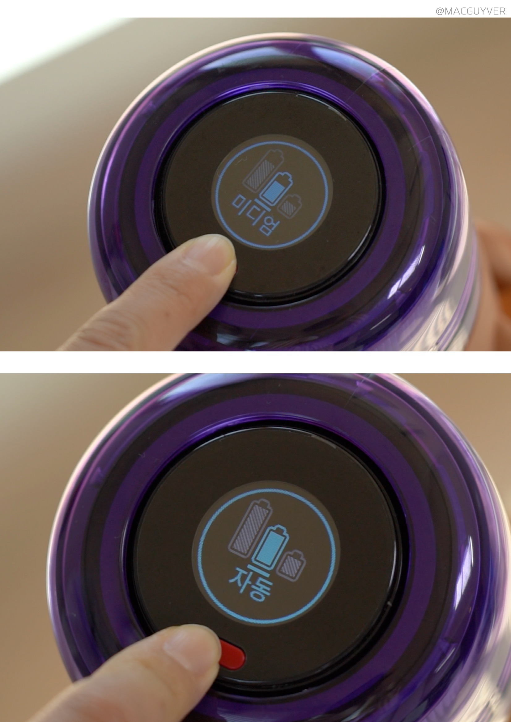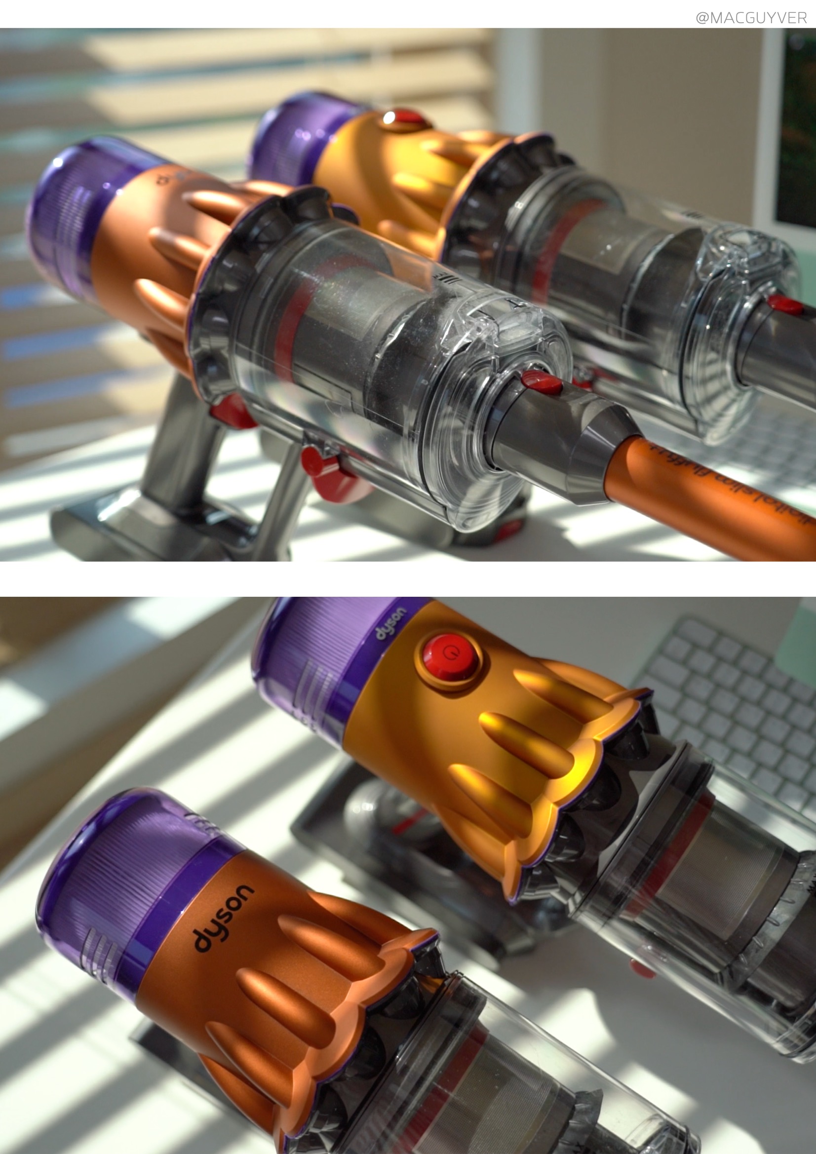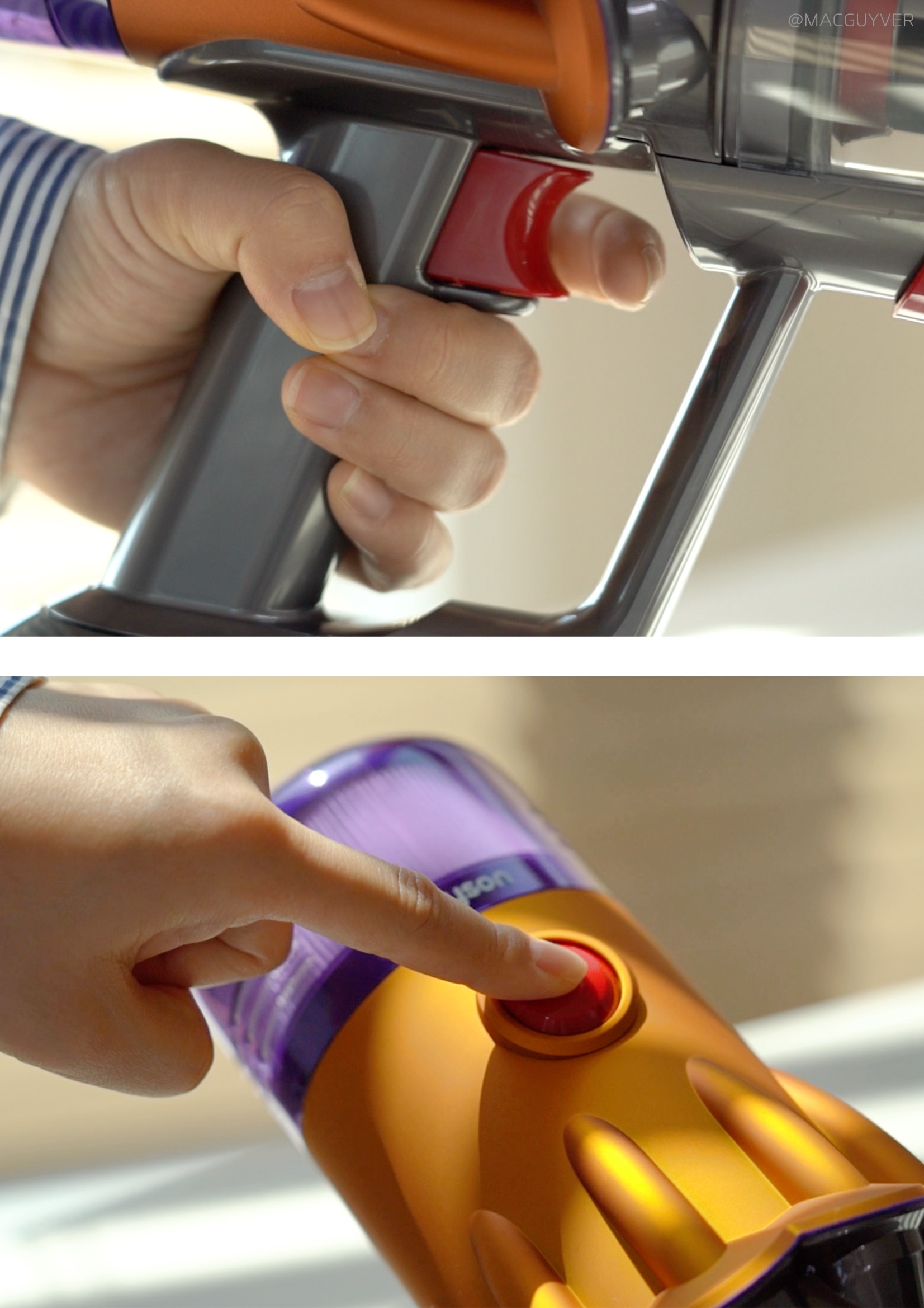 무선청소기추천, 그렇다면 다이슨 V12 디텍트 슬림™은 기존의 디지털 슬림과 어떻게 달라졌을까요? 우선, 120,000RPM이 125,000RPM으로, 100AW가 150AW로 기본기가 달라졌어요. 또 최대 40분에서 60분으로 배터리가 크게 개선되었는데요. 그만큼 배터리가 더 커졌고, 본체도 길어졌습니다. 무게도 300g 정도 무거워져서 2.2kg가 되었어요. 여전히 가볍지만 살짝 아쉬운 부분인데요. 처음에는 몰랐는데, 전체 길이도 길어져서 한 번에 더 넓은 곳을 청소할 수 있습니다. 한 가지 마이너 업그레이드라고 생각되는 건, 기존의 계속 당겨야 작동하는 방식도 장단점이 있기는 했지만 한 손으로 조작은 가능했어요. 그런데 이번에는 완전히 상단에 배치한데다 버튼감이 명확하지 않고 접근성도 떨어져서 한편으론 마이너한 변화라는 생각도 들더라고요. 물론 다이슨청소기 손잡이가 살짝 두툼해지고 공간이 넓어져서 편하게 잡을 수 있는 건 더 좋아진 부분이기도 합니다.