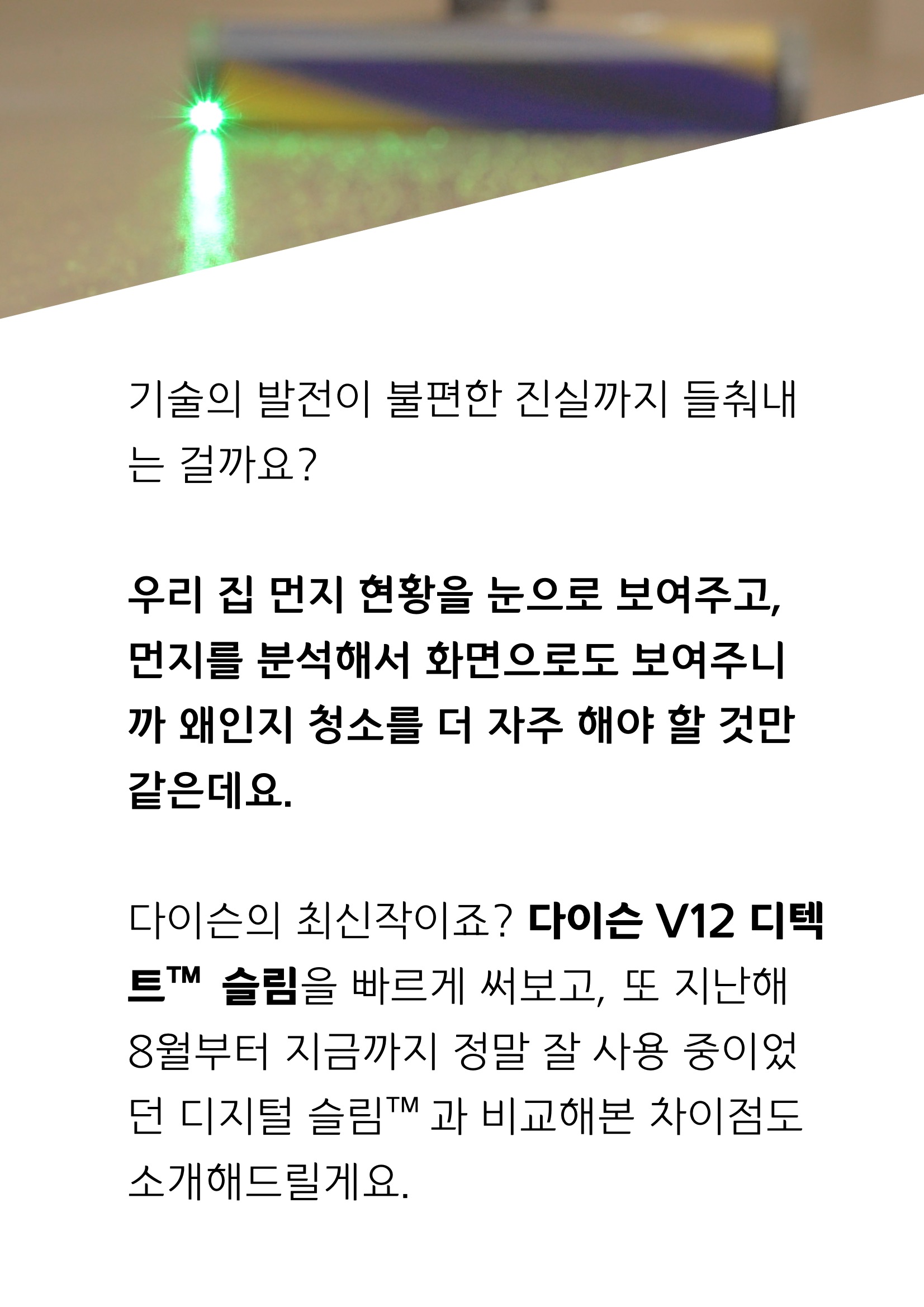 기술의 발전이 불편한 진실까지 들춰내는 걸까요? 우리 집 먼지 현황을 눈으로 보여주고, 먼지를 분석해서 화면으로도 보여주니까 왜인지 청소를 더 자주 해야 할 것만 같은데요. 다이슨무선청소기의 최신작이죠? 다이슨 V12 디텍트 슬림™ 을 빠르게 써보고, 또 지난해 8월부터 지금까지 정말 잘 사용 중이었던 디지털 슬림과 비교해본 차이점도 소개해드릴게요.