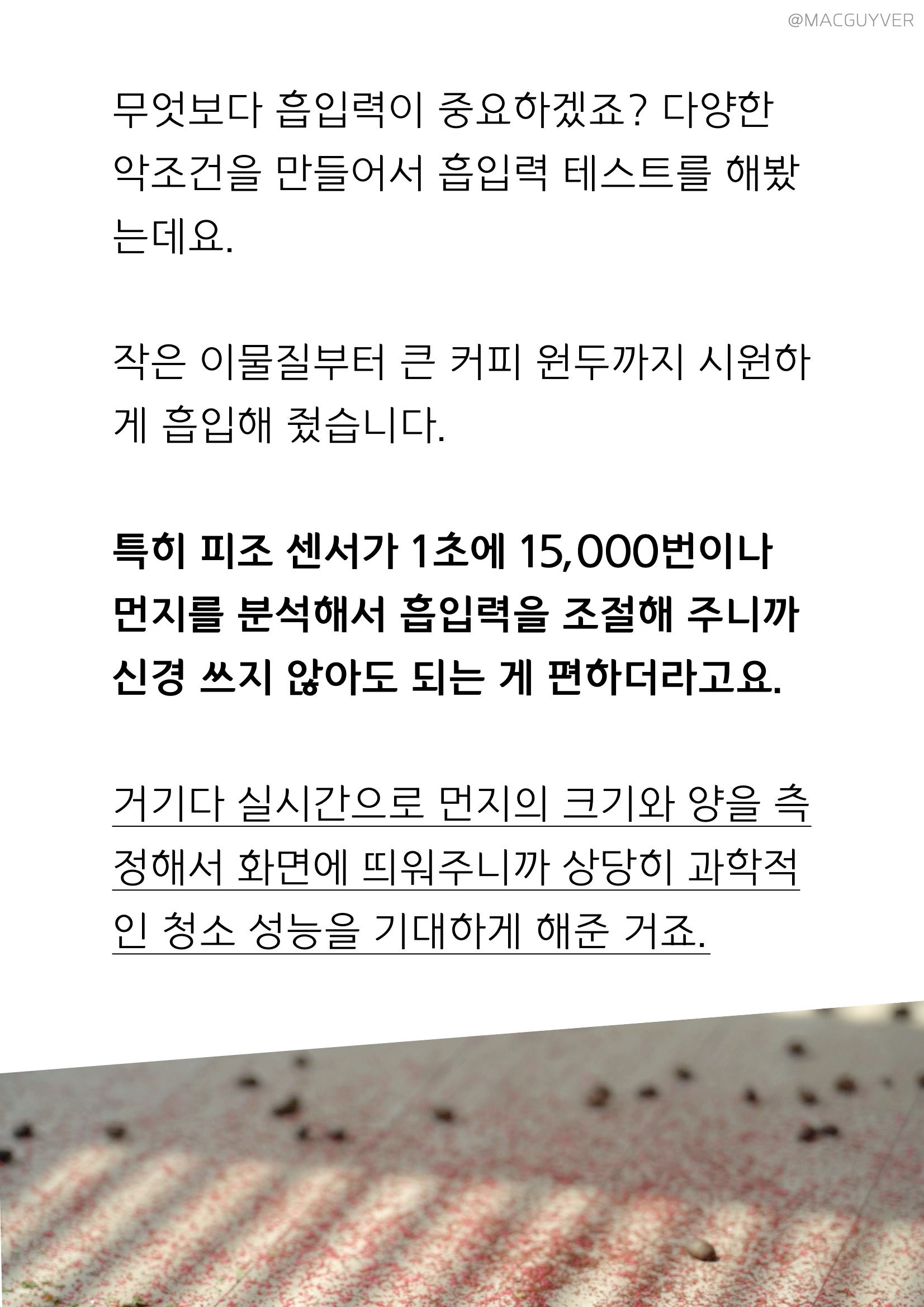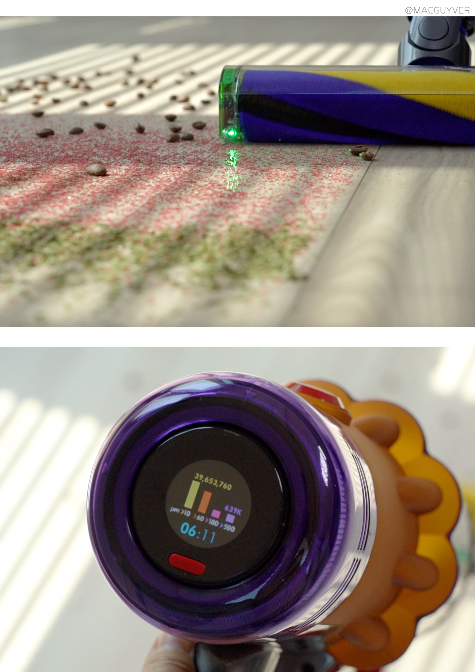 다이슨 V12에서 무엇보다 흡입력이 중요하겠죠? 다양한 악조건을 만들어서 흡입력 테스트를 해봤는데요. 작은 이물질부터 큰 커피 원두까지 시원하게 흡입해 줬습니다. 특히 피조 센서가 1초에 15,000번이나 먼지를 분석해서 흡입력을 조절해 주니까 신경 쓰지 않아도 되는 게 편하더라고요. 거기다 실시간으로 먼지의 크기와 양을 측정해서 화면에 띄워주니까 상당히 과학적인 청소 성능을 기대하게 해준 거죠. 확실히 계속 기본 모드나 부스트 모드로 쓸 때보다, 꼭 필요할 때에만 흡입력을 높여서 더 조용하기도 하고 배터리도 효율적으로 쓸 수 있을 것 같습니다. 혹시나 다이슨청소기 헤어 스크류 툴에 무언가 걸리지 않을까 싶어서 다양한 조건으로 테스트를 해보니까 엉킴 없이 말끔하게 흡입해 줬어요. 브러시에 엉키지 않고, 바로 먼지통으로 이동하더라고요.
