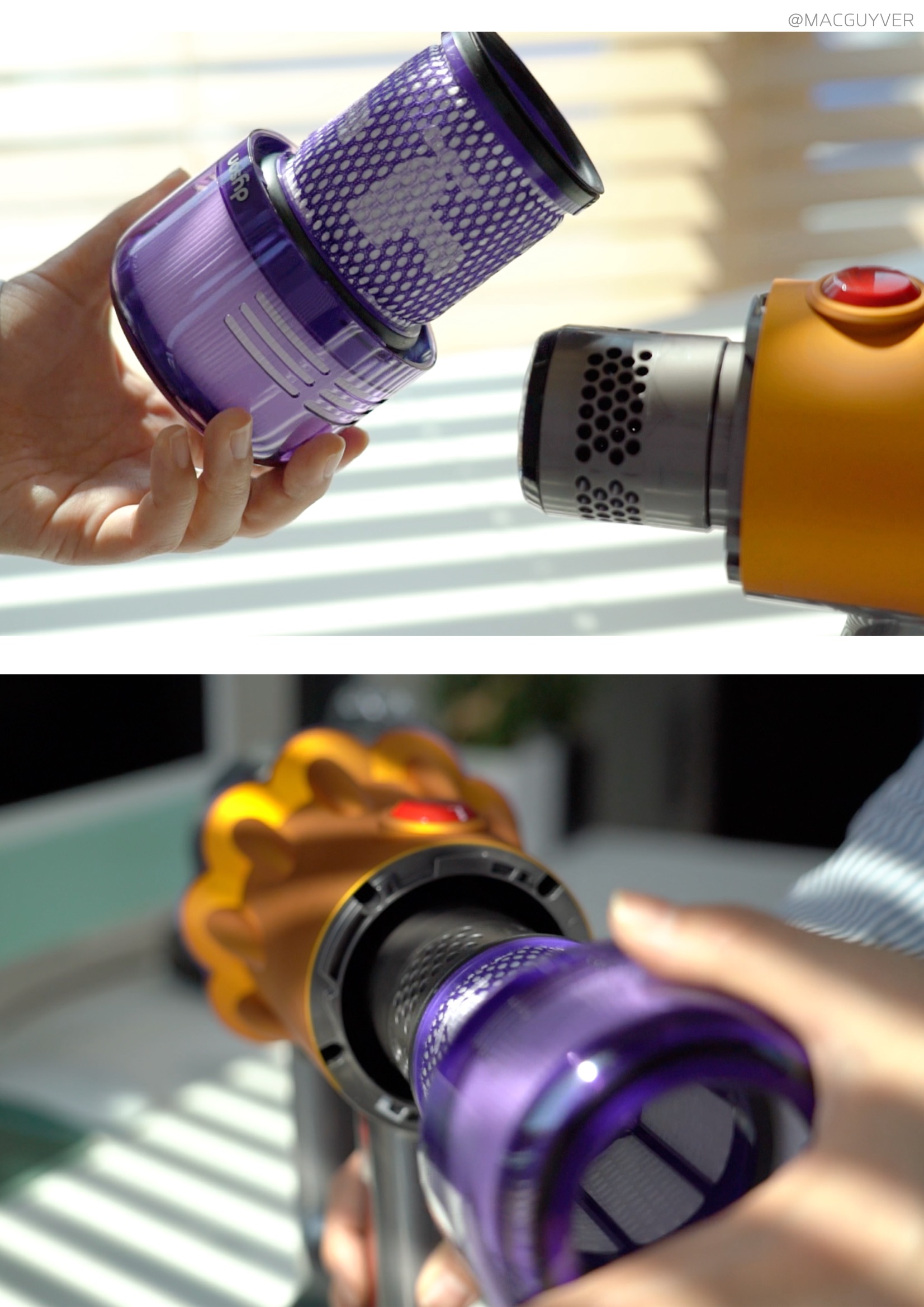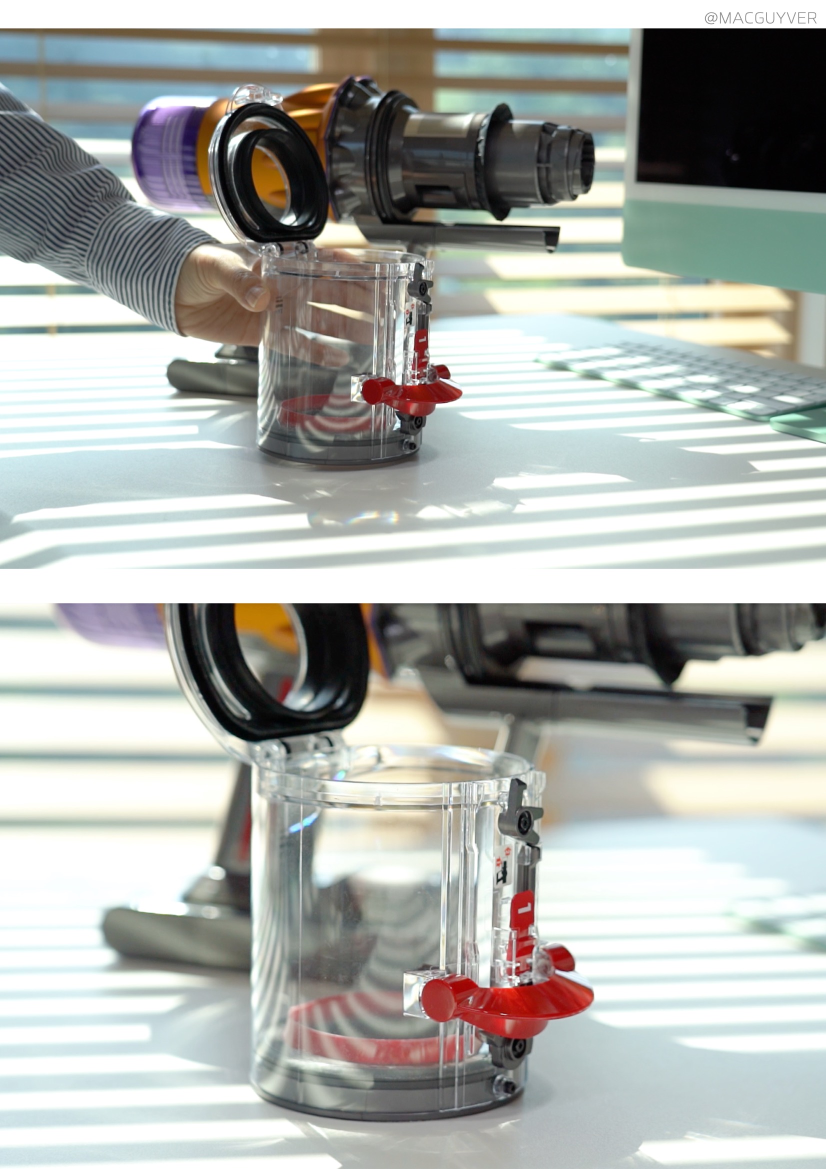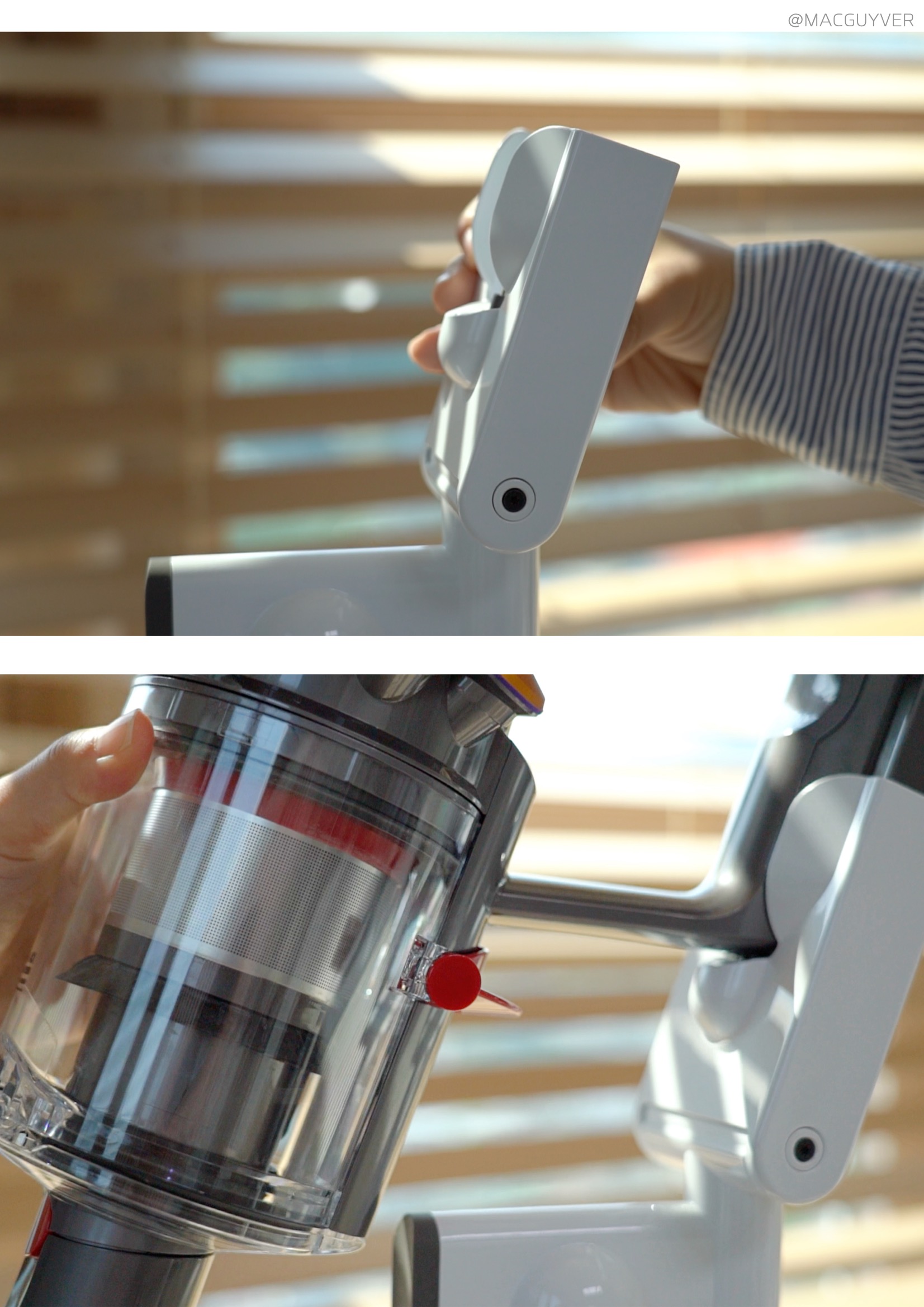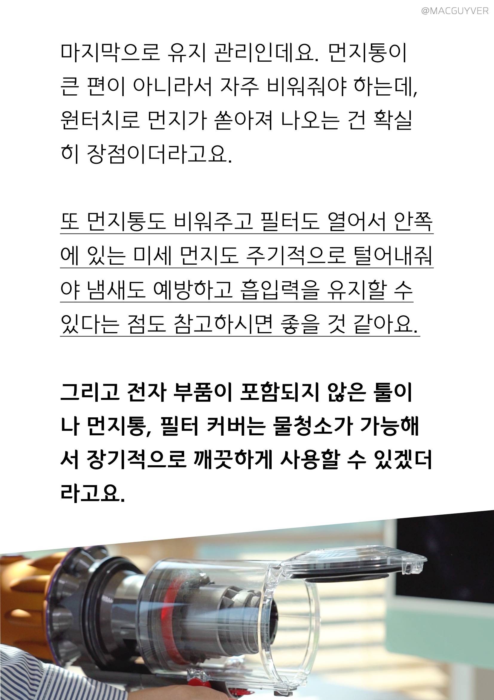 마지막으로 dyson 유지 관리인데요. 먼지통이 큰 편이 아니라서 자주 비워줘야 하는데, 원터치로 먼지가 쏟아져 나오는 건 확실히 장점이더라고요. 또 먼지통도 비워주고 필터도 열어서 안쪽에 있는 미세 먼지도 주기적으로 털어내줘야 냄새도 예방하고 흡입력을 유지할 수 있다는 점도 참고하시면 좋을 것 같아요. 그리고 다이슨V12 디텍트슬림은 전자 부품이 포함되지 않은 툴이나 먼지통, 필터 커버는 물청소가 가능해서 장기적으로 깨끗하게 사용할 수 있겠더라고요.