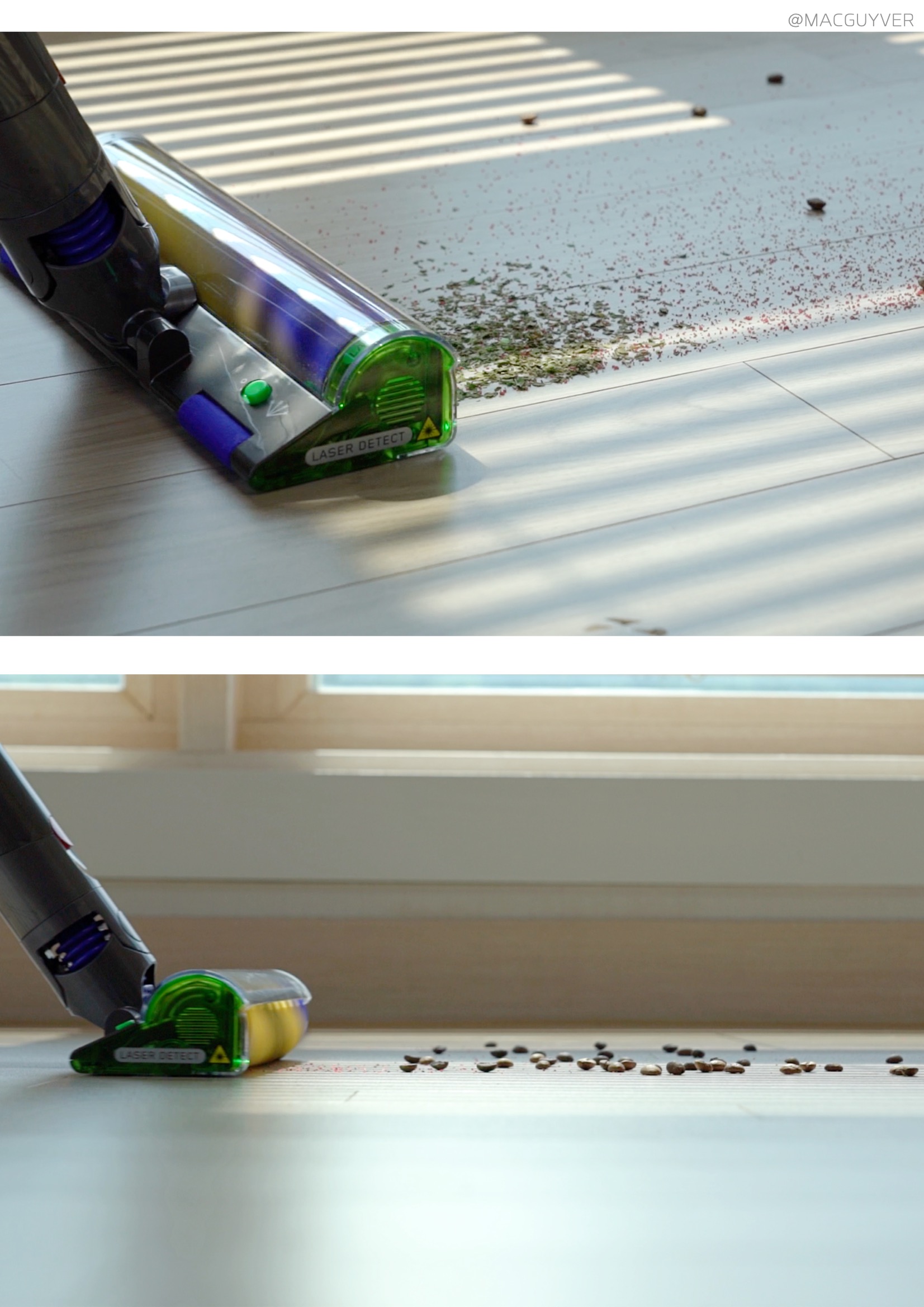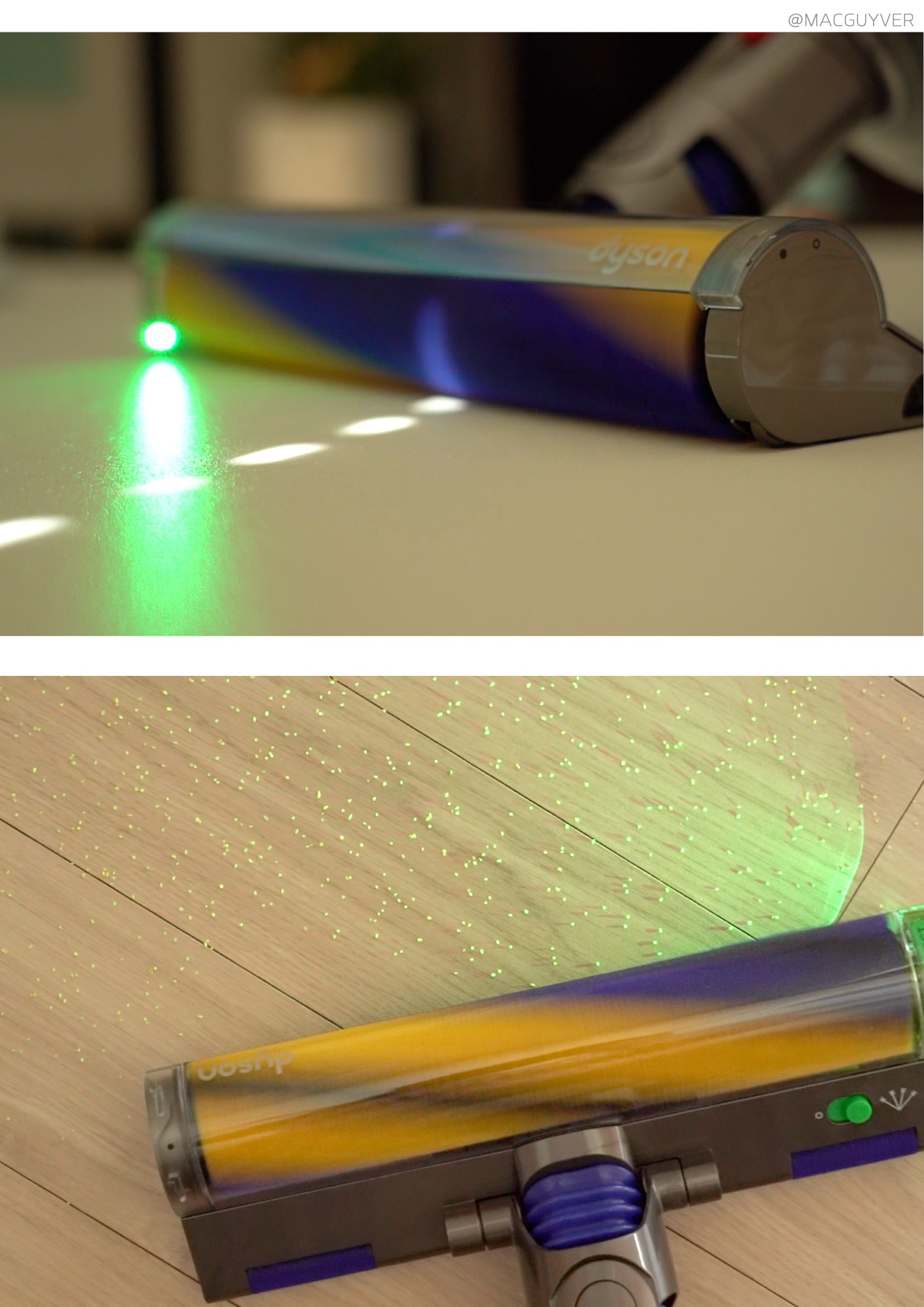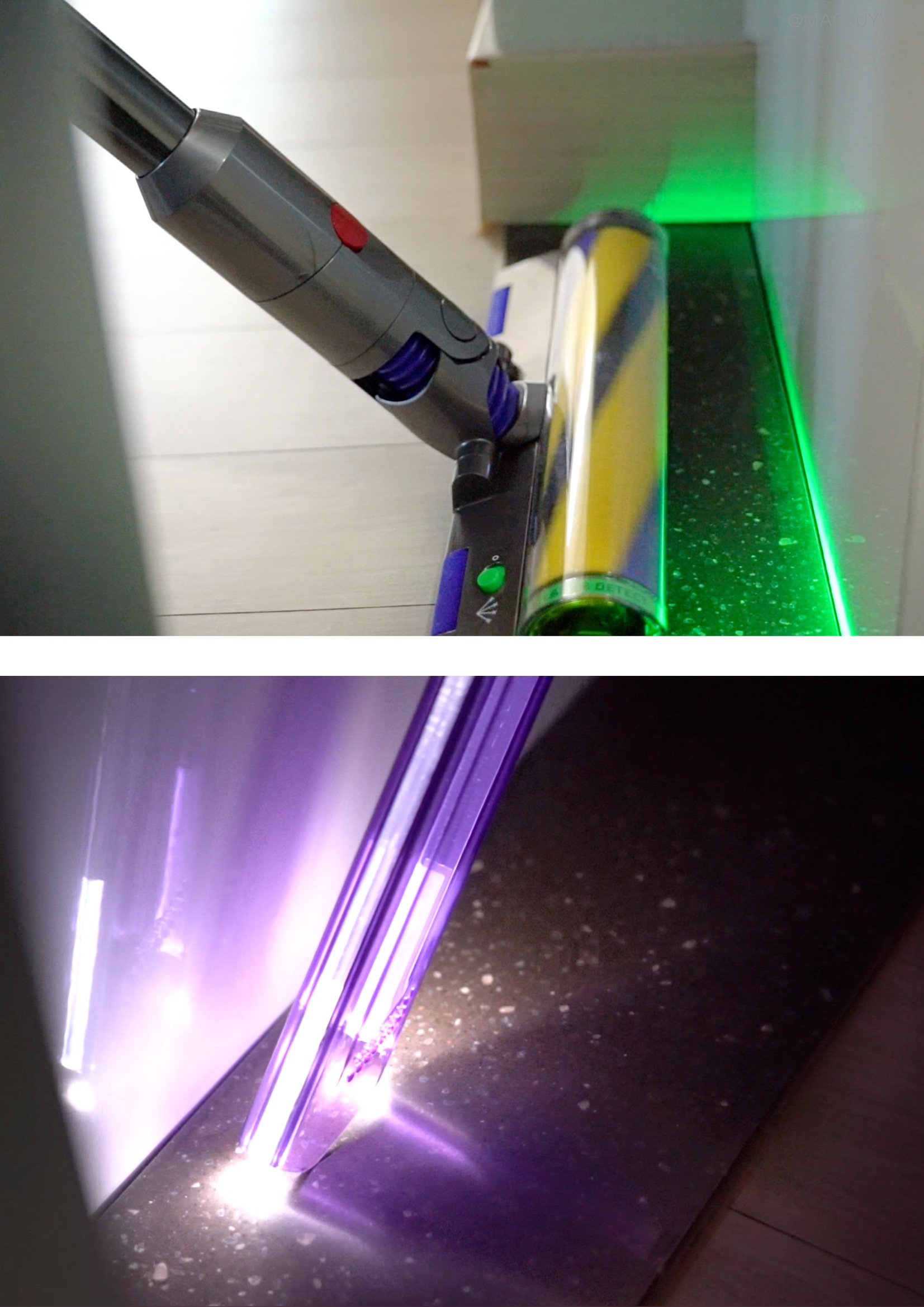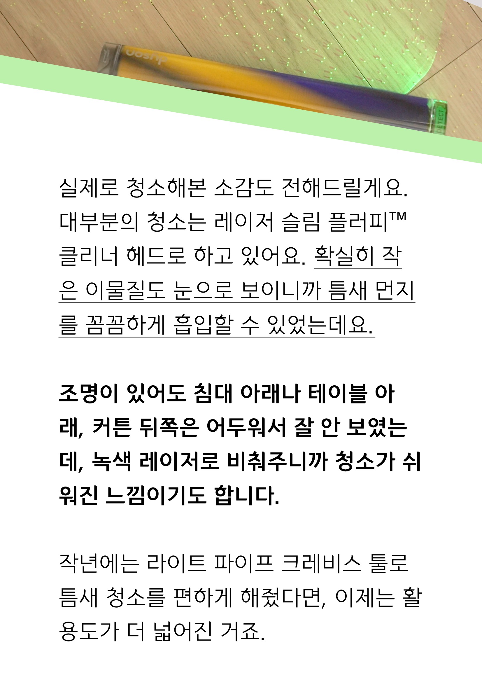 아마 이번다이슨 V12에서 새롭게 선보인 녹색 라이트가 가장 궁금하실 것 같아요. 레이저 디텍트 기술이라고도 하는데, 다른 컬러보다 시인성이 높은 녹색 레이저를 탑재해서 눈으로는 보기 힘든 먼지를 볼 수 있게 해줬어요. 조명이나 햇살이 강한 곳에서는 잘 안 보이고, 대부분의 실내에서나 어두운 곳에서 눈에 잘 보이지 않던 미세한 크기의 먼지들을 비춰주더라고요. 특히 바닥에서 활동량이 많은 어린 자녀를 둔 부모님들이 꼼꼼하게 청소할 수 있도록 도와줄 것 같은데요. 참고로, 다이슨 무선청소기 레이저 슬림 플러피 클리너 헤드는 다른 다이슨 청소기와 연결해도 사용이 가능합니다.