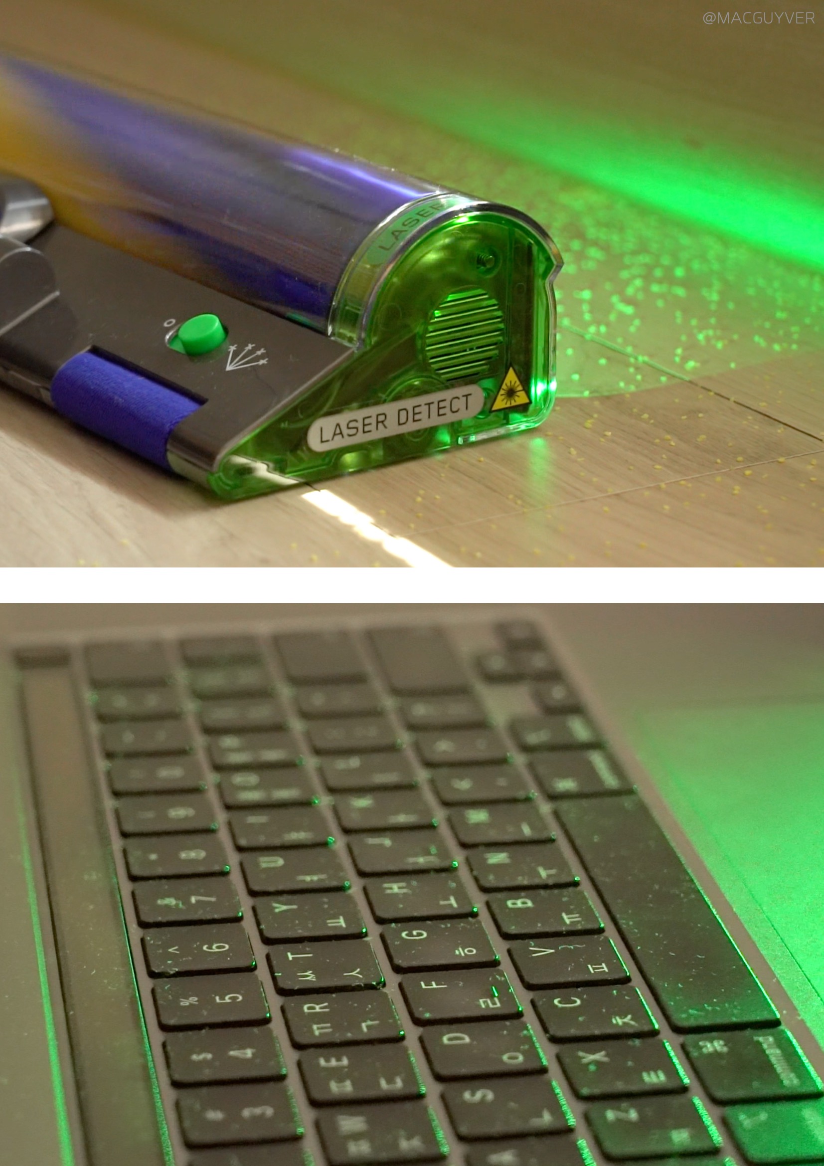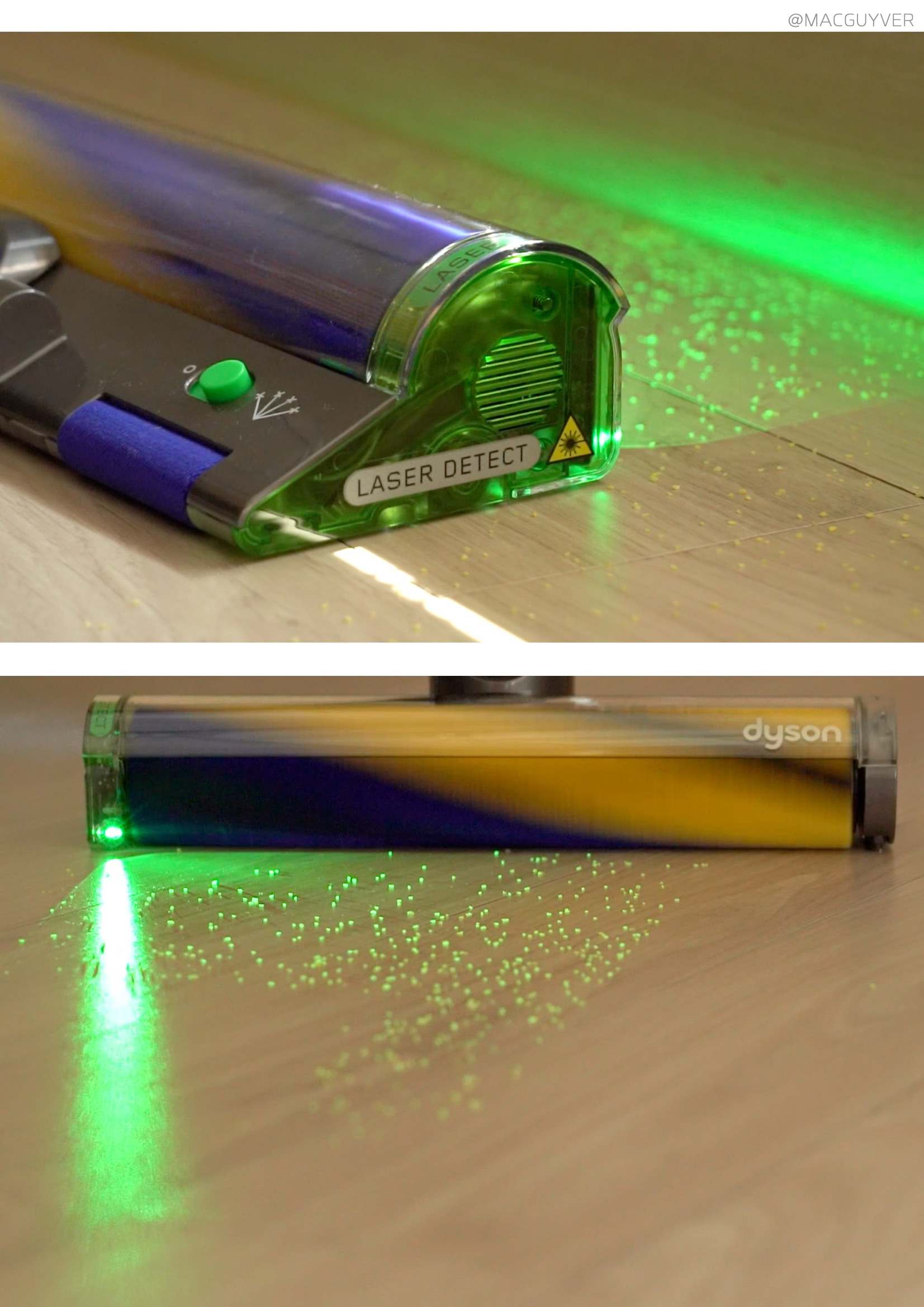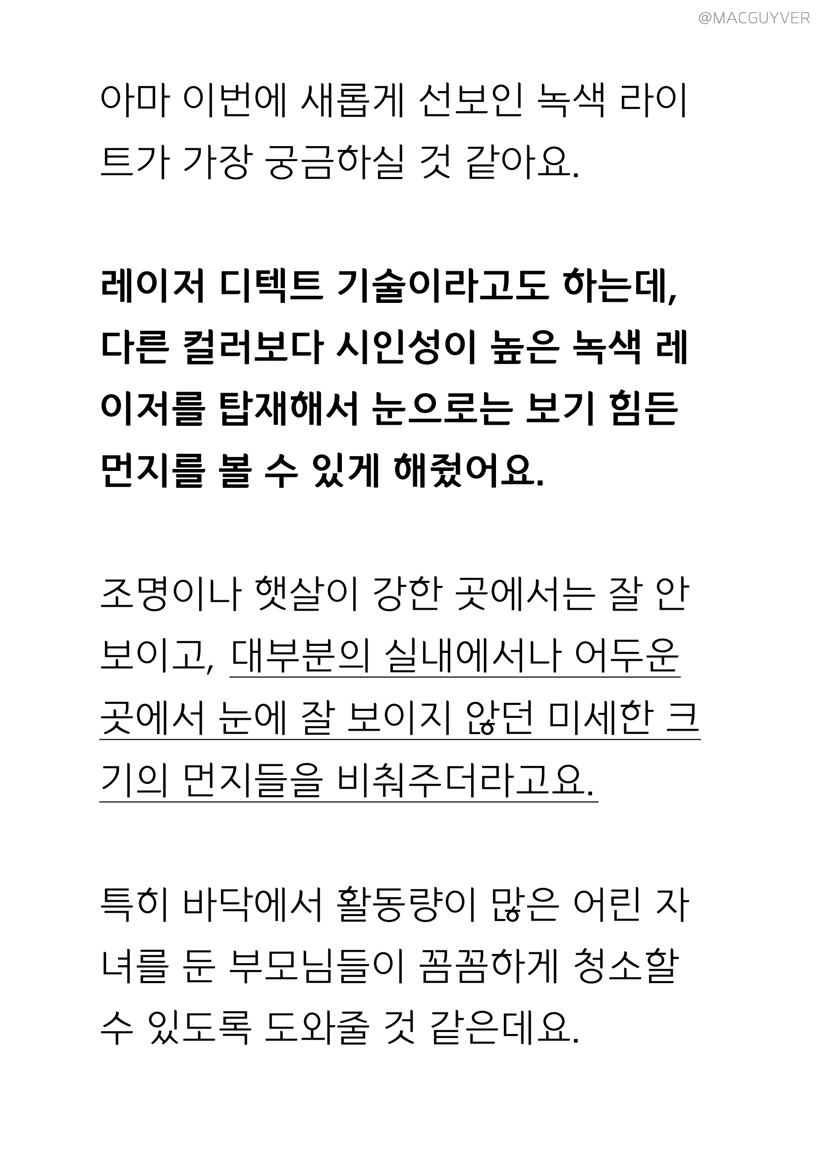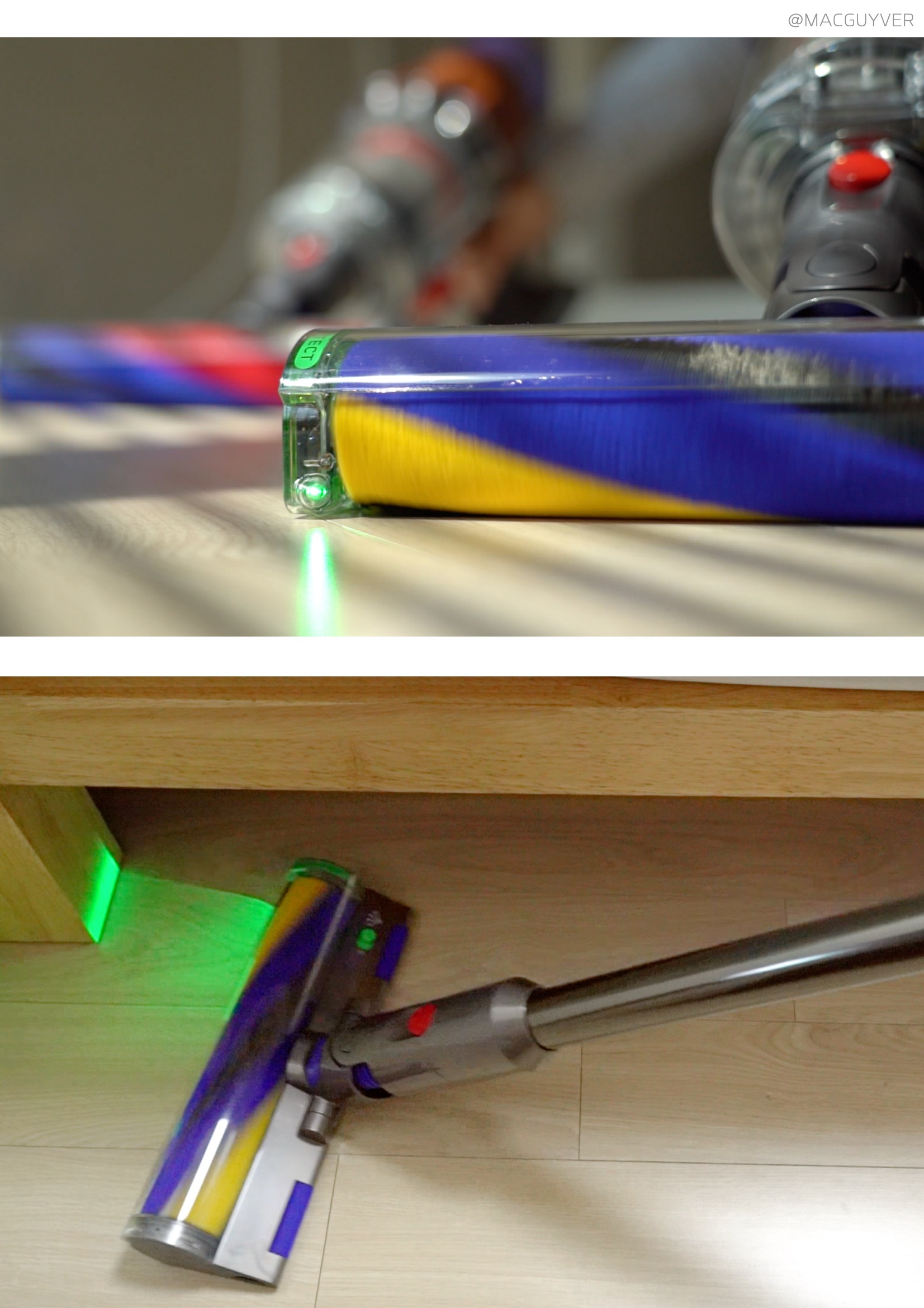 아마 이번다이슨 V12에서 새롭게 선보인 녹색 라이트가 가장 궁금하실 것 같아요. 레이저 디텍트 기술이라고도 하는데, 다른 컬러보다 시인성이 높은 녹색 레이저를 탑재해서 눈으로는 보기 힘든 먼지를 볼 수 있게 해줬어요. 조명이나 햇살이 강한 곳에서는 잘 안 보이고, 대부분의 실내에서나 어두운 곳에서 눈에 잘 보이지 않던 미세한 크기의 먼지들을 비춰주더라고요. 특히 바닥에서 활동량이 많은 어린 자녀를 둔 부모님들이 꼼꼼하게 청소할 수 있도록 도와줄 것 같은데요. 참고로, 다이슨 무선청소기 레이저 슬림 플러피 클리너 헤드는 다른 다이슨 청소기와 연결해도 사용이 가능합니다.