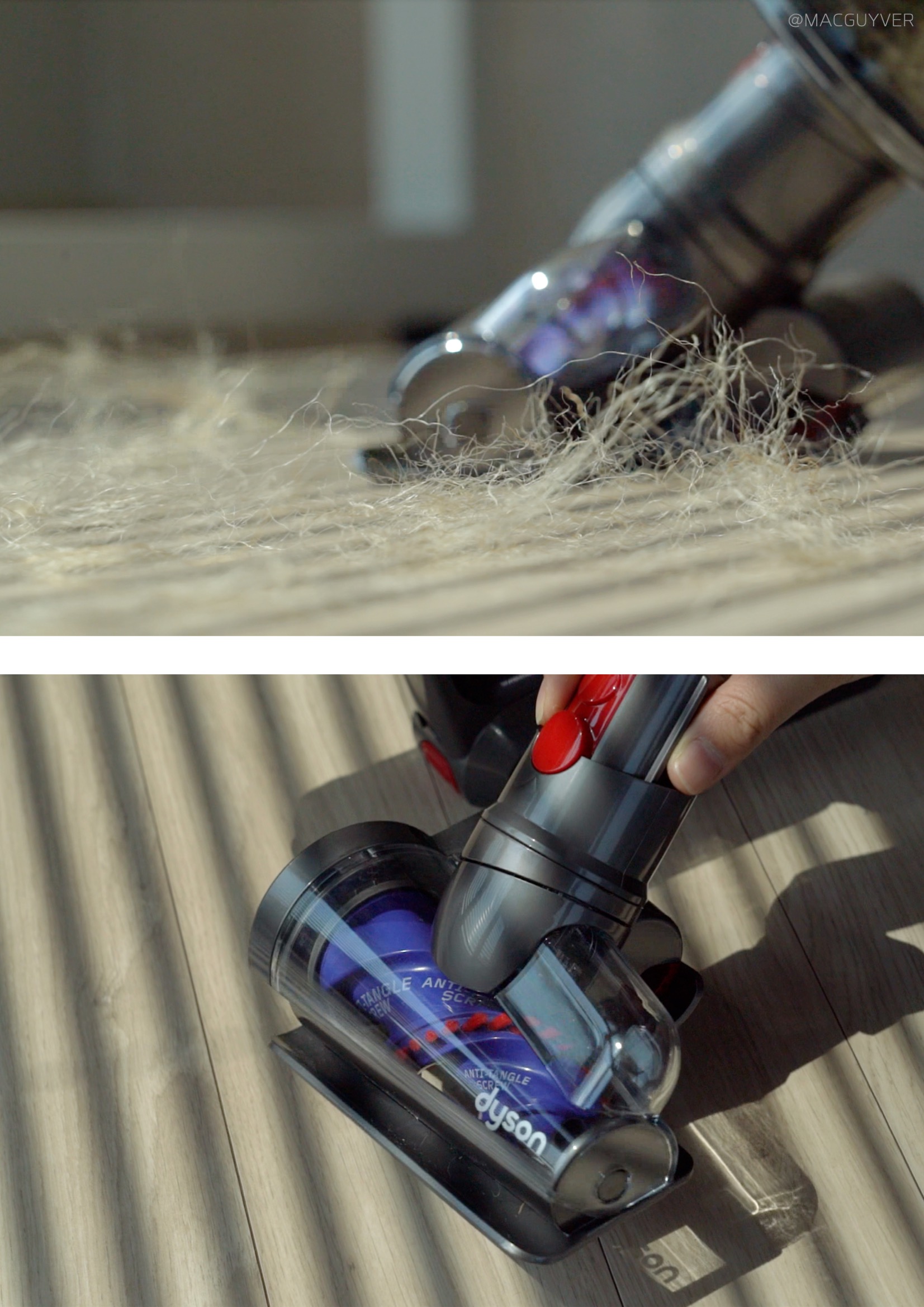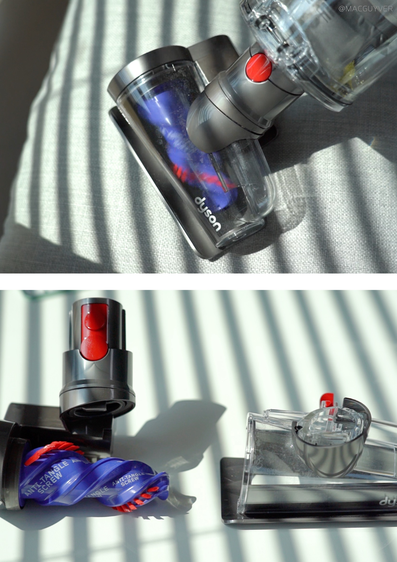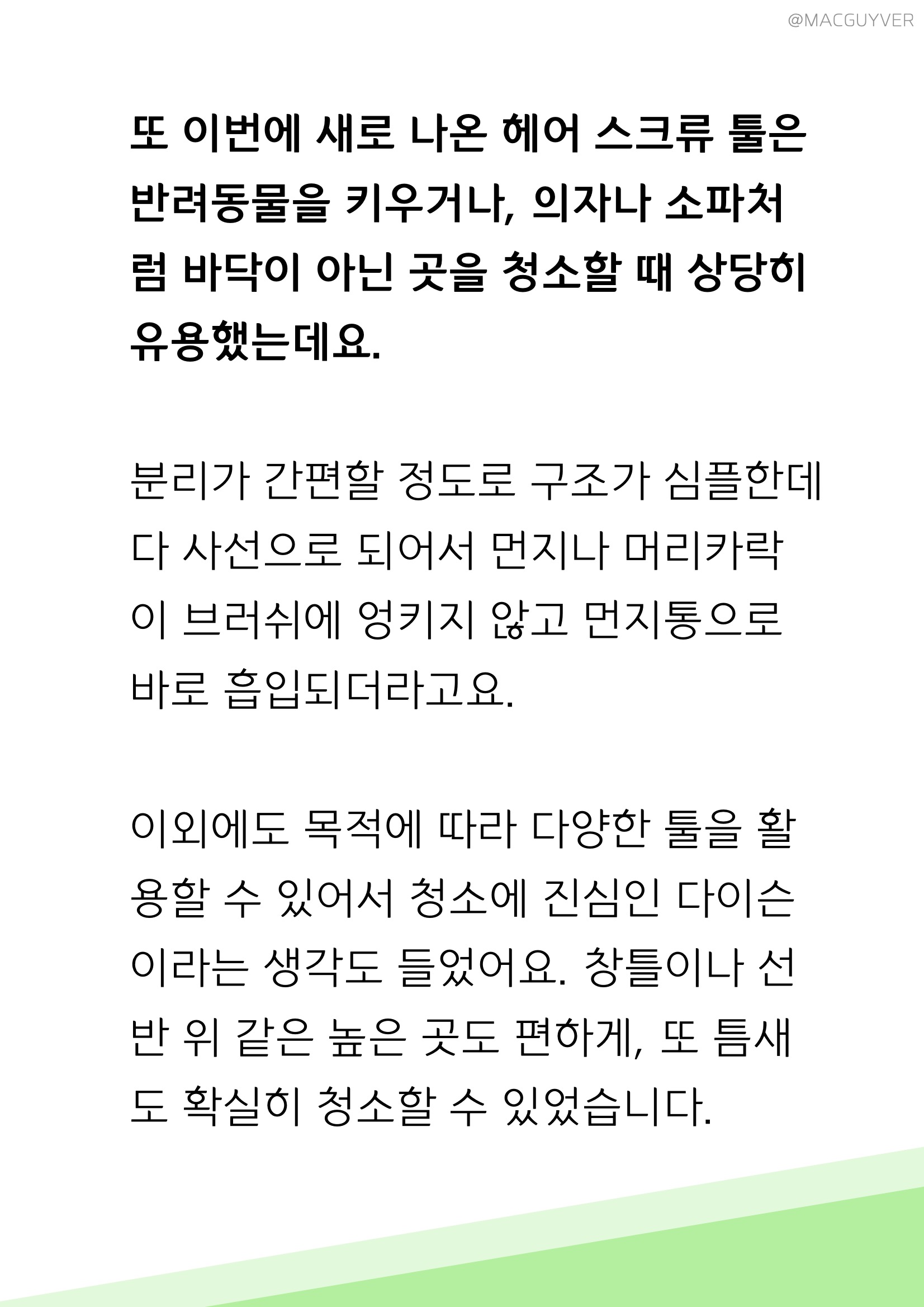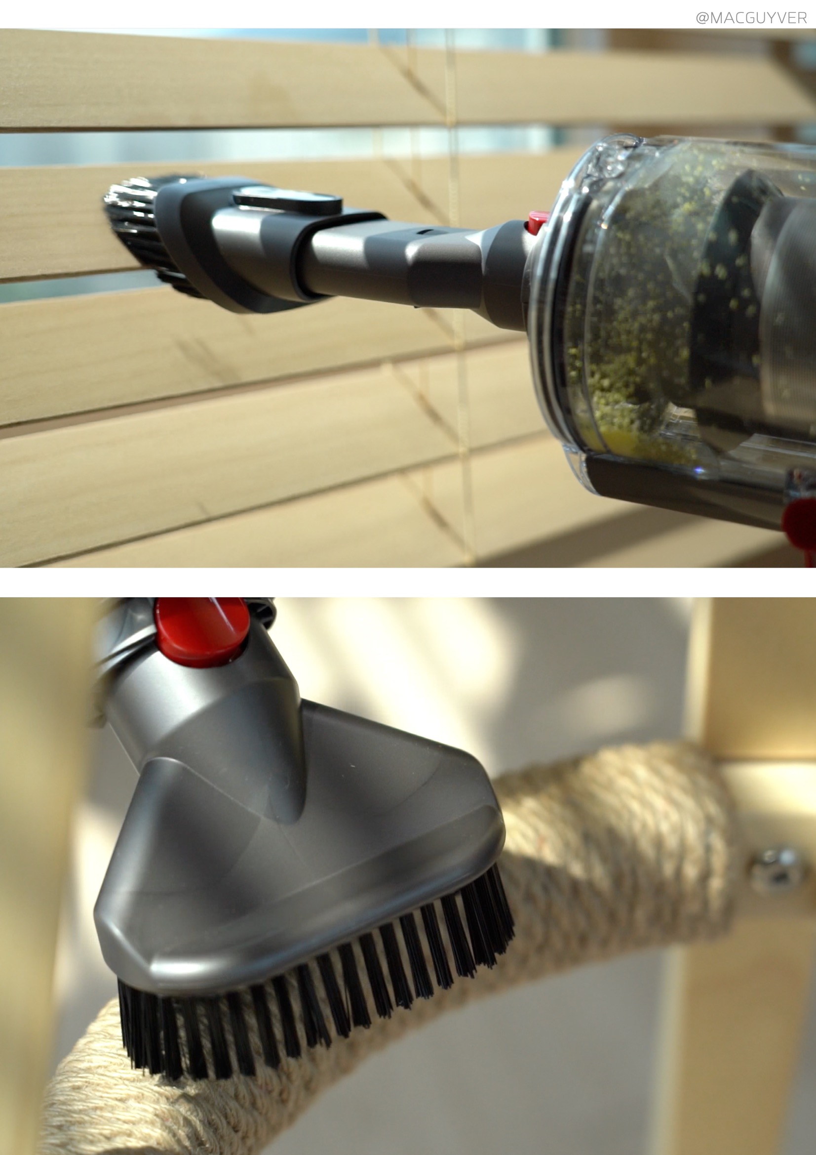 또 다이슨 V12의 새로 나온 헤어 스크류 툴은 반려동물을 키우거나, 의자나 소파처럼 바닥이 아닌 곳을 청소할 때 상당히 유용했는데요. 분리가 간편할 정도로 구조가 심플한데다 사선으로 되어서 먼지나 머리카락이 브러시에 엉키지 않고 먼지통으로 바로 흡입되더라고요. 이외에도 목적에 따라 다양한 툴을 활용할 수 있어서 청소에 진심인 다이슨이라는 생각도 들었어요. 다이슨V12 디텍트슬림으로 창틀이나 선반 위 같은 높은 곳도 편하게, 또 틈새도 확실히 청소할 수 있었습니다.