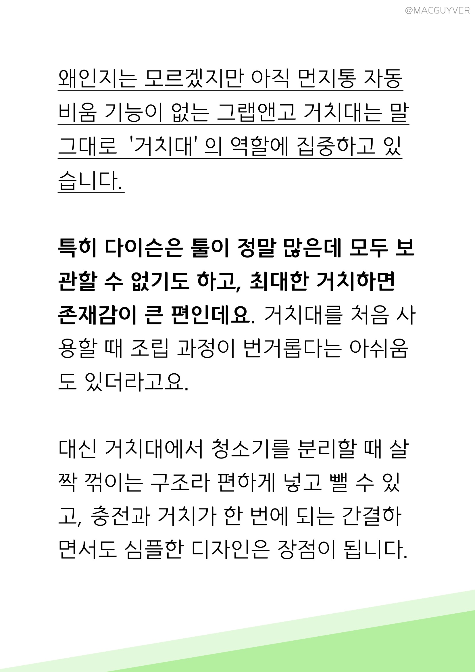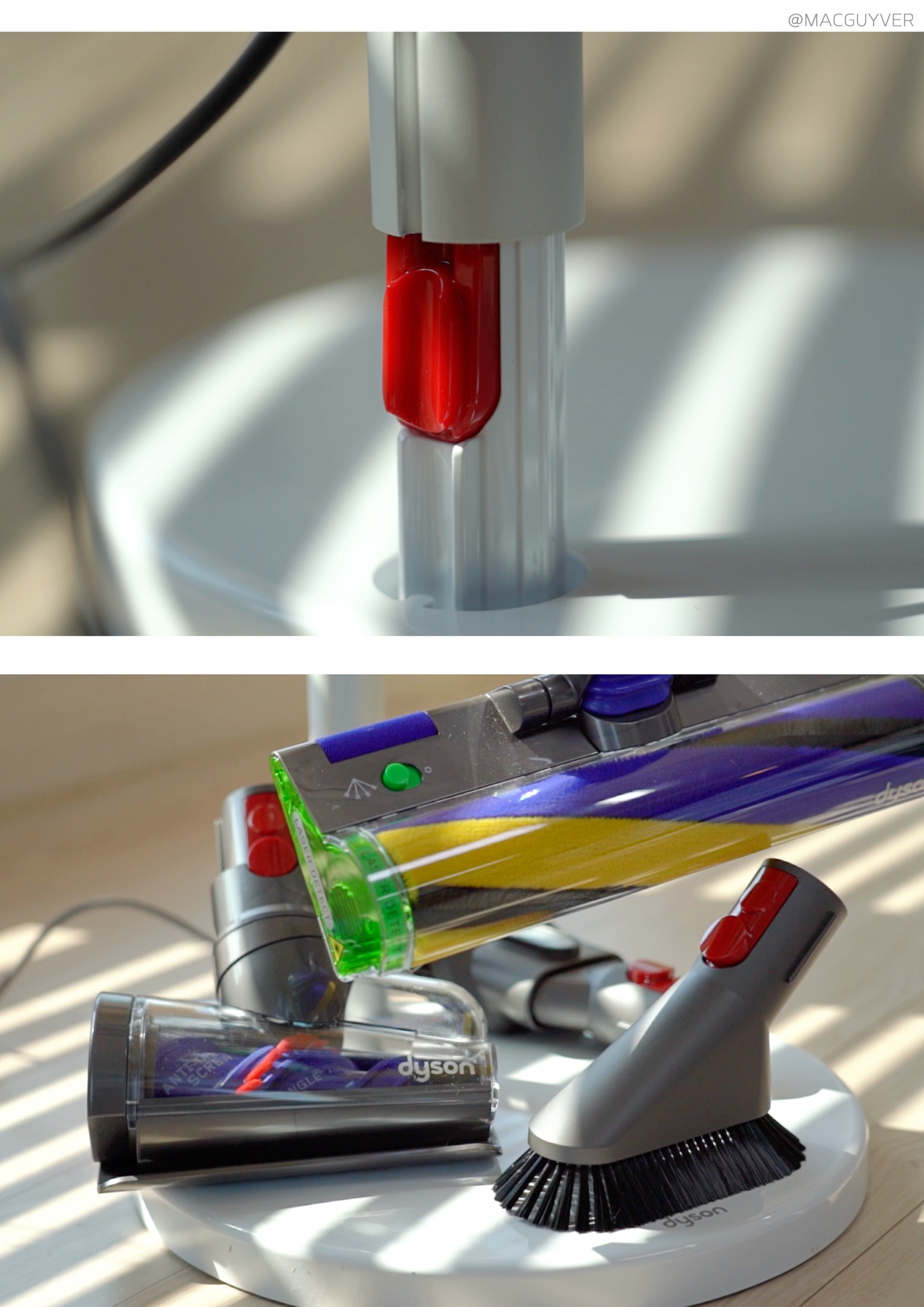참고로 가벼운청소기 다이슨 V12 디텍트 슬림™은 5단계 필터레이션 기술로 0.3 마이크론의 먼지까지 99.99% 포착해서 배출되는 공기에서 미세먼지가 거의 측정되지 않아서 안심이 되기도 했습니다. 왜인지는 모르겠지만 아직 먼지통 자동 비움 기능이 없는 그랩앤고 거치대는 말 그대로 ‘거치대’의 역할에 집중하고 있습니다. 특히 다이슨은 툴이 정말 많은데 모두 보관할 수 없기도 하고, 최대한 거치하면 존재감이 큰 편인데요. dyson 거치대를 처음 사용할 때 조립 과정이 번거롭다는 아쉬움도 있더라고요. 대신 거치대에서 청소기를 분리할 때 살짝 꺾이는 구조라 편하게 넣고 뺄 수 있고, 충전과 거치가 한 번에 되는 간결하면서도 심플한 디자인은 장점이 됩니다.