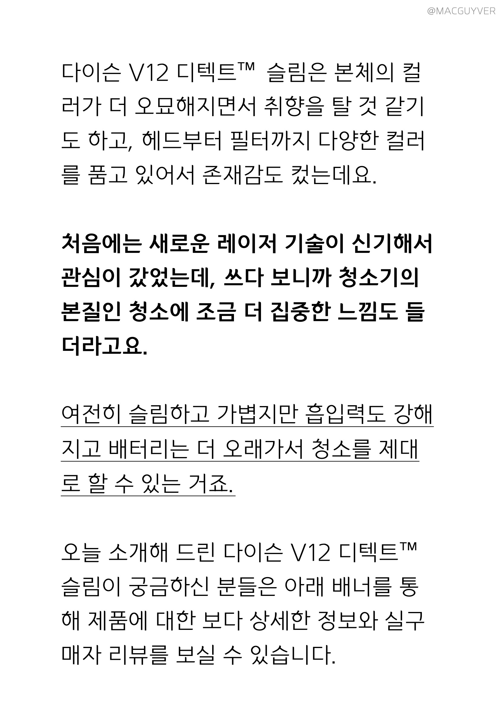 다이슨 V12 디텍트 슬림™은 본체의 컬러가 더 오묘해지면서 취향을 탈 것 같기도 하고, 헤드부터 필터까지 다양한 컬러를 품고 있어서 존재감도 컸는데요. 무선청소기추천 처음에는 dyson의 새로운 레이저 기술이 신기해서 관심이 갔었는데, 쓰다 보니까 청소기의 본질인 청소에 조금 더 집중한 느낌도 들더라고요. 여전히 슬림하고 가볍지만 흡입력도 강해지고 배터리는 더 오래가서 청소를 제대로 할 수 있는 거죠. 오늘 소개해 드린 다이슨청소기, 다이슨 V12 디텍트 슬림™이 궁금하신 분들은 아래 배너를 통해 제품에 대한 보다 상세한 정보와 실구매자 리뷰를 보실 수 있습니다.
