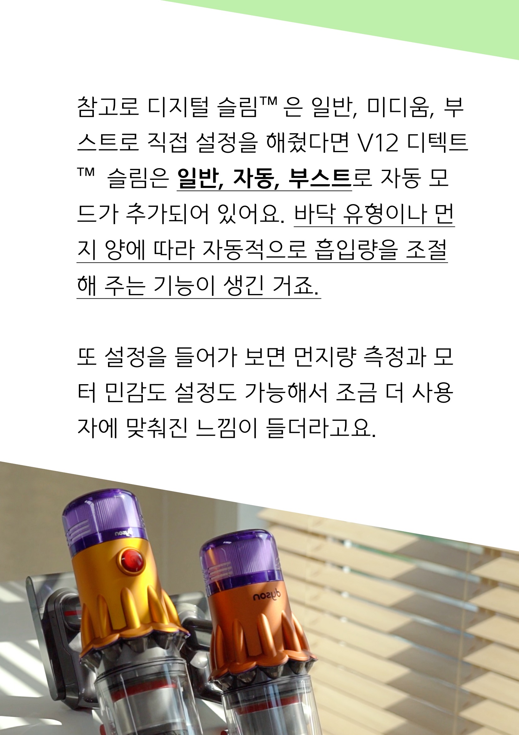 참고로 디지털 슬림은 일반, 미디움, 부스트로 직접 설정을 해줬다면 가벼운청소기 V12 디텍트 슬림™은 일반, 자동, 부스트로 자동 모드가 추가되어 있어요. 바닥 유형이나 먼지 양에 따라 자동적으로 흡입량을 조절해 주는 기능이 생긴 거죠. 또 설정을 들어가 보면 먼지량 측정과 모터 민감도 설정도 가능해서 조금 더 사용자에 맞춰진 느낌이 들더라고요. 실제로 청소해본 소감도 전해드릴게요. 대부분의 청소는 레이저 슬림 플러피 클리너 헤드로 하고 있어요. 확실히 다이슨 무선청소기로 작은 이물질도 눈으로 보이니까 틈새 먼지를 꼼꼼하게 흡입할 수 있었는데요. 조명이 있어도 침대 아래나 테이블 아래, 커튼 뒤쪽은 어두워서 잘 안 보였는데, 녹색 레이저로 비춰주니까 청소가 쉬워진 느낌이기도 합니다. 작년에는 라이트 파이프 크레비스 툴로 틈새 청소를 편하게 해줬다면, 이제는 활용도가 더 넓어진 거죠.