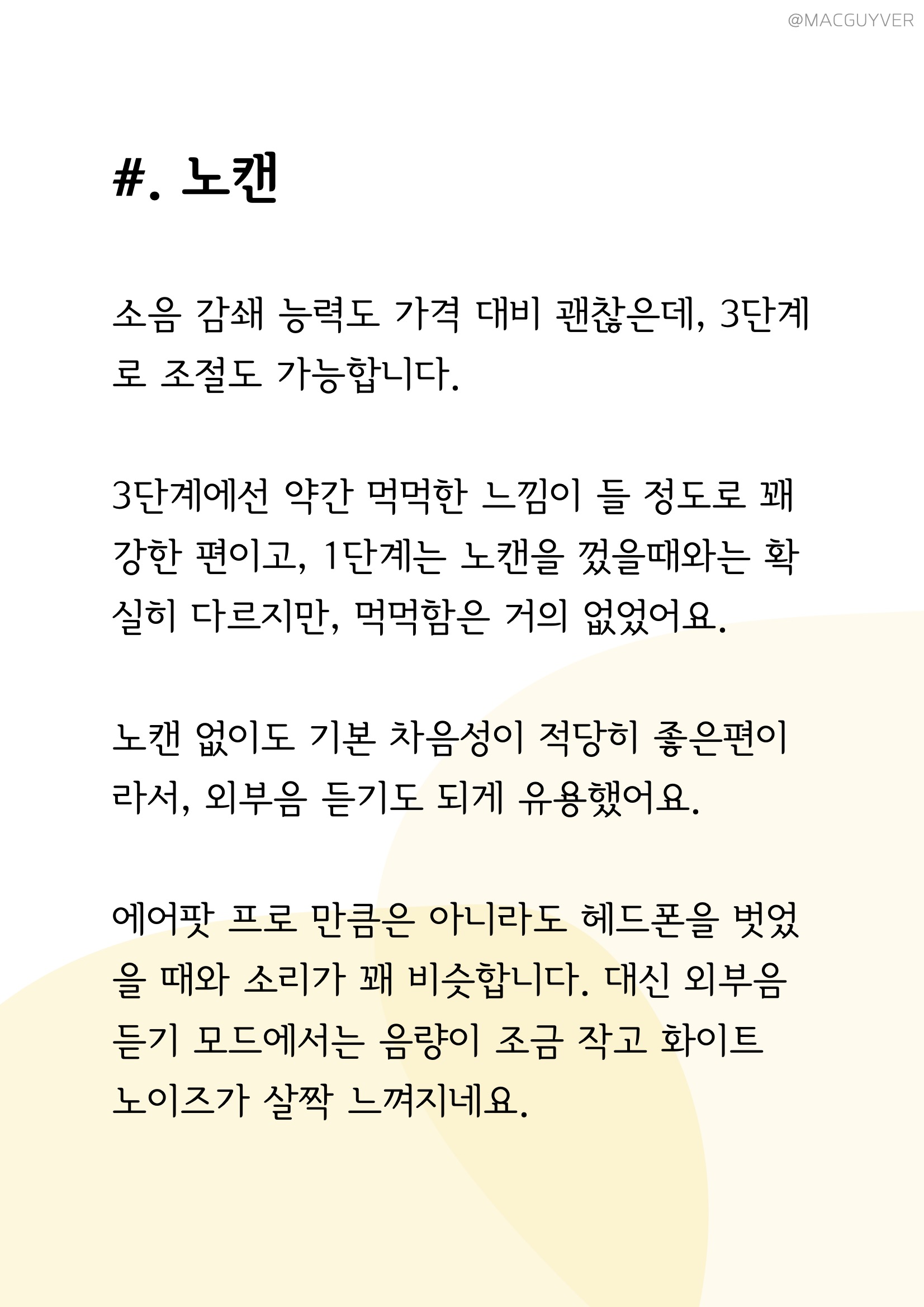 #. 노캔  이 노이즈캔슬링 무선 헤드폰은 소음 감쇄 능력도 가격 대비 괜찮은데, 3단계로 조절도 가능합니다.  3단계에선 약간 먹먹한 느낌이 들 정도로 꽤 강한 편이고, 1단계는 노캔을 껐을때와는 확실히 다르지만, 먹먹함은 거의 없었어요.   노캔 없이도 기본 차음성이 적당히 좋은편이라서, 외부음 듣기도 되게 유용했어요.   에어팟 프로 만큼은 아니라도 헤드폰을 벗었을 때와 소리가 꽤 비슷합니다. 대신 외부음 듣기 모드에서는 음량이 조금 작고 화이트 노이즈가 살짝 느껴지네요.
