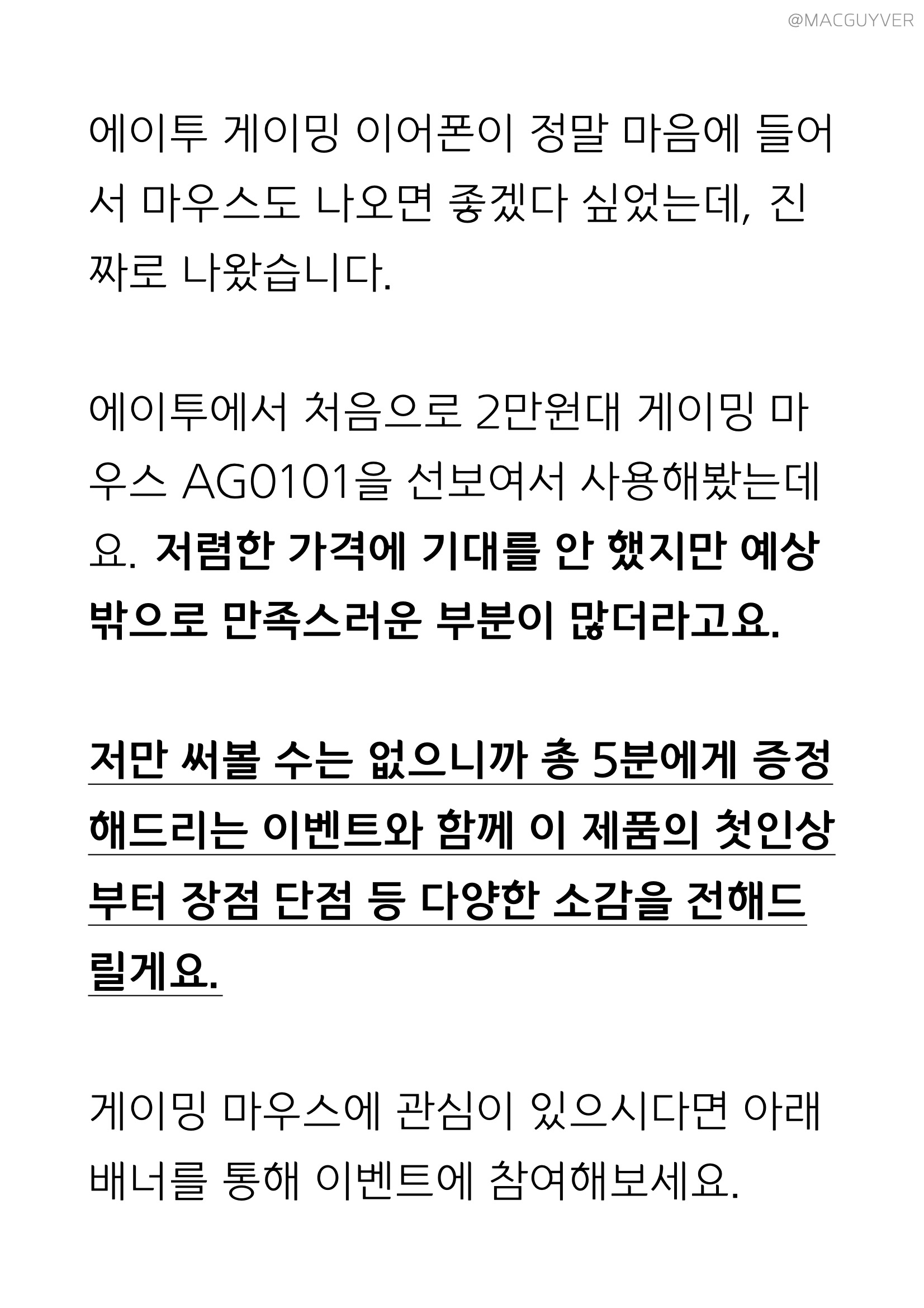 에이투 게이밍 이어폰이 정말 마음에 들어서 마우스도 나오면 좋겠다 싶었는데, 진짜로 나왔습니다. 에이투에서 처음으로 2만원대 게이밍 마우스 유선마우스 AG0101을 선보여서 사용해봤는데요. 저렴한 가격에 기대를 안 했지만 예상 밖으로 만족스러운 부분이 많더라고요. 저만 써볼 수는 없으니까 총 5분에게 증정해드리는 이벤트와 함께 이 제품의 첫인상부터 장점 단점 등 다양한 소감을 전해드릴게요.