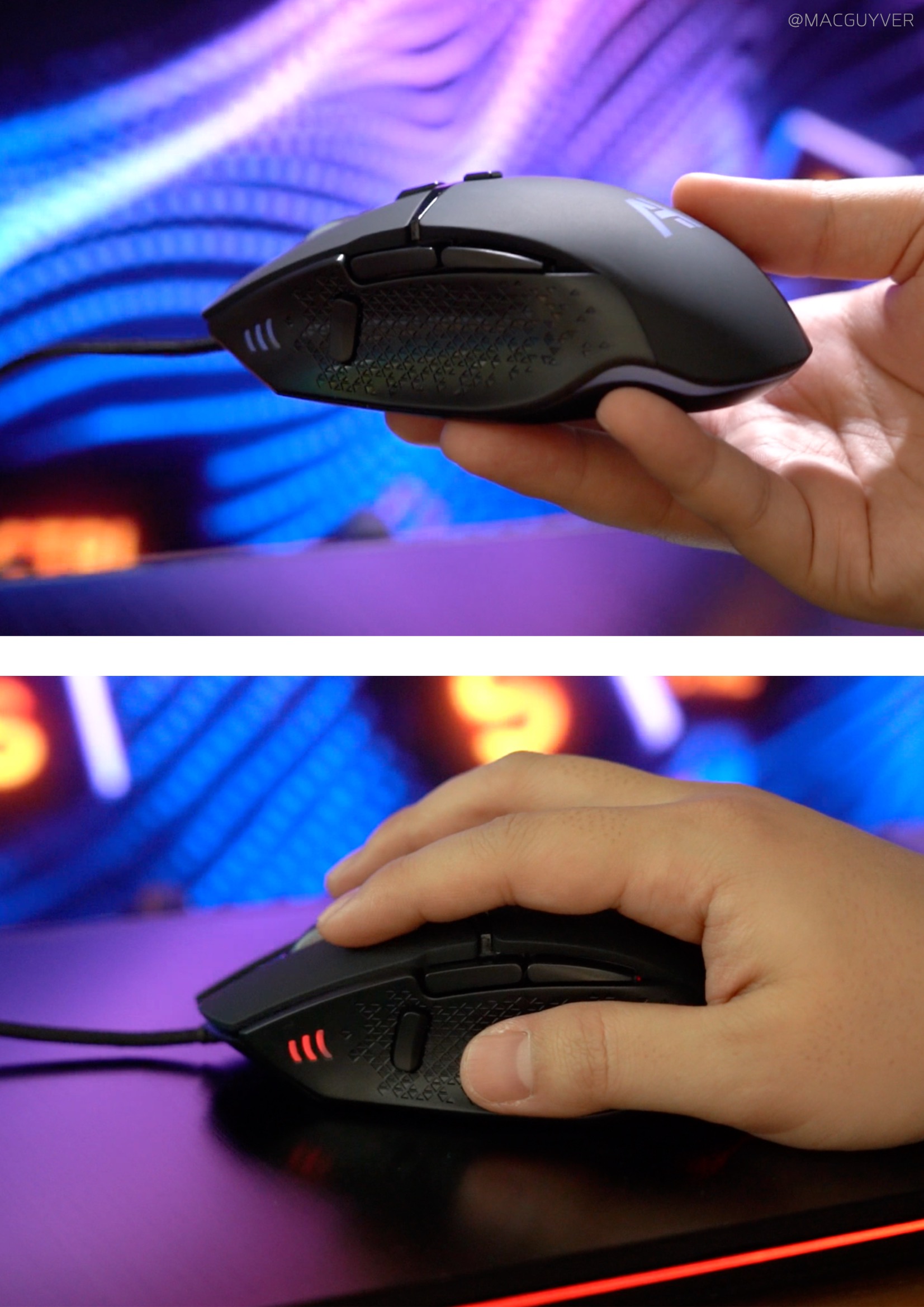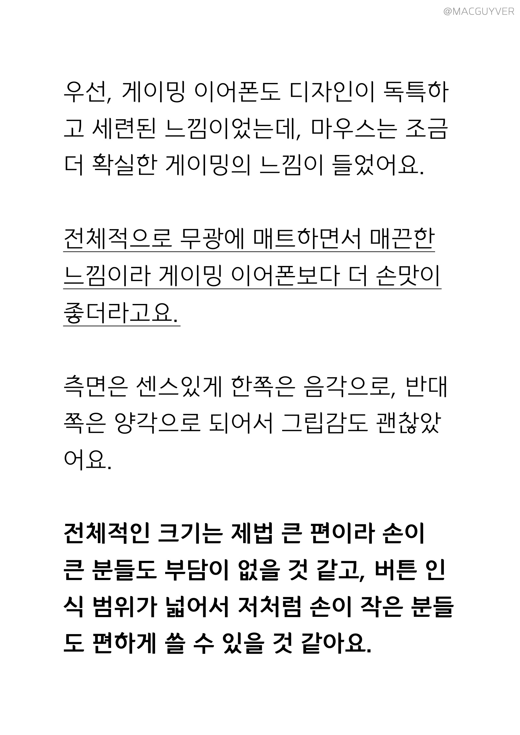 우선, 게이밍 이어폰도 디자인이 독특하고 세련된 느낌이었는데, 마우스는 조금 더 확실한 게이밍의 느낌이 들었어요. 전체적으로 무광에 매트하면서 매끈한 느낌이라 게이밍 이어폰보다 더 손맛이 좋더라고요. 측면은 센스있게 한쪽은 음각으로, 반대쪽은 양각으로 되어서 그립감도 괜찮았어요. 전체적인 크기는 제법 큰 편이라 손이 큰 분들도 부담이 없을 것 같고, 버튼 인식 범위가 넓어서 저처럼 손이 작은 분들도 편하게 쓸 수 있는 가성비마우스인 것 같아요. 비대칭 컴퓨터마우스 디자인이지만 과하지 않게 다듬어서 정돈된 느낌도 들었는데요. 대신 유광으로 마감된 부분은 유분이 잘 묻기도 합니다. 참고로 패키징은 제법 무난하고 마우스 디자인이나 크기가 보이더라고요.