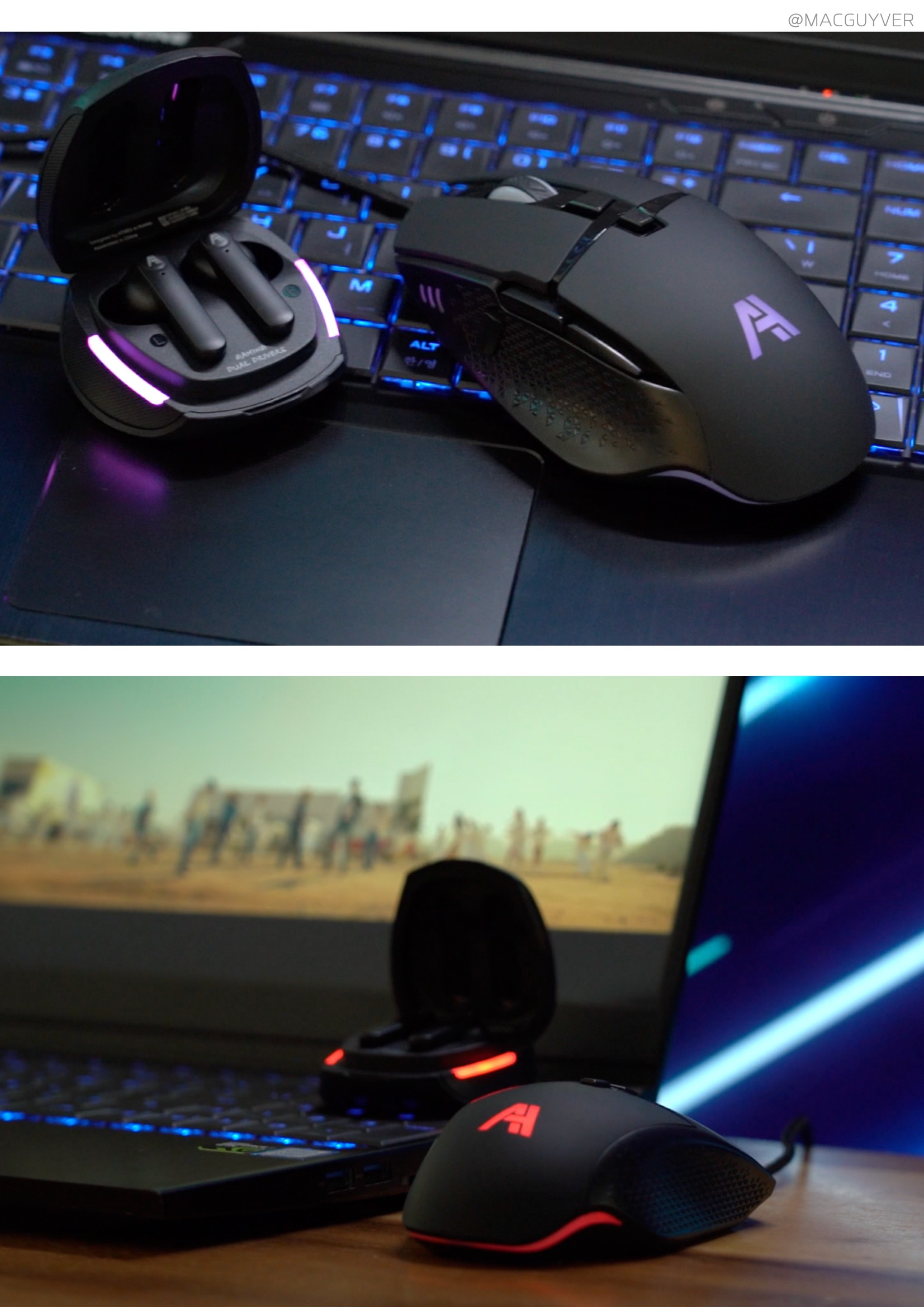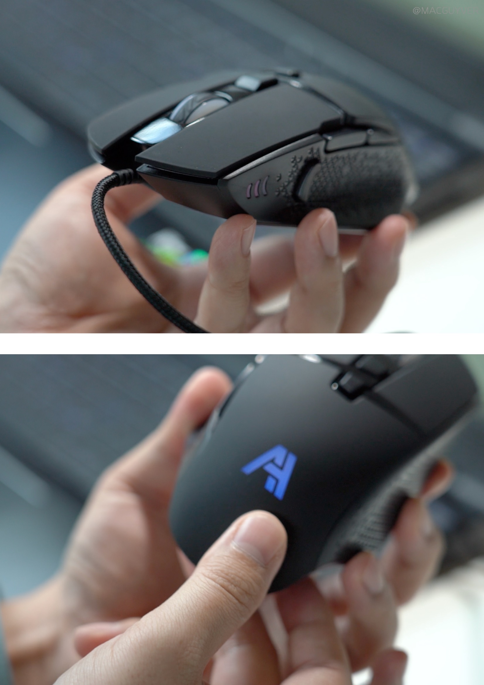 이어서 에이투 유선마우스 조명은 로고 부분이 가장 잘 보이고, 하단부는 간접 조명 느낌이에요. 측면은 안쪽으로만 조명이 있는데 강하지는 않습니다. 휠은 간접 조명의 느낌이라 조금 더 명확했으면 예쁘지 않을까 싶더라고요. 게이밍 이어폰은 더 명확하게 측면 조명이 나와서 이런 스타일을 적용해도 좋을 것 같은 거죠. 게이밍마우스 AG0101 조명은 주변 조명이 있을 때는 눈에 띄지 않았는데요. 컬러 커스텀이나 이펙트 조절은 안되고 대신 DPI 설정을 할 때 컬러로 쉽게 확인이 가능했어요.
