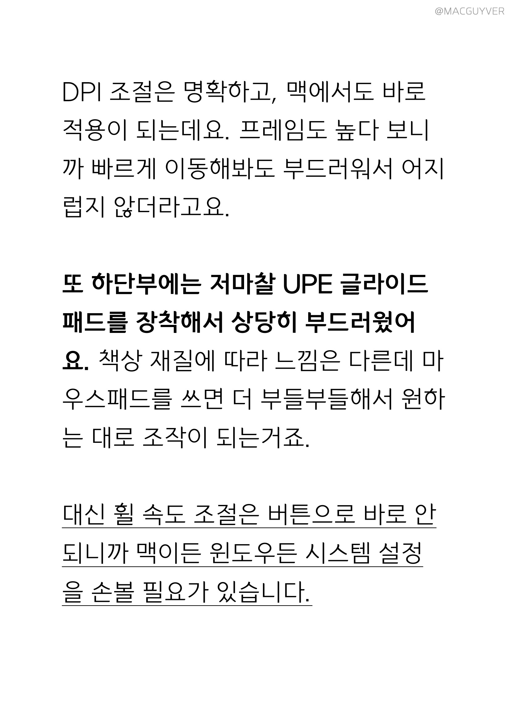 게이밍마우스 DPI 조절은 명확하고, 맥에서도 바로 적용이 되는데요. 프레임도 높다 보니까 빠르게 이동해봐도 부드러워서 어지럽지 않더라고요. 또 하단부에는 저마찰 UPE 글라이드패드를 장착해서 상당히 부드러웠어요. 책상 재질에 따라 느낌은 다른데 마우스패드를 쓰면 더 부들부들해서 원하는 대로 조작이 되는거죠. 대신 게이밍마우스 휠 속도 조절은 버튼으로 바로 안되니까 맥이든 윈도우든 시스템 설정을 손볼 필요가 있습니다.