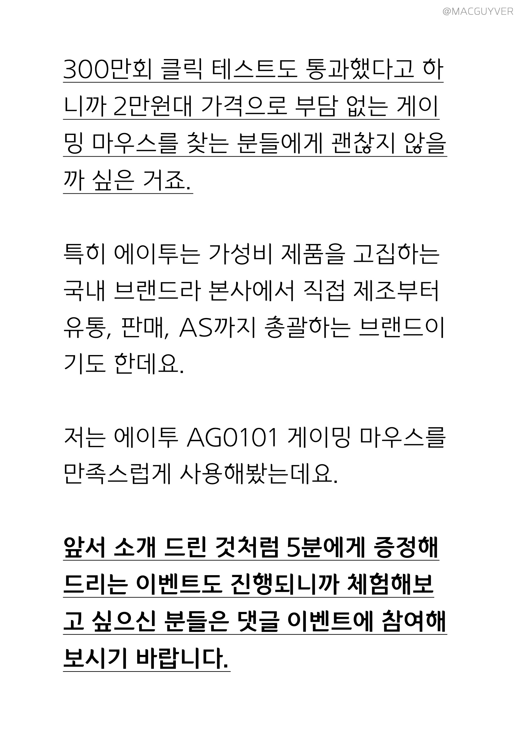 유선마우스 AG0101은 에이투 자체 ATDC를 탑재해서 마우스 감도와 반응 속도를 최적화했다고 해요. 또 40mm의 높이로 로지텍 MX 시리즈보다는 낮고 매직 마우스2보다는 높아서 그립감도 제법 괜찮았어요. 300만회 클릭 테스트도 통과했다고 하니까 2만원대 가격으로 부담 없는 게이밍 마우스를 찾는 분들에게 괜찮지 않을까 싶은 거죠. 특히 에이투는 가성비 제품을 고집하는 국내 브랜드라 본사에서 직접 제조부터 유통, 판매, AS까지 총괄하는 브랜드이기도 한데요. 저는 에이투 AG0101 게이밍 마우스, 키보드마우스를 만족스럽게 사용해봤는데요. 앞서 소개 드린 것처럼 6분에게 증정해드리는 이벤트도 진행되니까 체험해보고 싶으신 분들은 댓글 이벤트에 참여해보시기 바랍니다.