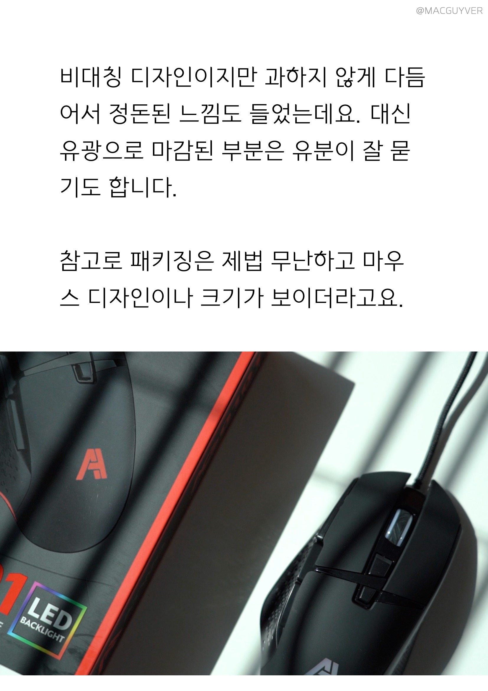 우선, 게이밍 이어폰도 디자인이 독특하고 세련된 느낌이었는데, 마우스는 조금 더 확실한 게이밍의 느낌이 들었어요. 전체적으로 무광에 매트하면서 매끈한 느낌이라 게이밍 이어폰보다 더 손맛이 좋더라고요. 측면은 센스있게 한쪽은 음각으로, 반대쪽은 양각으로 되어서 그립감도 괜찮았어요. 전체적인 크기는 제법 큰 편이라 손이 큰 분들도 부담이 없을 것 같고, 버튼 인식 범위가 넓어서 저처럼 손이 작은 분들도 편하게 쓸 수 있는 가성비마우스인 것 같아요. 비대칭 컴퓨터마우스 디자인이지만 과하지 않게 다듬어서 정돈된 느낌도 들었는데요. 대신 유광으로 마감된 부분은 유분이 잘 묻기도 합니다. 참고로 패키징은 제법 무난하고 마우스 디자인이나 크기가 보이더라고요.