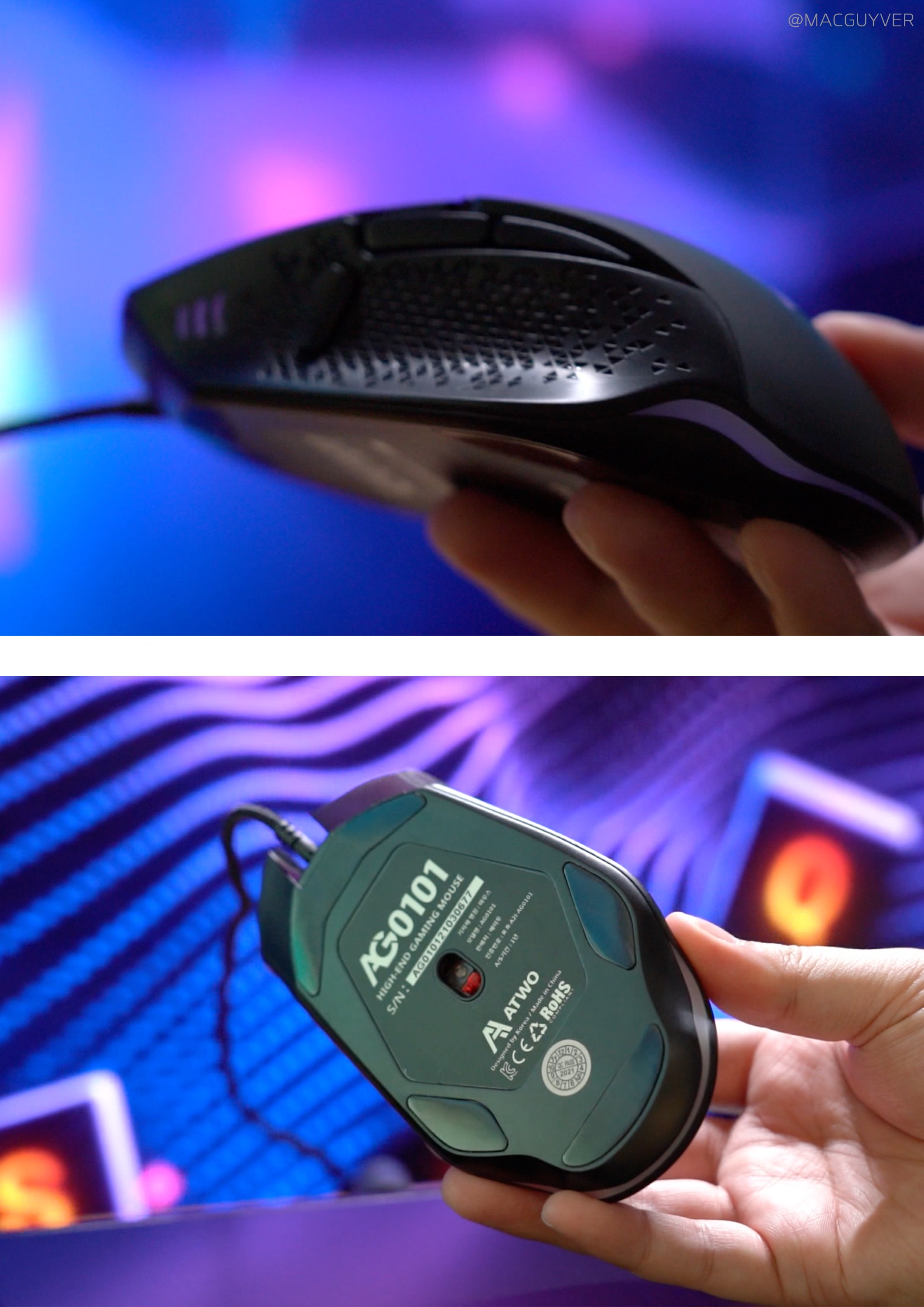 이어서 에이투 유선마우스 조명은 로고 부분이 가장 잘 보이고, 하단부는 간접 조명 느낌이에요. 측면은 안쪽으로만 조명이 있는데 강하지는 않습니다. 휠은 간접 조명의 느낌이라 조금 더 명확했으면 예쁘지 않을까 싶더라고요. 게이밍 이어폰은 더 명확하게 측면 조명이 나와서 이런 스타일을 적용해도 좋을 것 같은 거죠. 게이밍마우스 AG0101 조명은 주변 조명이 있을 때는 눈에 띄지 않았는데요. 컬러 커스텀이나 이펙트 조절은 안되고 대신 DPI 설정을 할 때 컬러로 쉽게 확인이 가능했어요.