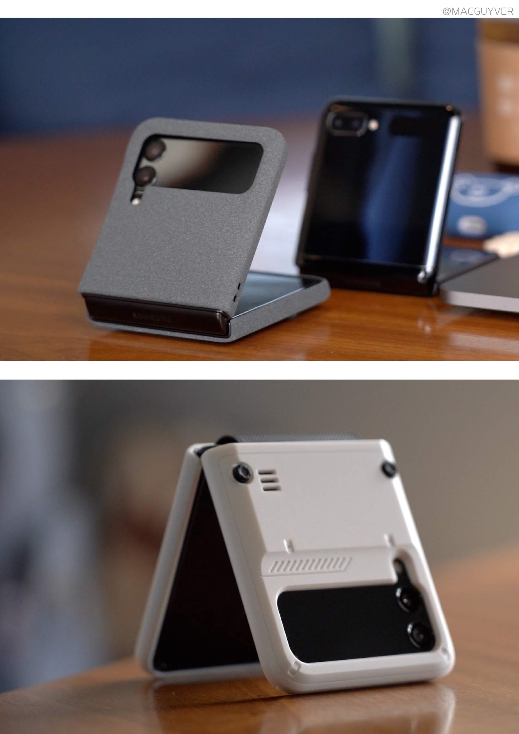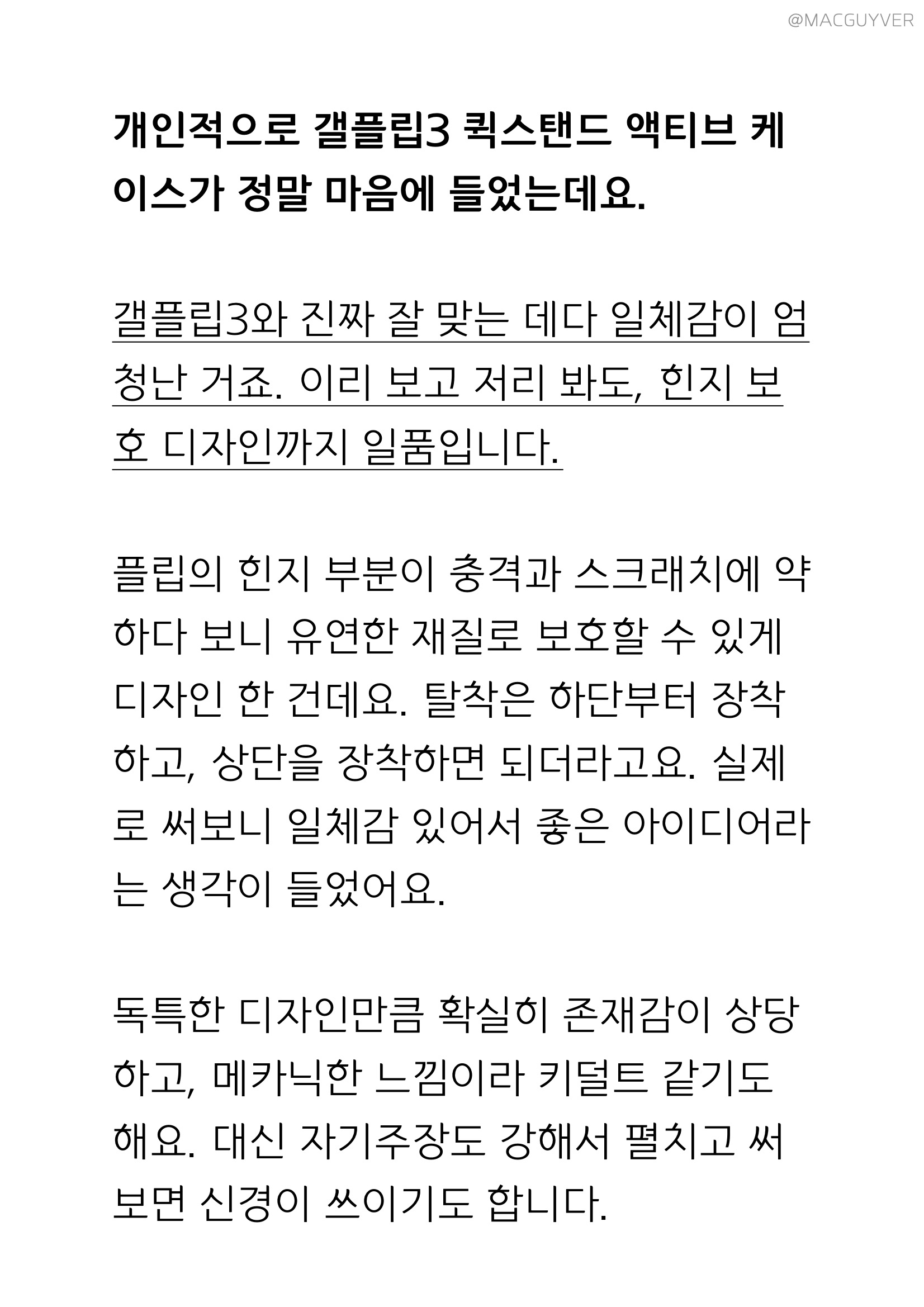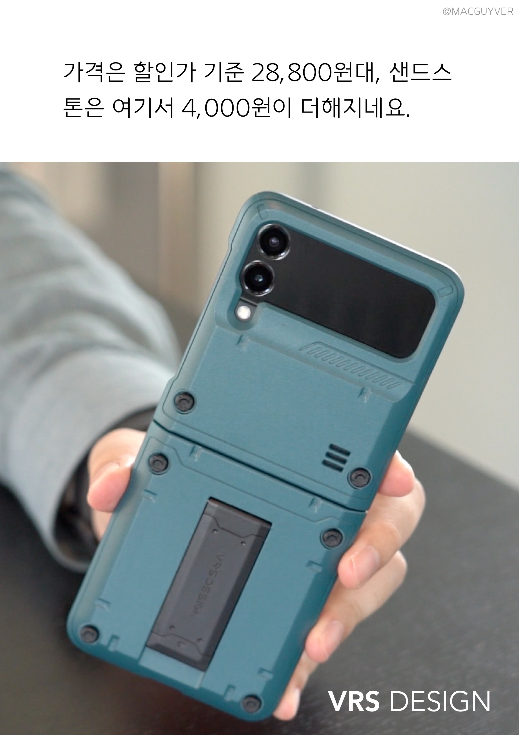 우선 샌드스톤은 총 4가지로 하드드롭을 제외하면 모두 퀵스탠드가 있어요. 재질감이 있는 돌처럼 손맛이 끝내줍니다. 물론 독특한 느낌만큼 존재감도 상당하죠. 탈착은 심장이 떨어질 듯 뻑뻑해요. 자주 탈착하기에는 조금 부담스러운데요. 물론 전용 테이핑도 가능하니까 실수로 벗겨질 일은 절대 없을 것 같네요. 확실히 ‘다른’ 케이스를 찾는 분들, 또 만질 때마다 ‘다른’ 손맛을 원하는 분들에게 알맞을 것 같습니다. 개인적으로 갤플립3 퀵스탠드 액티브 케이스가 정말 마음에 들었는데요. 갤럭시플립3 케이스는 갤플립3와 진짜 잘 맞는 데다 일체감이 엄청난 거죠. 이리 보고 저리 봐도, 힌지 보호 디자인까지 일품입니다. 플립의 힌지 부분이 충격과 스크래치에 약하다 보니 유연한 재질로 보호할 수 있게 디자인 한 건데요. 탈착은 하단부터 장착하고, 상단을 장착하면 되더라고요. 실제로 써보니 일체감 있어서 좋은 아이디어라는 생각이 들었어요. Z플립3 케이스의 독특한 디자인만큼 확실히 존재감이 상당하고, 메카닉한 느낌이라 키덜트 같기도 해요. 대신 자기주장도 강해서 펼치고 써보면 신경이 쓰이기도 합니다. 가격은 할인가 기준 28,800원대, 샌드스톤은 여기서 4,000원이 더해지네요.