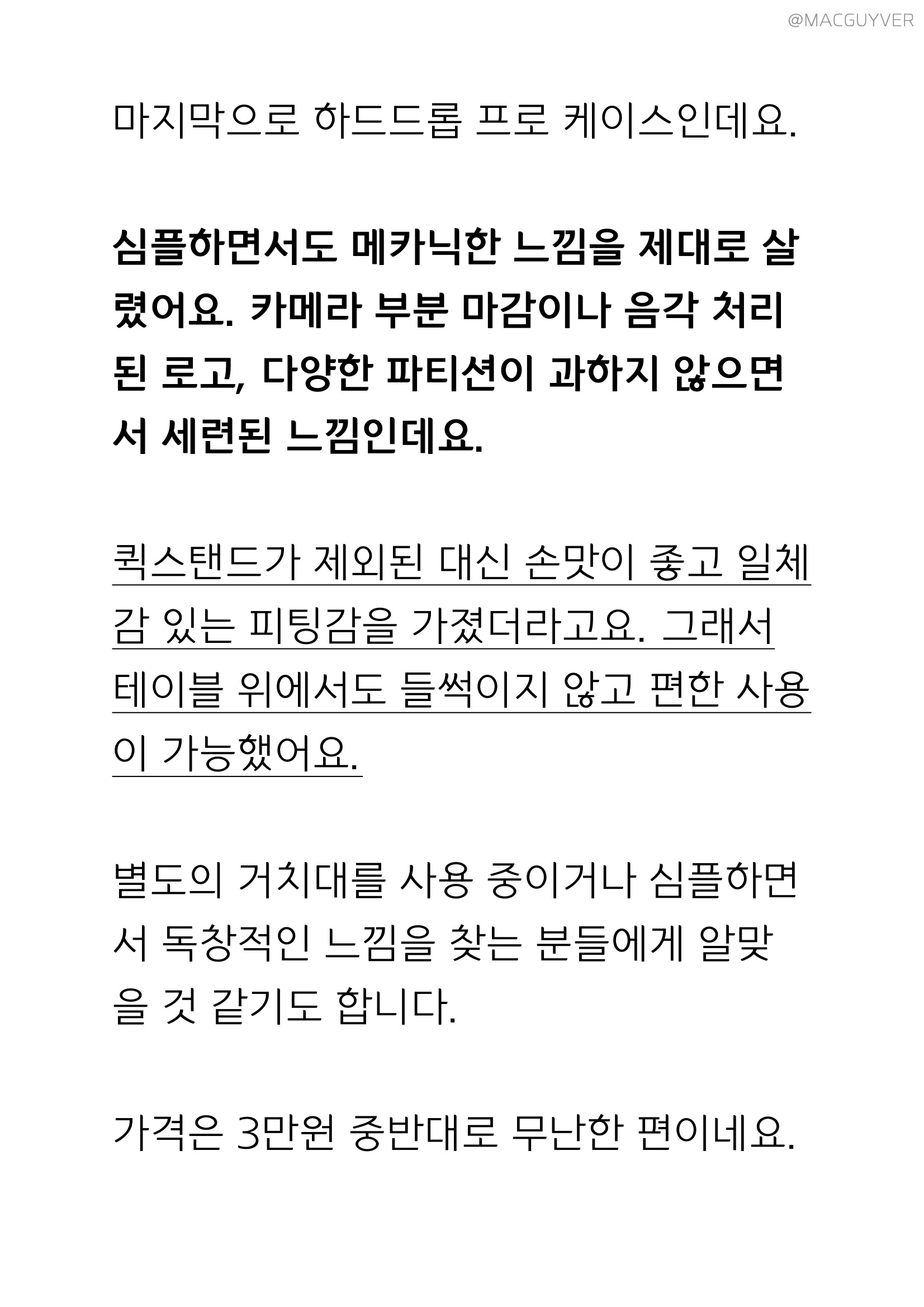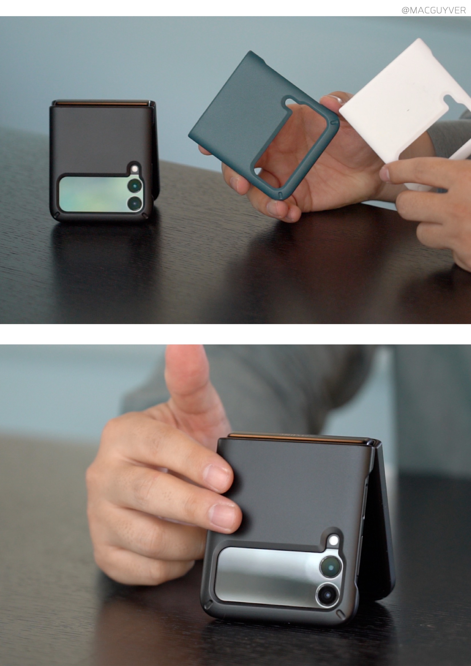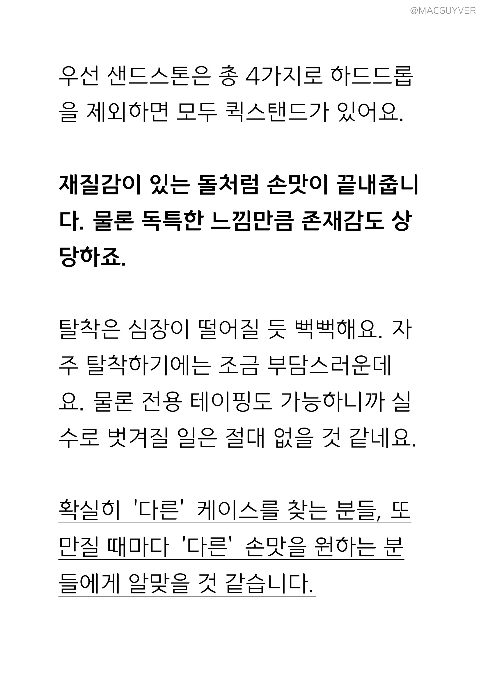 우선 샌드스톤은 총 4가지로 하드드롭을 제외하면 모두 퀵스탠드가 있어요. 재질감이 있는 돌처럼 손맛이 끝내줍니다. 물론 독특한 느낌만큼 존재감도 상당하죠. 탈착은 심장이 떨어질 듯 뻑뻑해요. 자주 탈착하기에는 조금 부담스러운데요. 물론 전용 테이핑도 가능하니까 실수로 벗겨질 일은 절대 없을 것 같네요. 확실히 ‘다른’ 케이스를 찾는 분들, 또 만질 때마다 ‘다른’ 손맛을 원하는 분들에게 알맞을 것 같습니다. 개인적으로 갤플립3 퀵스탠드 액티브 케이스가 정말 마음에 들었는데요. 갤럭시플립3 케이스는 갤플립3와 진짜 잘 맞는 데다 일체감이 엄청난 거죠. 이리 보고 저리 봐도, 힌지 보호 디자인까지 일품입니다. 플립의 힌지 부분이 충격과 스크래치에 약하다 보니 유연한 재질로 보호할 수 있게 디자인 한 건데요. 탈착은 하단부터 장착하고, 상단을 장착하면 되더라고요. 실제로 써보니 일체감 있어서 좋은 아이디어라는 생각이 들었어요. Z플립3 케이스의 독특한 디자인만큼 확실히 존재감이 상당하고, 메카닉한 느낌이라 키덜트 같기도 해요. 대신 자기주장도 강해서 펼치고 써보면 신경이 쓰이기도 합니다. 가격은 할인가 기준 28,800원대, 샌드스톤은 여기서 4,000원이 더해지네요.