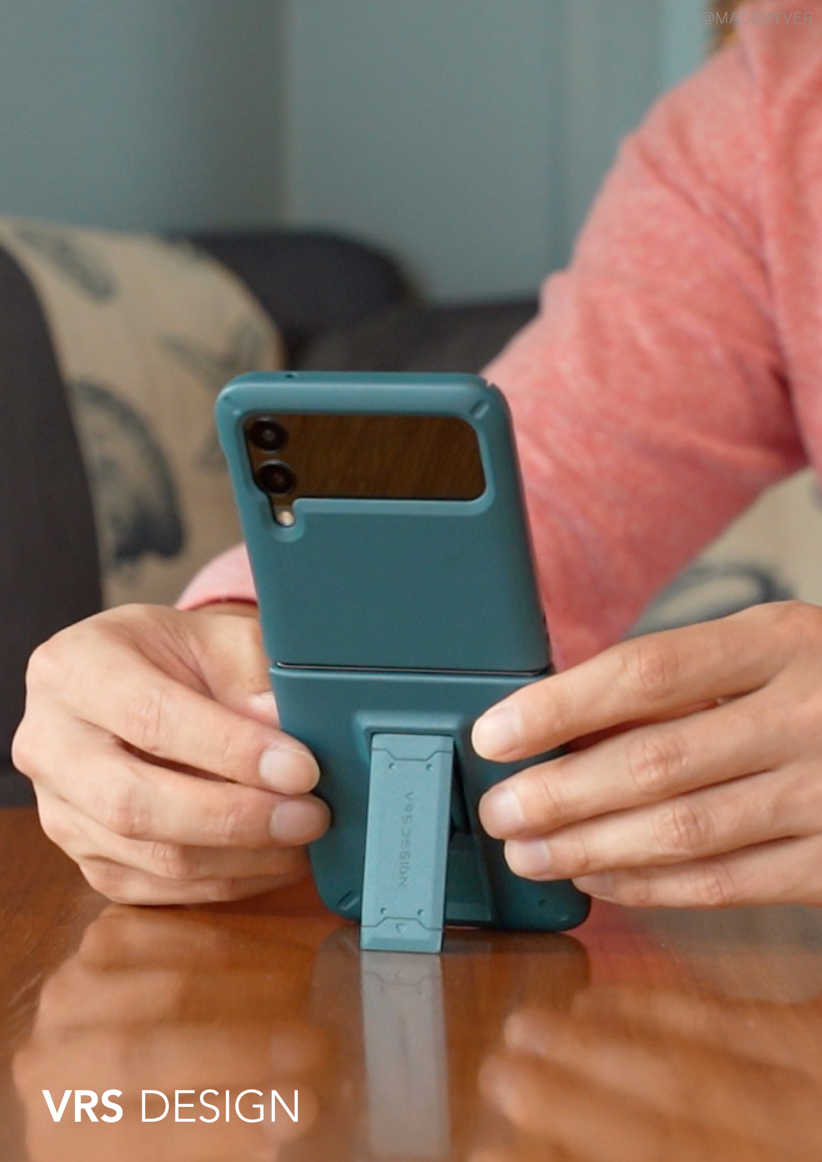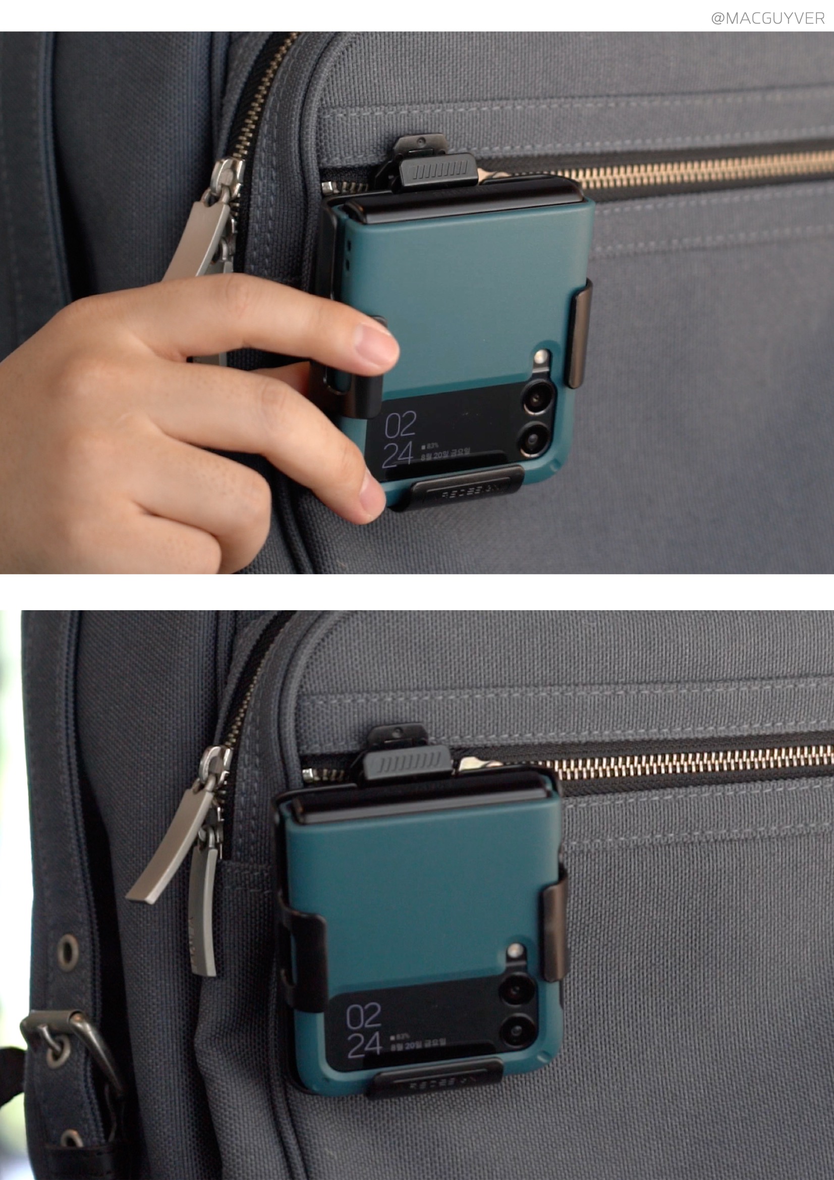 이어서 플립3 케이스 퀵스탠드 모던은 할인가 1만원 후반대로 매트 블랙, 그린, 화이트 컬러에 슬림하고 매끈해서 손맛이 좋은데요. 대신 퀵스탠드가 더 튀어나온 느낌입니다. 그래서인지 플립3 케이스를 테이블 위에 놓고 쓰기에는 덜컹거리기도 하더라고요. 화이트 컬러는 다른 물건에 오염이 잘 되는 아쉬움이 있더라고요. 하지만 지문이나 유분에 강하고 심플하고 단정한 느낌이 좋았습니다. 특히 Z플립3 케이스 그린 컬러는 갤플립3의 그린 컬러와 아주 잘 어울렸어요. 참고로 갤플립3는 베루스의 멀티 클립을 활용할 수 있는데요. 가방에 걸거나 이렇게 걸어두고 거치할 수 있는 거죠. 격한 운동이나 활동에 유용할 것 같은데 클립을 고정할 수도 있어서 자체 거치도 됩니다.