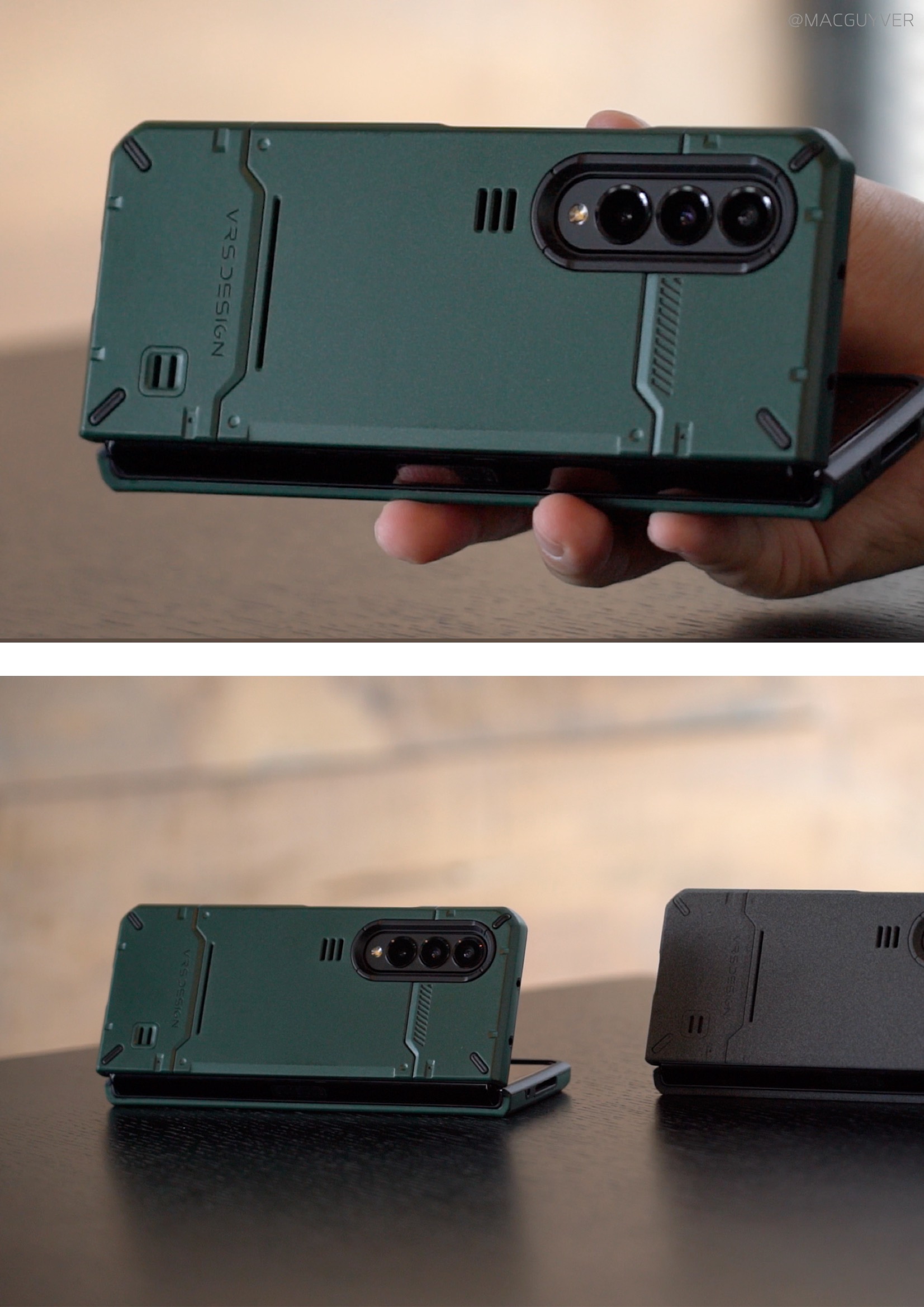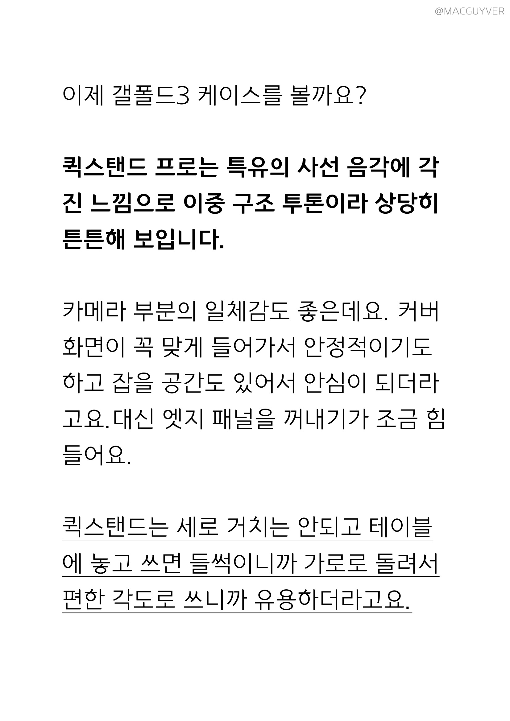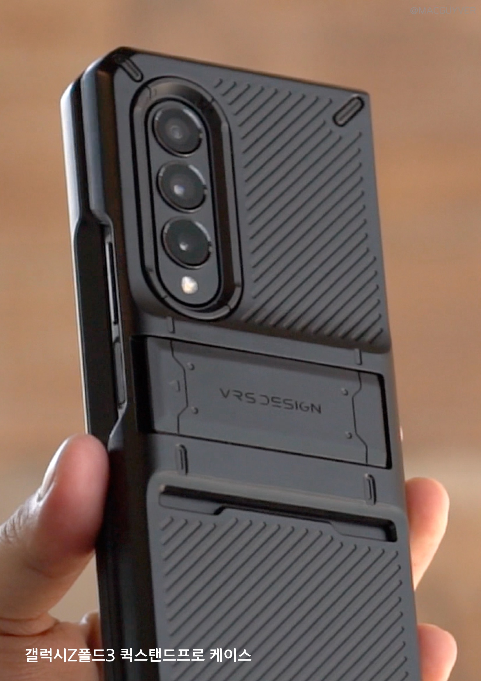 이제 갤폴드3 케이스, 갤럭시Z폴드3 케이스를 볼까요? Z폴드3 케이스 퀵스탠드 프로는 특유의 사선 음각에 각진 느낌으로 이중 구조 투톤이라 상당히 튼튼해 보입니다. 카메라 부분의 일체감도 좋은데요. 커버 화면이 꼭 맞게 들어가서 안정적이기도 하고 잡을 공간도 있어서 안심이 되더라고요. 대신 엣지 패널을 꺼내기가 조금 힘들어요. 갤럭시폴드3 케이스 퀵스탠드는 세로 거치는 안되고 테이블에 놓고 쓰면 들썩이니까 가로로 돌려서 편한 각도로 쓰니까 유용하더라고요. 펜을 쓰기에 편하기도 하고, 반대로 돌리면 영상을 보기에 편하기도 해요. 또 링은 아닌데 가볍게 링 효과를 내기도 해서 무게 분산이 됩니다. 구조가 달라서 갤플립 퀵스탠드 액티브 케이스처럼 힌지 보호는 안되는데요. 갤럭시Z폴드3 케이스 컬러가 다양하고 남성적인 느낌이라 취향 저격이거나 호불호가 있을 것 같아요. 저는 메탈 블랙도 세련된 것 같고 화이트가 오히려 메카닉해서 괜찮기도 하네요. 참고로 갤럭시폴드3 케이스 가격은 할인가 기준 3만원 후반대입니다. 마지막으로 하드드롭 프로 케이스인데요. 심플하면서도 메카닉한 느낌을 제대로 살렸어요. 카메라 부분 마감이나 음각 처리된 로고, 다양한 파티션이 과하지 않으면서 세련된 느낌인데요. 퀵스탠드가 제외된 대신 손맛이 좋고 일체감 있는 피팅감을 가졌더라고요. 그래서 테이블 위에서도 들썩이지 않고 편한 사용이 가능했어요. 별도의 거치대를 사용 중이거나 심플하면서 독창적인 느낌을 찾는 분들에게 알맞을 것 같기도 합니다. 가격은 3만원 중반대로 무난한 편이네요.