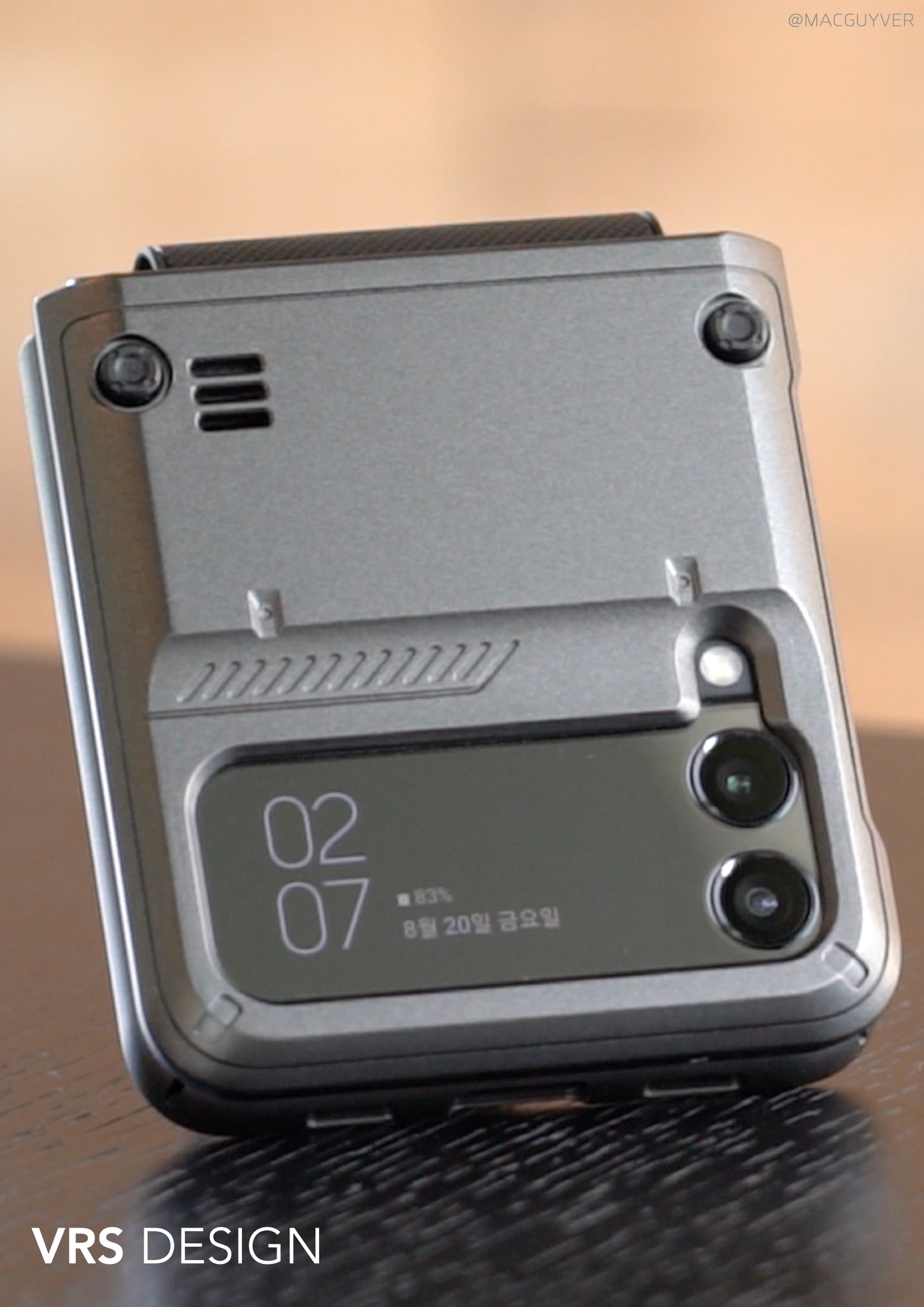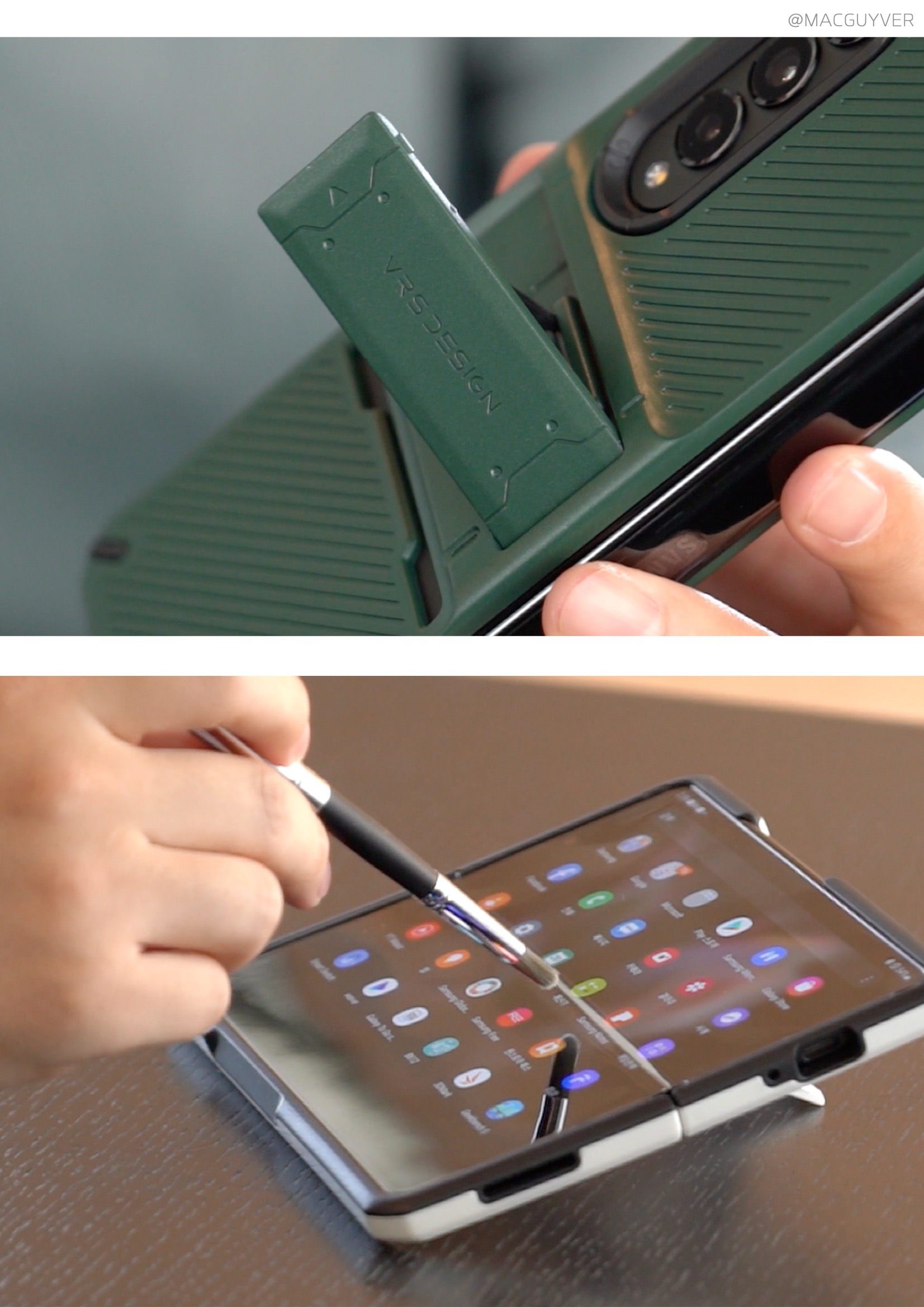 잠깐 Z폴드3 케이스, Z플립3 케이스 퀵스탠드를 살펴보면, 덜컹거리거나 튀어나오지 않았는데 흔들림 없는 고정을 위해 제법 뻑뻑하게 만들어져서 펼친 다음 당겨서 고정해 줘야 합니다. 장점은 가로, 세로 두 가지 각도로 세울 수 있다는 건데요. 갤플립3 커버 화면이 펼치기만 하면 내부로 AOD가 넘어가서 아쉬웠는데 퀵스탠드로 세우니까 보기에 알맞은 각도가 나옵니다. 물론 갤폴드3에도 퀵스탠드는 정말 유용하고 활용도가 높았어요. 특히 가격이나 무게감을 고려하자면 갤폴드가 부담스럽게 느껴질 수 있는데, 안정적인 느낌이 더해져서 만족스럽더라고요.