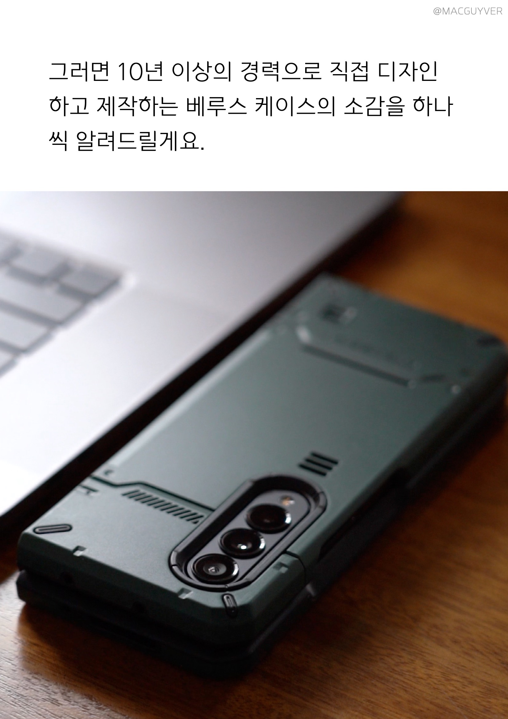 방수도 되고 S펜도 되지만 내구성이 고민이라면 베루스의 샌드스톤 케이스가 어떨까요? 눈으로 봐도 돌 같고, 만져봐도 돌 같은데 가벼우면서 1.2m 충격 테스트까지 통과한 베루스 케이스로 갤폴드3도 갤플립3도 보호할 수 있어요. 거기다 퀵스탠딩 모드로 세워둘 수도 있고요. 갤폴드3, 갤플립3를 샀거나 구매 예정이라면 5분께 베루스 갤럭시Z플립3 케이스, 갤럭시Z폴드3 케이스를 증정해드리는 이벤트에 참여해보세요. 또 5분에게는 11만원 상당의 노트북 백팩도 증정해드릴 예정입니다. 좀 더 빠르게 써보기를 원하시는 분들을 위해 맥가이버 단독 15% 추가 할인 쿠폰도 준비되어 있습니다. 그러면 10년 이상의 경력으로 직접 디자인하고 제작하는 베루스 케이스의 소감을 하나씩 알려드릴게요.