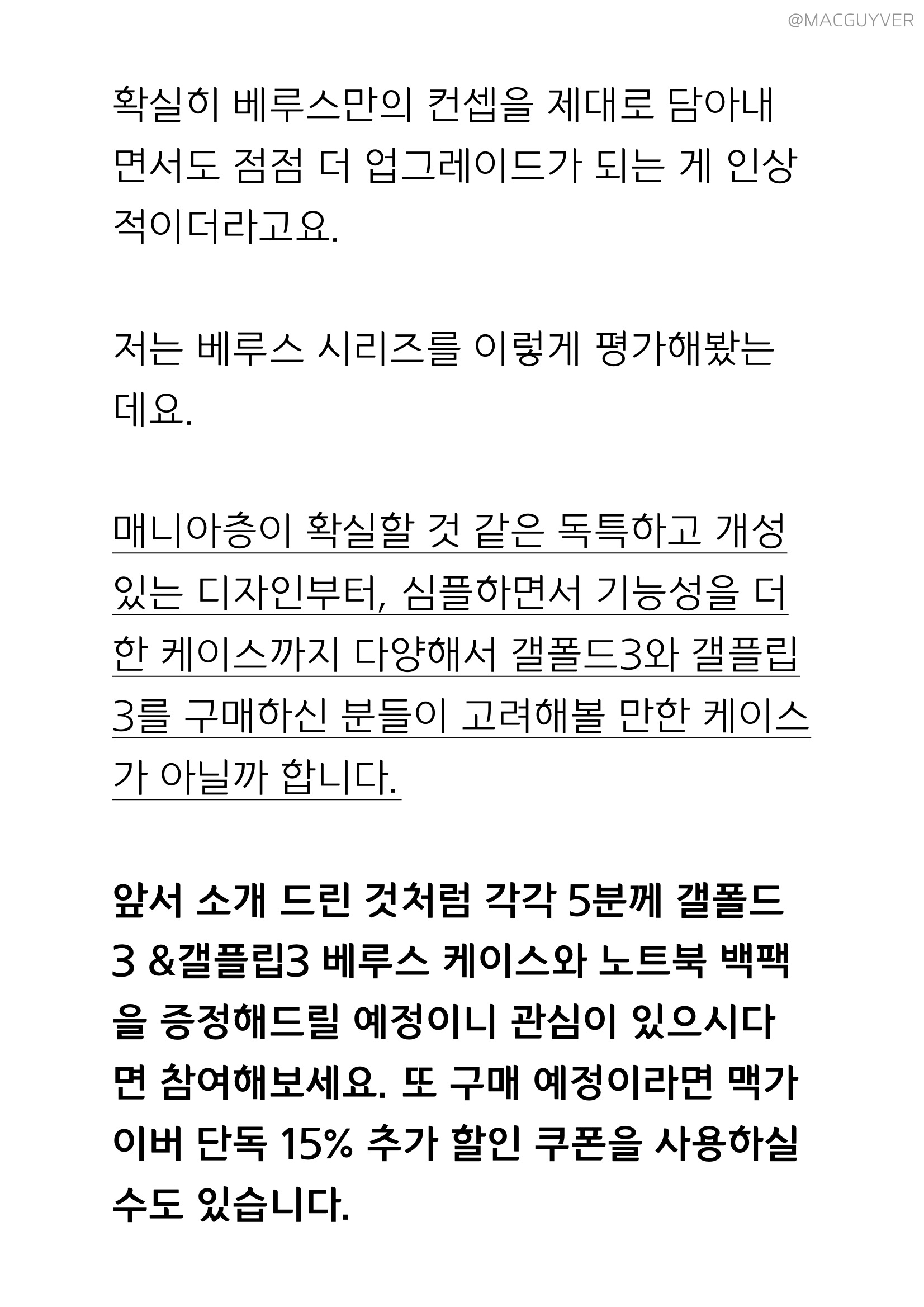 저는 갤럭시Z폴드3 케이스, 갤럭시Z플립3 케이스 베루스 시리즈를 이렇게 평가해봤는데요. 매니아층이 확실할 것 같은 독특하고 개성 있는 디자인부터, 심플하면서 기능성을 더한 폴드3 케이스, 플립3 케이스까지 다양해서 갤폴드3와 갤플립3를 구매하신 분들이 고려해볼 만한 케이스가 아닐까 합니다. 앞서 소개 드린 것처럼 각각 5분께 갤폴드3 &갤플립3 베루스 케이스와 노트북 백팩을 증정해드릴 예정이니 관심이 있으시다면 참여해보세요. 또 구매예정이라면 맥가이버 단독 15% 추가 할인 쿠폰을 사용하실 수도 있습니다.