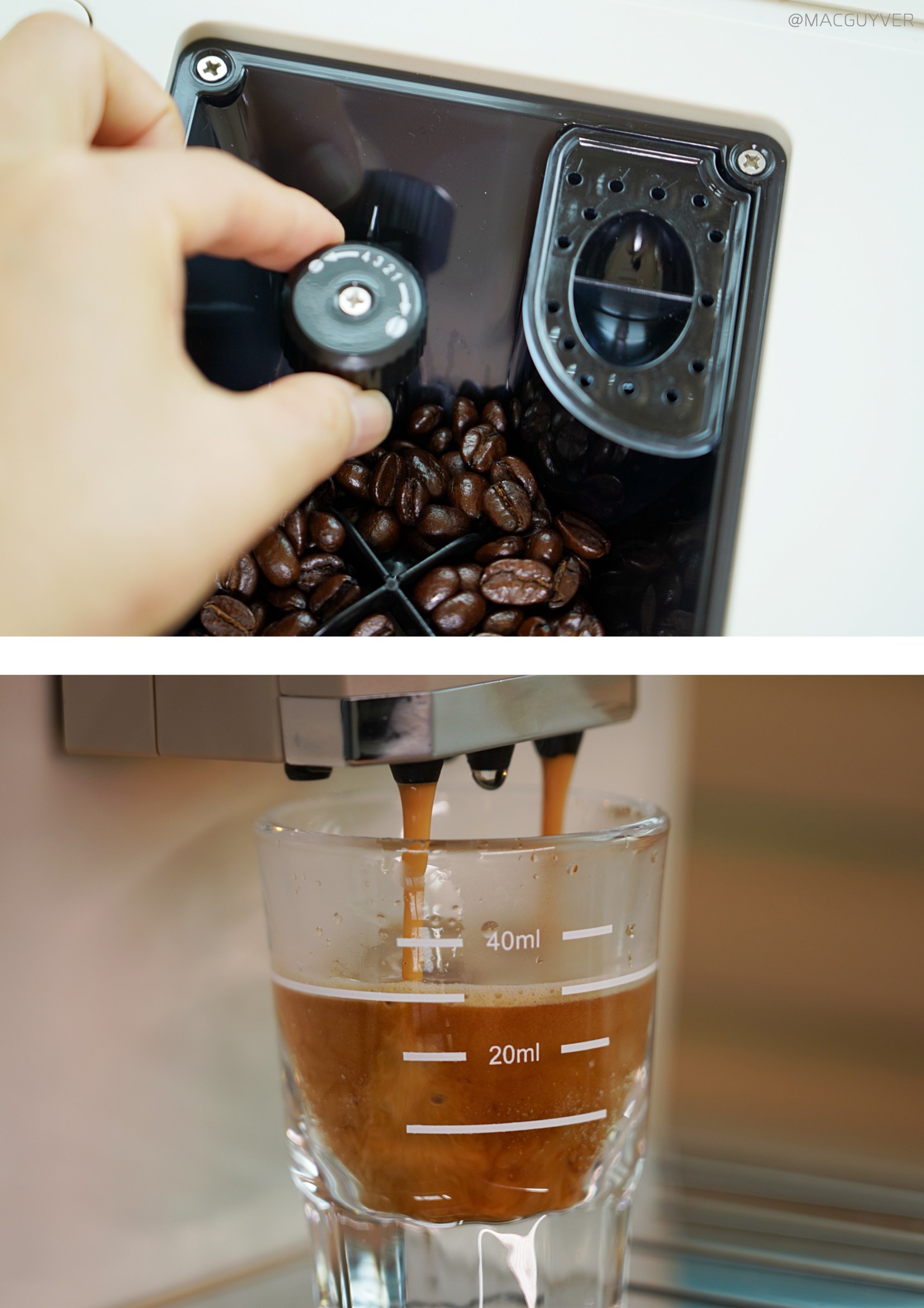 참고로 다양한 홈카페 원두를 즐기시는 분들이라면, 원두커피머신 원두 주입구에 원두를 너무 많이 채워두는 것보다 필요한 만큼만 넣어두고 새로운 원두를 넣는 게 좋은데요. 저도 종종 디카페인을 찾게 되는데, 다른 원두와 섞이지 않게 완벽하게 분리하기가 쉽지는 않아서 고민이 되기도 했거든요. 소음은 크기에 비해 캡슐 커피 머신과 비슷한 정도였는데요. 그라인더가 작동할 때는 어쩔 수 없이 원두커피머신의 분쇄하는 소리가 나더라고요. 하지만 기계음이나 원두를 추출할 때, 내부에서 다양한 동작을 할 때 소음이 나기는 하는데 거슬리지 않아서 밤이나 이른 아침에도 고민이 없었어요. 또 기본 설정으로는 언제든 커피 추출이 가능하도록 되어 있지만, 절전 설정에 따라 일정 시간이 지나면 자동 세척과 함께 전자동커피머신 대기 전력을 줄일 수 있더라고요. 참고로 처음 전원을 켜거나, 대기 모드를 해제하거나, 대기 모드로 들어갈 때 자동 세척한 물이 나오기 때문에 밀 컵을 놓아두는 것이 좋습니다.