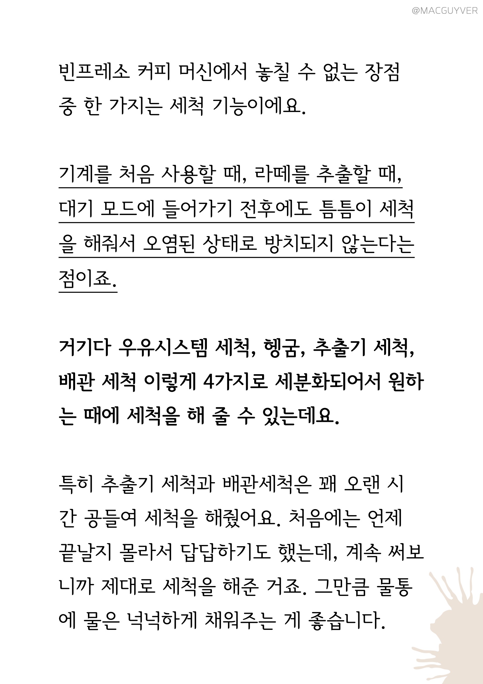 자동커피머신 빈프레소 커피 머신에서 놓칠 수 없는 장점 중 한 가지는 세척 기능이에요. 기계를 처음 사용할 때, 라떼를 추출할 때, 대기 모드에 들어가기 전후에도 틈틈이 세척을 해줘서 오염된 상태로 방치되지 않는다는 점이죠. 거기다 우유시스템 세척, 헹굼, 추출기 세척, 배관 세척 이렇게 4가지로 세분화되어서 원하는 때에 세척을 해 줄 수 있는데요. 특히 추출기 세척과 배관세척은 꽤 오랜 시간 공들여 세척을 해줬어요. 처음에는 언제 끝날지 몰라서 답답하기도 했는데, 계속 써보니까 제대로 세척을 해준 거죠. 그만큼 물통에 물은 넉넉하게 채워주는 게 좋습니다. 에스프레소커피머신을 사용하다 보면 곰팡이가 피지는 않을지, 이물질이 끼이지는 않을지 염려가 되는데, 빈프레소 커피머신은 자동세척 기능이 정말 꼼꼼해서 유지관리 측면에서 안심이 되더라고요. 특히 라떼를 자주 즐기시는 분들은 우유 잔여물이 남지 않을지 걱정이 되실 텐데, 빈프레소 커피 머신은 우유 추출 기능을 사용할 때마다 매번 세척을 해 주고, 직접 추출구를 따로 분리해서 세척도 가능하니까 라떼를 더 자주 마시게 돼 더라고요.