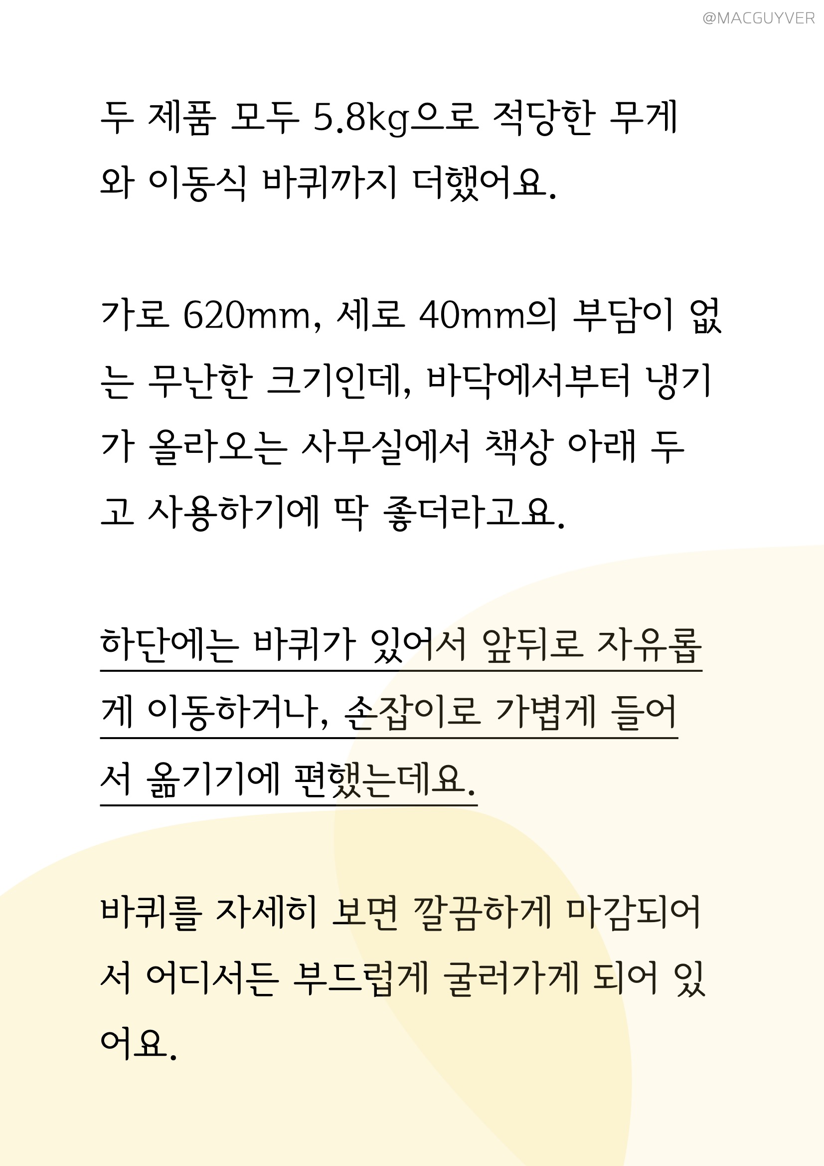 전기난방기 두 제품 모두 5.8kg으로 적당한 무게와 이동식 바퀴까지 더했어요. 가로 620mm, 세로 40mm의 부담이 없는 무난한 크기인데, 바닥에서부터 냉기가 올라오는 사무실에서 책상 아래 두고 사용하기에 딱 좋더라고요. 하단에는 바퀴가 있어서 앞뒤로 자유롭게 이동하거나, 손잡이로 가볍게 들어서 옮기기에 편했는데요. 바퀴를 자세히 보면 깔끔하게 마감되어서 어디서든 부드럽게 굴러가게 되어 있어요.