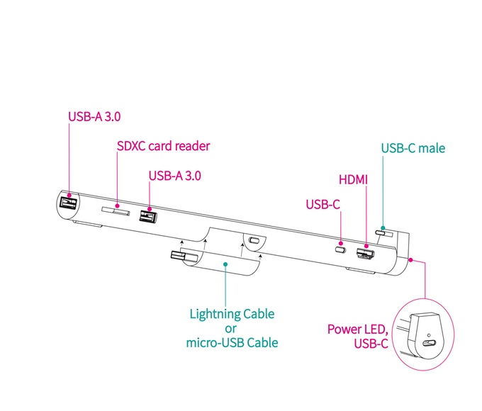 그렇다면 이 녀석이 제공하는 기능은 어떠한 것들이 있을까요? 우선적으로 USB-C X 2개, USB 3.0 X 2개, HDMI, SD카드 슬롯을 연결할 수 있습니다.