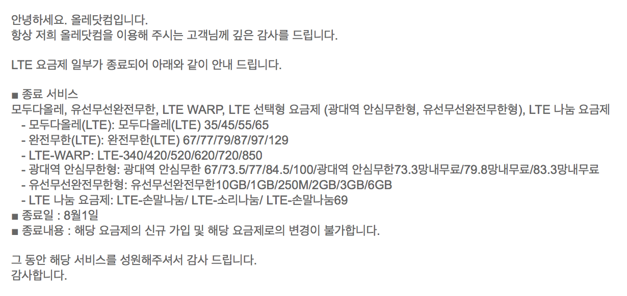 당장 모두다올레를 비롯해서 다양한 요금제들은 데이터가 더 많이 제공되거나, 음성 통화가 많거나 하는 식의 혜택이 있었는데 이제는 그렇지 않은 것이죠.