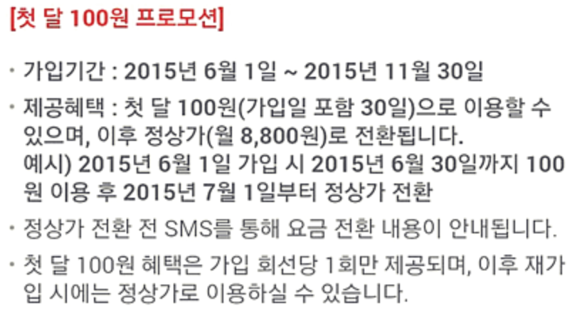 거기다 첫 달은 '100'원인 만큼, 저렴하게 이용해볼 수도 있습니다. 주의사항을 꼼꼼히 확인해서 여러가지 혜택을 누려보시기 바랍니다. |