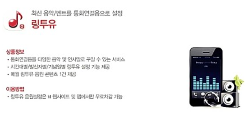 다른 서비스로는 링투유와 캐치콜이 있습니다. 링투유는 말 그대로 '상대방을 위한 연결음'으로서 누군가가 나에게 전화를 걸었을 때 연결음을 들려주는 것입니다.