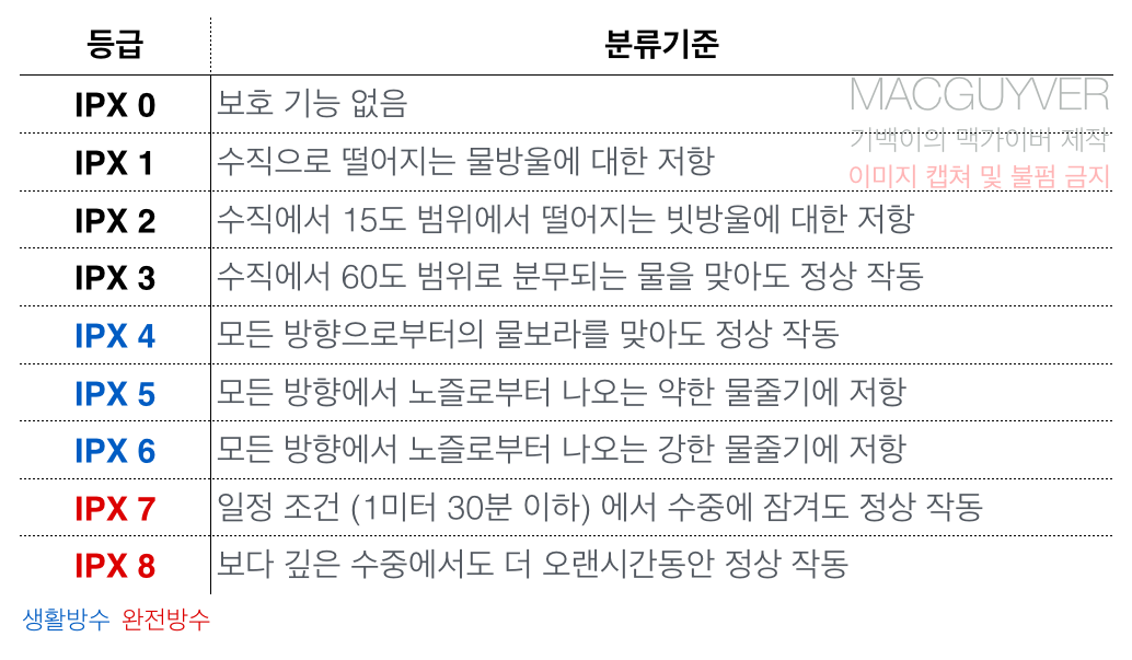 일반적으로 알려진 IPX의 경우는 방수 성능을 일컫는 것인데, 숫자가 높을 수록 좋습니다. 최고 성능은 IPX8인데요.