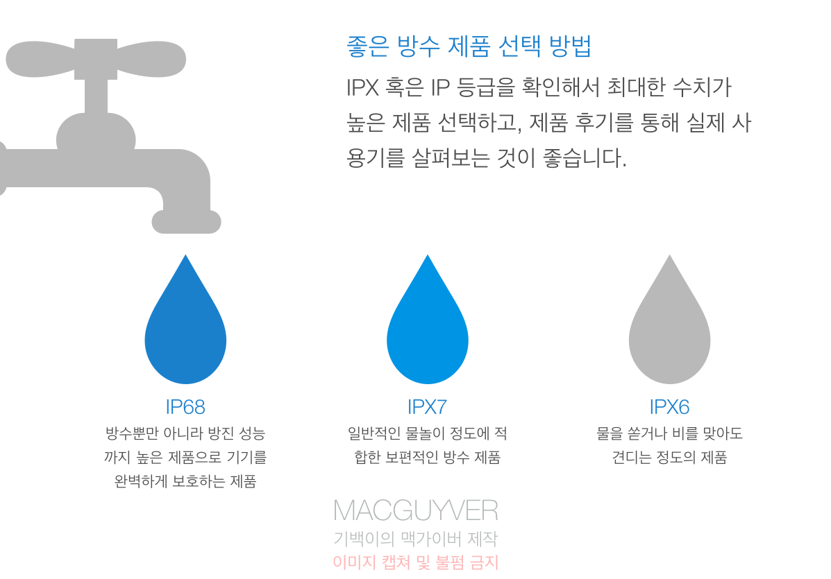 꼭 필요하다면 방수등급을 잘 확인해서 안전하게 사용해보세요. 이어지는 포스트를 통해서 상황별 좋은 방수제품을 알아보겠습니다. 구독하고 소식을 받아보세요.