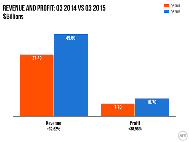 2014년 2분기와 비교를 해볼 때, 2015년 2분기 애플의 매출액은 무려 36.2%의 증가를 보여줬고, 영업이익은 그보다 큰 38.96%의 증가를 보였습니다.